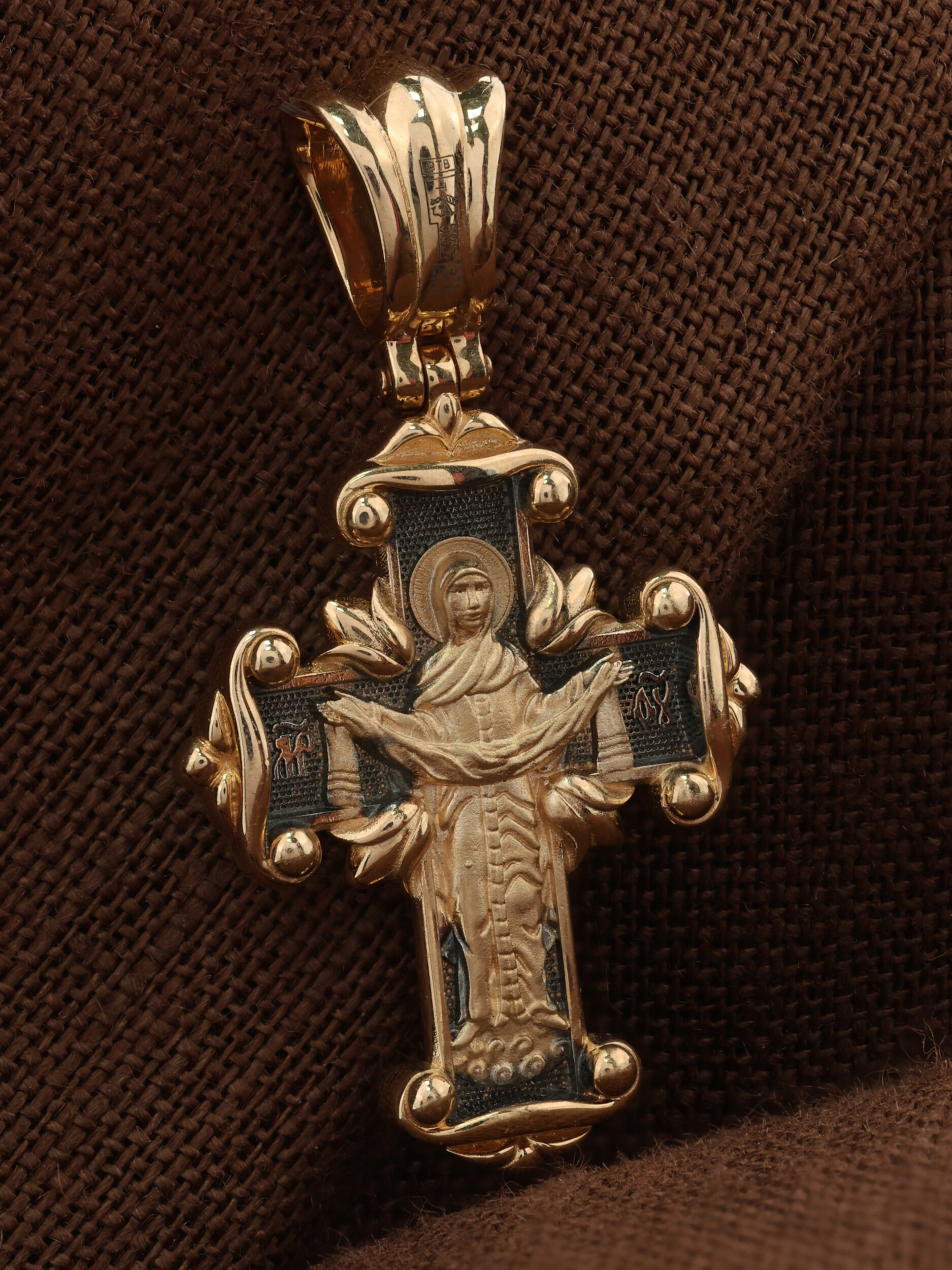 На оборотной стороне креста изображена икона Божией Матери «Покров Пресвятой Богородицы». Праздник Покрова Пресвятой Богородицы пришел на Русь в XII веке из Византии и стал одним из самых почитаемых. В 910 году Византийской Империи угрожали нападением сарацины. Не видя ниоткуда помощи, в те дни греки во множестве стекались в Константинополь, во Влахернский храм, в котором хранились риза Богоматери и Ее головной покров, и молились. 1 (14) октября 910 года Святому Андрею Юродивому и его ученику Епифанию было видение Покрова Божией Матери. Пресвятая Богородица, в окружении Святых, явилась над алтарем Храма и слезно молилась. По окончании молитвы сняла с Себя блистающее великое и страшное покрывало, которое носила на Пречистой главе Своей и, держа его с великой торжественностью, распростерла над всем стоящим народом. Вскоре враги без всякого кровопролития отступили от города. Богородица простирает Свой молитвенный покров над всеми православными христианами и умоляет Сына своего о даровании вечного спасения каждому человеку.