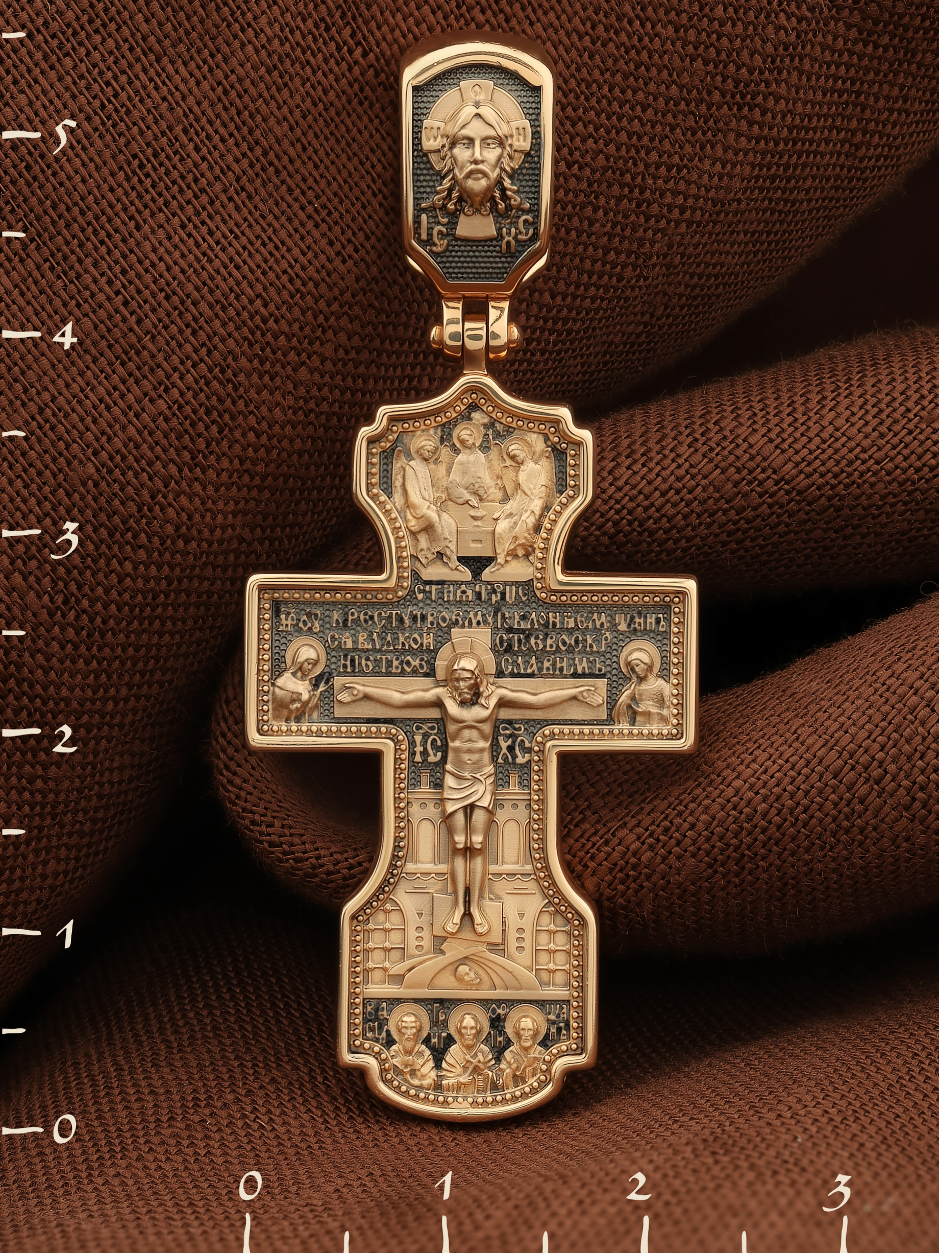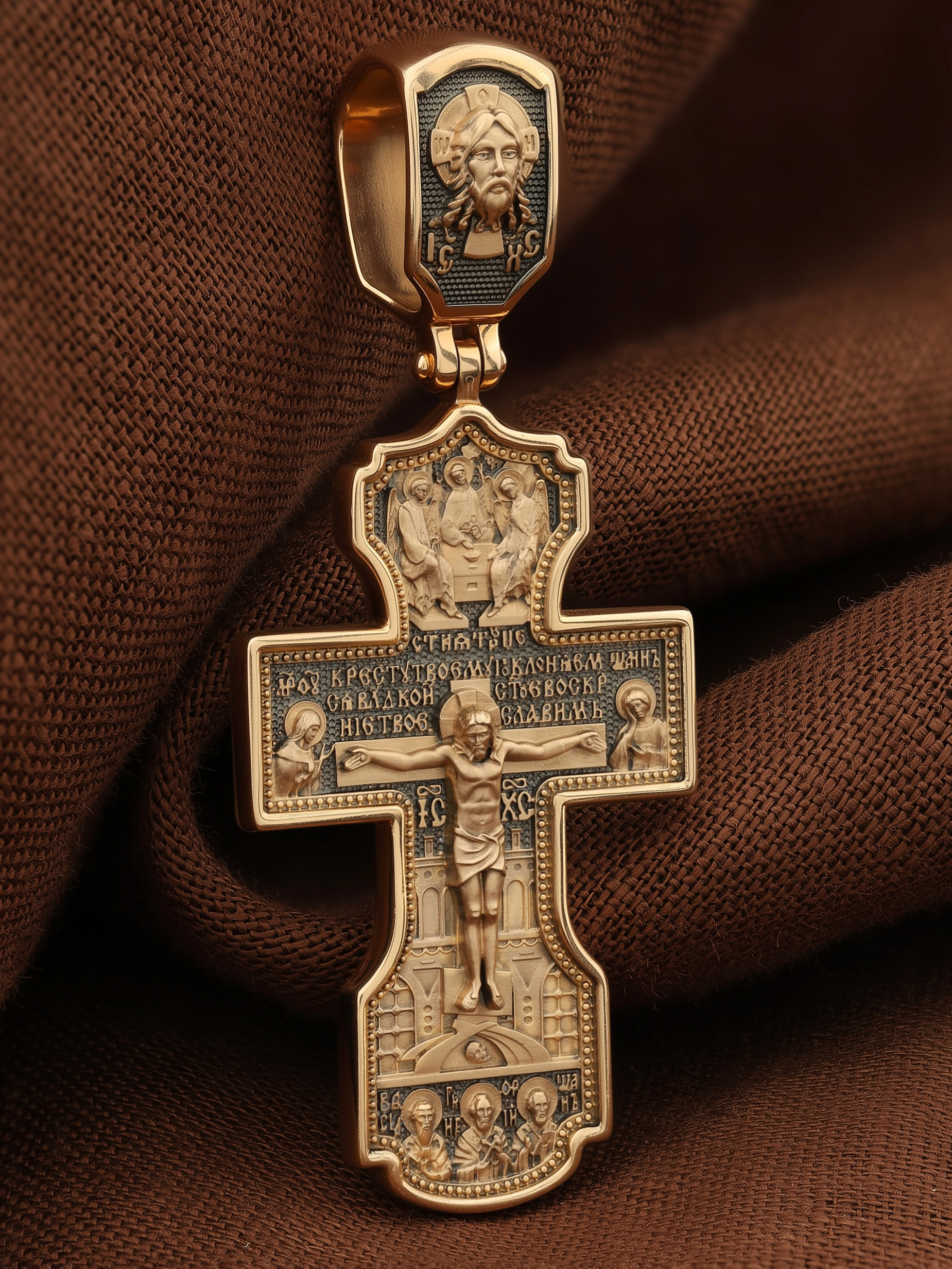 На лицевой стороне креста изображено Распятие Господа и Спасителя нашего Иисуса Христа, отдавшего Себя на смерть, для искупления грехов мира. Крест является символом жертвенной любви Всеблагого Бога к падшим людям, всепобеждающим духовным оружием христиан, основанием и средоточием церковной жизни. Господь сказал: «кто хочет идти за Мною, отвергнись себя, и возьми крест свой, и следуй за Мною». (Мк. 8: 34). Выше Распятия помещены слова молитвы:"Кресту Твоему поклоняемся, Владыко, и святое Воскресение Твое Славим». Над Распятием — образ Святой Троицы в виде трех ангелов. Надпись «IС» « ХС» означает Иисус Христос и находится ниже поперечной перекладины креста. Слева от Распятия изображена Пресвятая Богородица. Справа — апостол и евангелист Иоанн Богослов, один из ближайших учеников Иисуса Христа. За крестом высится Иерусалимская стена. Крест стоит на горе камней, символизирующих Голгофу. В ее основании различается череп — это голова Адама. Ниже распятия изображены отцы Церкви — Святители Василий Великий, Григорий Богослов и Иоанн Златоуст. На православном кресте Христос не умирает, а свободно простирает руки, ладони Иисуса открыты, будто он хочет обнять все человечество, даря им свою любовь и открывая путь к вечной жизни. На кулонном кольце изображен Нерукотворный образ Господа и Спасителя нашего Иисуса Христа, чудесно отпечатавшийся на плате, которым Христос вытер свой лик.