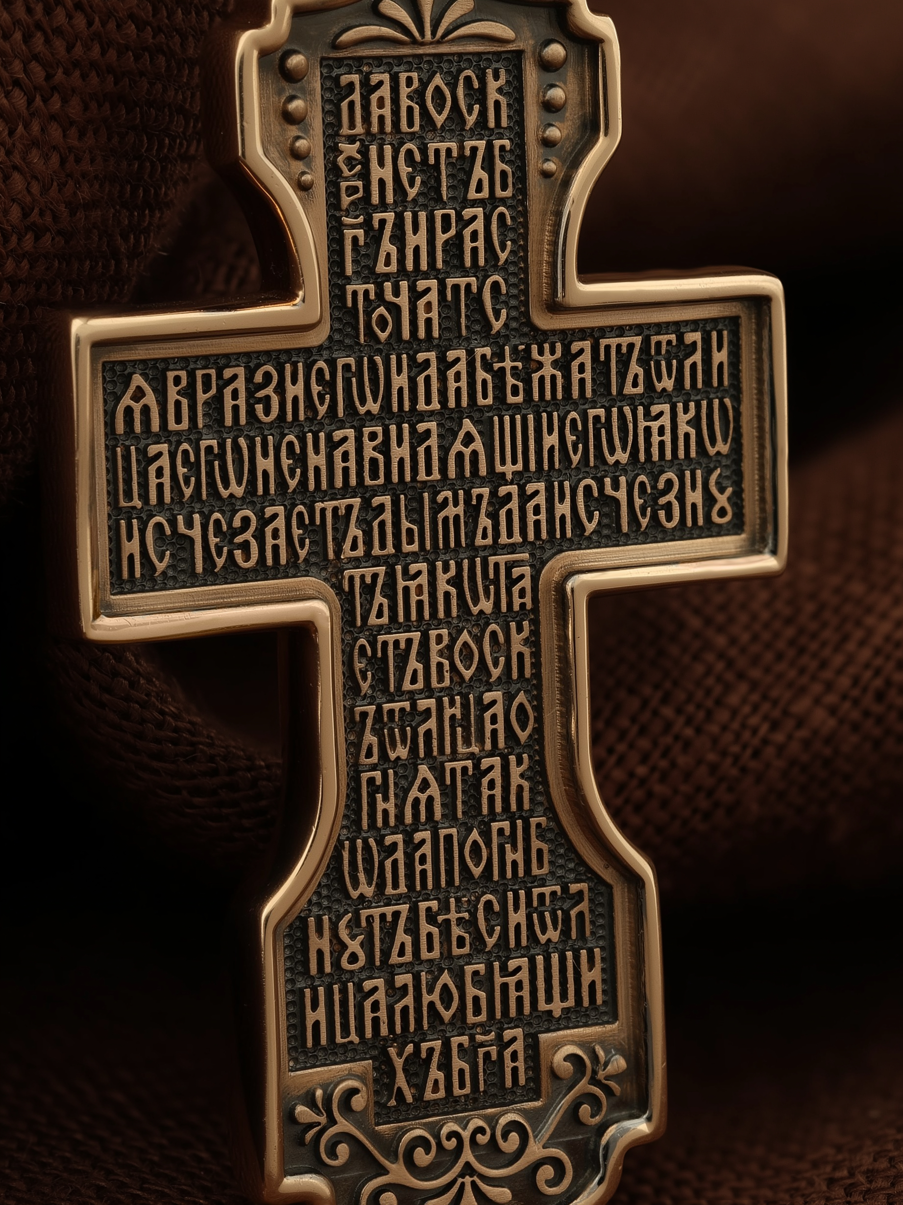 На оборотной стороне креста помещена молитва Честному Кресту Господню: «Да воскреснет Бог, и расточатся врази Его, и да бежат от лица Его ненавидящии Его. Яко исчезает дым, да исчезнут; яко тает воск от лица огня, тако да погибнут беси от лица любящих Бога…». На кулонном кольце изображен шестикрылый Серафим.