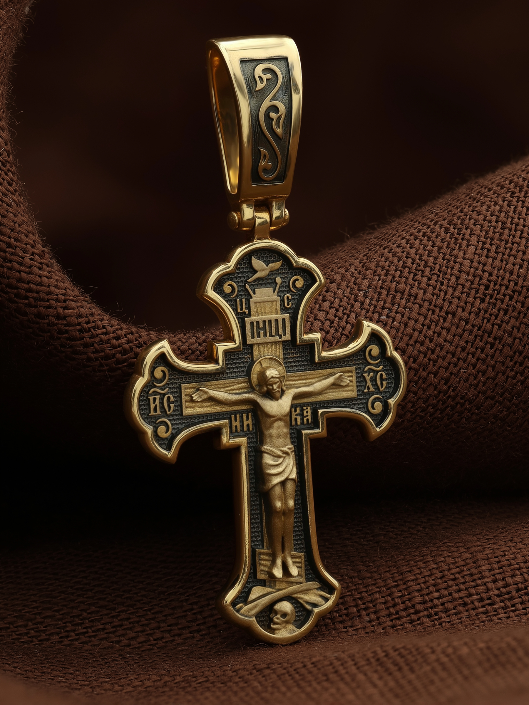 На лицевой стороне креста изображено Распятие, потому что это орудие казни Иисус Христос сделал орудием победы над грехом и смертью. Своими страданиями Он искупил грехи человечества, умерев и сошествовав во ад, победил сатану, освободил души праведников от вечной смерти и открыл им небесные врата рая. Жертва Христа сделала возможным спасение для каждого человека. На православном кресте Христос не умирает, а свободно простирает руки, ладони Иисуса открыты, будто он хочет обнять все человечество, даря им свою любовь и открывая путь к вечной жизни.