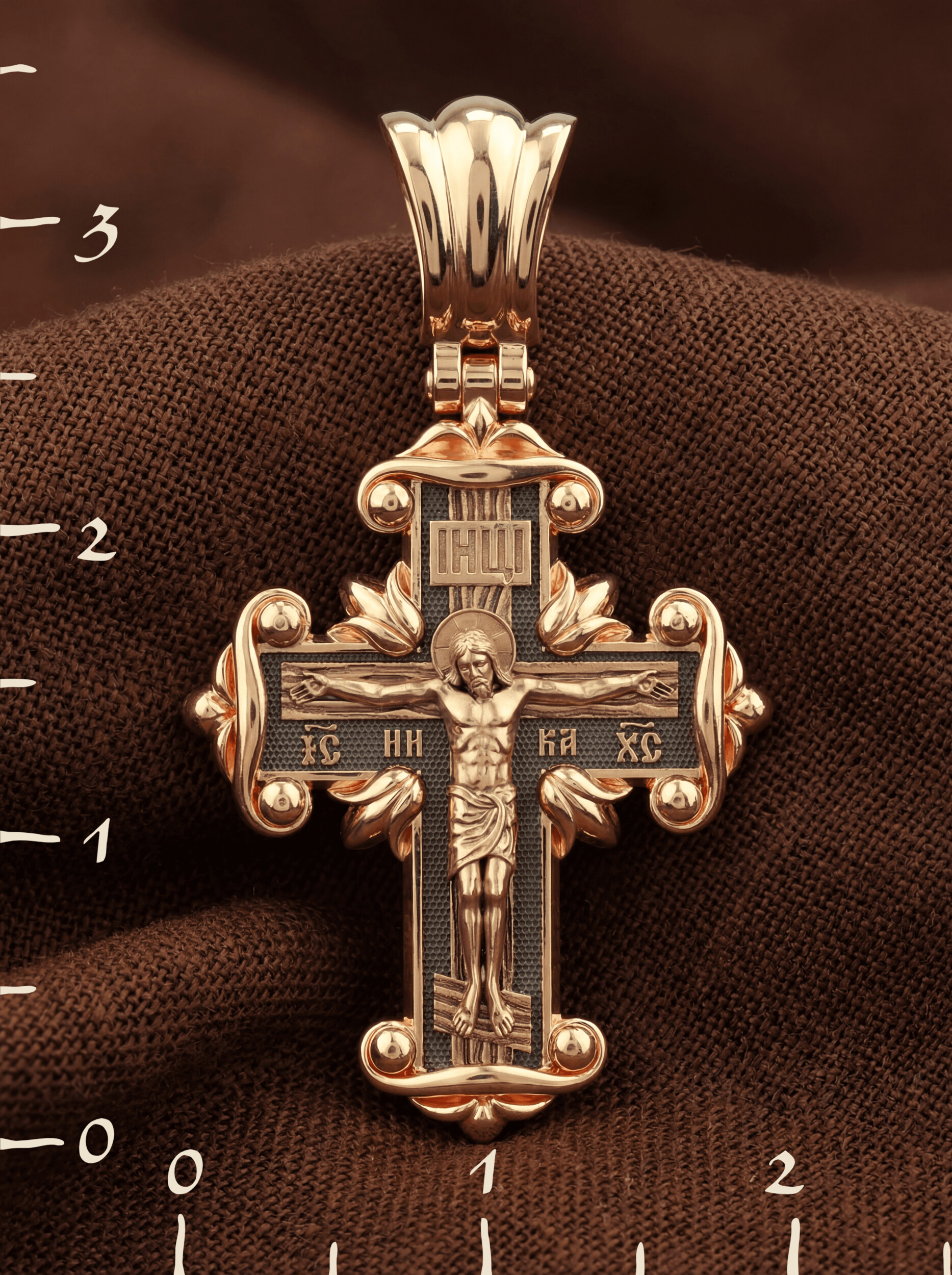 На лицевой стороне креста изображено Распятие Господа и Спасителя нашего Иисуса Христа, отдавшего Себя на смерть, для искупления грехов мира. Крест является символом жертвенной любви Всеблагого Бога к падшим людям, всепобеждающим духовным оружием христиан, основанием и средоточием церковной жизни. Господь сказал: кто хочет идти за Мною, отвергнись себя, и возьми крест свой, и следуй за Мною. (Мк. 8: 34). На верхней табличке, выше головы Иисуса, расположена надпись, составленная Понтием Пилатом — «IНЦI». Она означает «Иисус Назорей, Царь Иудейский». Надпись «IC» «ХC», означает Иисус Христос, помещается на разных сторонах поперечной перекладины креста. Рядом — слово «НИКА», что означает «победитель». На православном кресте Христос не умирает, а свободно простирает руки, ладони Иисуса открыты, будто он хочет обнять все человечество, даря им свою любовь и открывая путь к вечной жизни.