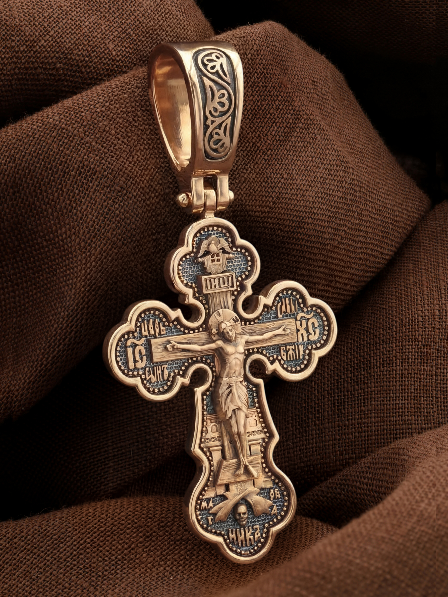 На лицевой стороне креста изображено Распятие Господа и Спасителя нашего Иисуса Христа. Христос, подвергнутый на кресте мучительной казни, своими страданиями искупил нас от древнего греха и даровал нам жизнь вечную. На верхней табличке, выше головы Иисуса, расположена надпись, составленная Понтием Пилатом — «IНЦI». Она означает «Иисус Назорей, Царь Иудейский». Распятие сопровождается каноническими надписями. Надпись «IС ХС» означает Иисус Христос, надпись «Царь Славы» и словосочетание «СЫН БОЖИЙ», что означает божественную природу Иисуса Христа, помещаются на разных сторонах поперечной перекладины креста. В нижней части креста находятся надписи –«НИКА» и «МЛРБ». В переводе с греческого, слово «НИКА» означает «победитель». Именно оно является символом победы Христа над смертью. Надпись «МЛРБ» — «место лобное рай бысть» означает, что место лобное стало раем. Крест стоит на горе камней, символизирующих Голгофу. Под подножием Креста изображена покоящаяся голова (череп) Адама и надпись «Г.А.». Христос в Своей Божественной любви, над которой смерть не властна и которая, страдая, и не страдает в обычном смысле, простирает к людям со Креста Свои объятия, в которые призывается и привлекается весь мир. Поэтому Тело Его не висит, а торжественно покоится на Кресте.
