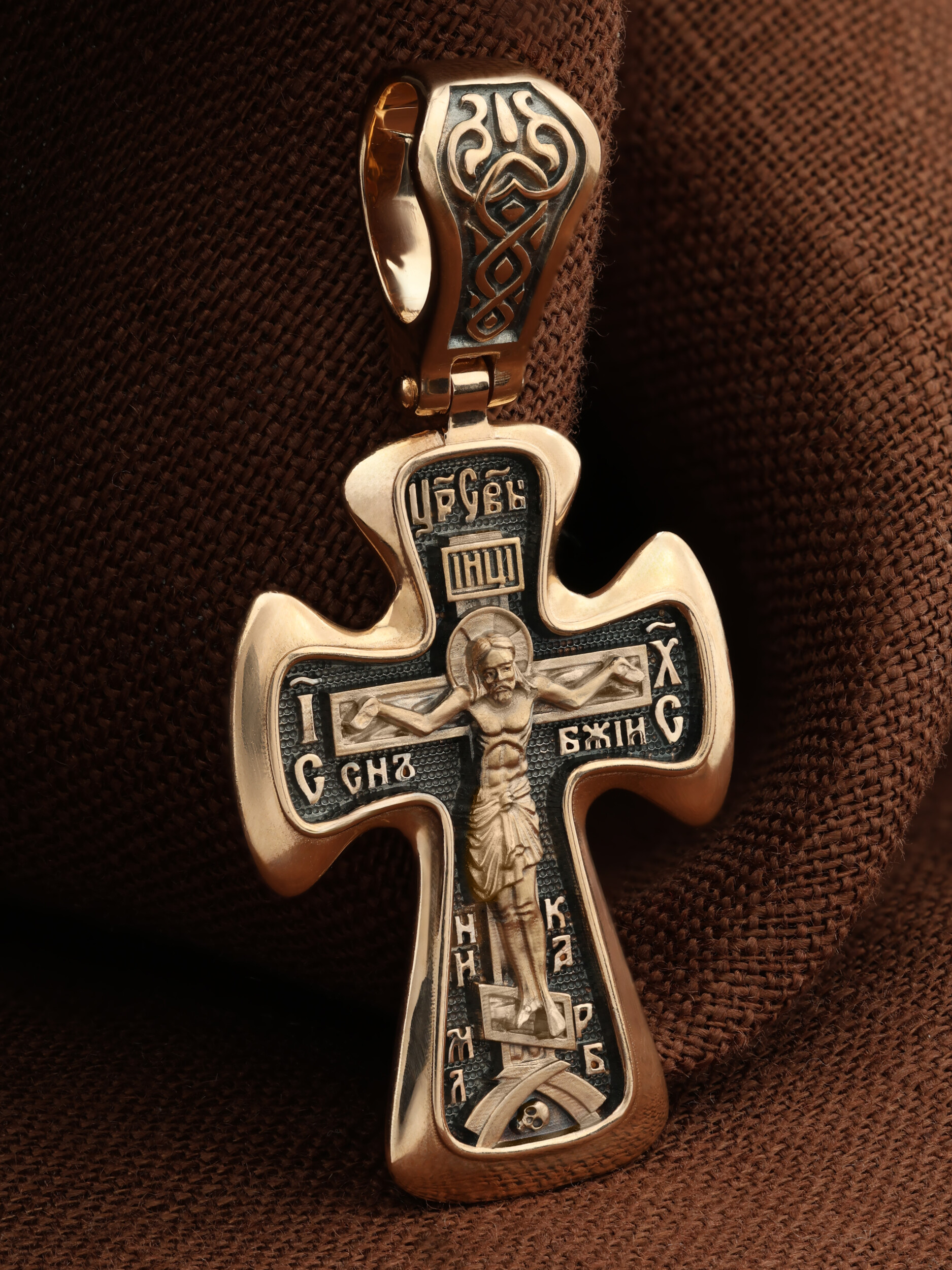На лицевой стороне креста изображено Распятие Иисуса Христа. Господь представлен свободно покоящимся на кресте с простертыми руками и как бы обнимающим всю Вселенную. Он — Спаситель, искупивший грехи мира, «поправший смертию смерть» и призывающий к Себе «все концы земли». Поэтому рядом с Его образом помещены слова — «НИКА» и «Царь Славы». Эти слова характеризуют Господа как Великого Архиерея, победителя смерти. Также Распятие сопровождается надписями, олицетворяющими Христа. Это святое имя Христа «IC» (Иисус) «ХС» (Христос), и словосочетание «СЫН БОЖИЙ».