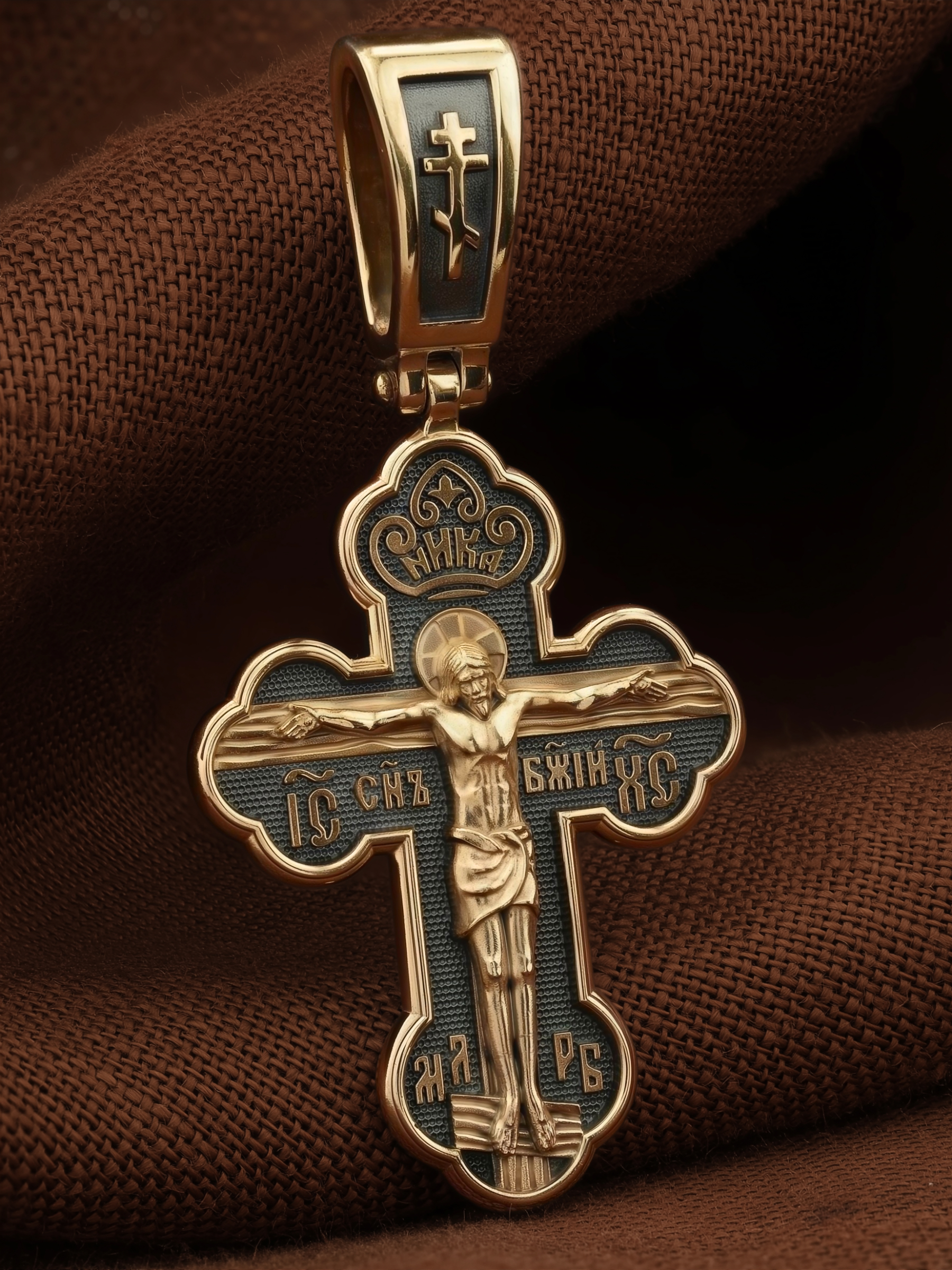 Крест нательный четырехконечный с трехлепестковыми завершениями перекладин. Основой композиции лицевой стороны креста является Распятие Иисуса Христа. С обеих сторон горизонтальной перекладины надписи — монограмма святого имени Христа — «ИС ХС», а под ней «Сын Божий». Над головой Христа надпись — «НИКА» (Победитель). В подножии мы видим изображенную гору Голгофу в виде скалистой горки, а так же буквы «МЛ» «РБ», которые означают: «Место Лобное Рай Бысть». Крест, на котором Спаситель мира принес Искупительную жертву, открыл врата рая, затворившиеся после грехопадения Адама. Поэтому Лобное место (Голгофа) стало раем.