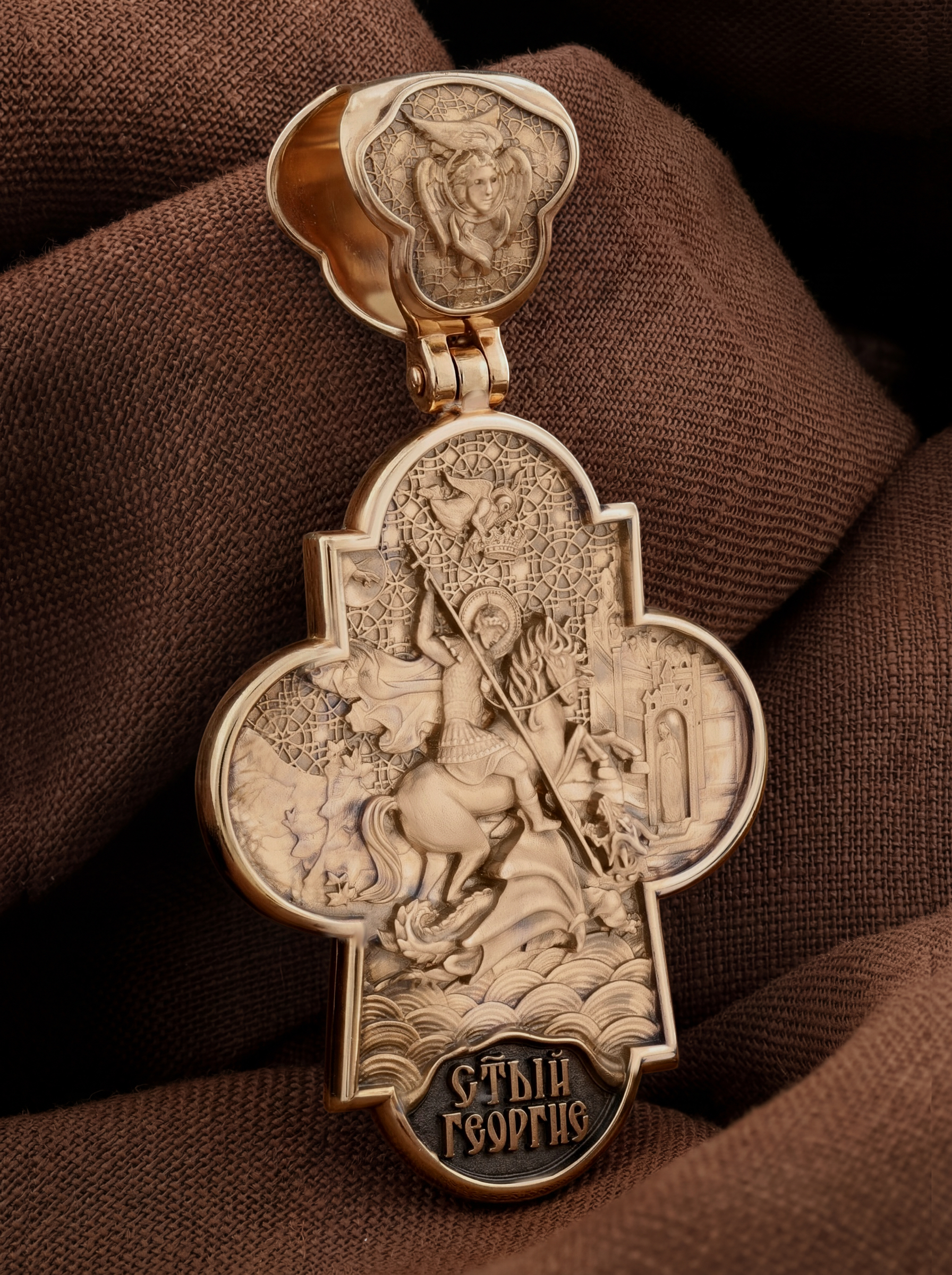 На оборотной стороне креста помещено изображение Святого Великомученика Георгия Победоносца — одного из самых почитаемых и удивительных святых. Георгий родился в Каппадокии (Малая Азия) в семье богатых и знатных горожан. Юношей поступил на службу к римскому императору Диоклетиану, за отличное знание военного дела и проявленную в боях и походах храбрость был приближен к императору и удостоен высокого воинского звания. Во время начавшихся гонений на христиан, перешел на сторону гонимых и, отвергнув человеческий страх, стал ярым проповедником учения Христа. Мучители подвергли опального воеводу жесточайшим восьмидневным пыткам и казнили его (обезглавили) в возрасте около тридцати лет в 303 году. Георгий изображен как воитель, сидящий на вздыбленном коне и поражающий копьем огнедышащего змея. Слева над образом изображена благословляющая Божия десница. Над святым изображен ангел возлагающий на него венец мученика. Змей символизирует собою сатанинские силы. Молитвами вознесенными к Всевышнему и своей непреклонной верой он смог одолеть чудовище. Святой убил змея, спас царскую дочь, принесенную в жертву, и жителей города, их души от влияния дьявола, породив в них надежду и веру в Господа, призывая людей принять христианскую веру. На кулонном кольце изображен шестикрылый Ангел — Серафим.