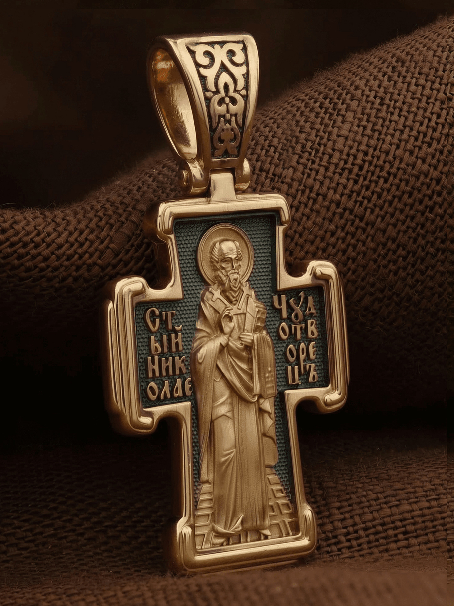 На оборотной стороне креста изображен святитель Николай архиепископ Мир Ликийских, Чудотворец. Он является одним из самых почитаемых святых в православном мире. Святитель Николай родился во второй половине III века в Малой Азии в Ликийском городе Патары. С рождения Божий Угодник проявлял необыкновенные дарования. Сохранилось Предание, что во время крещения он, никем не поддерживаемый, простоял в купели три часа. С детства святитель избегал пустых развлечений, любил молитву, прекрасно учился и проводил свободное время за чтением Священного писания. Приняв сан священника, святитель Николай стал проводить еще более строгую подвижническую жизнь. Вся жизнь святого Николая — это служение Богу. Много великих и преславных чудес сотворил на земле и на море великий Святитель Николай Угодник. Он помогал сущим в бедах, укрощал штормы, спасал от потопления и выносил на сушу из глубины морской, освобождал из плена и приносил освобожденных домой, избавлял от уз и темницы, защищал от посечения мечом, освобождал от смерти и подавал многим различные исцеления, слепым прозрение, хромым хождение, глухим слух, немым дар слова.