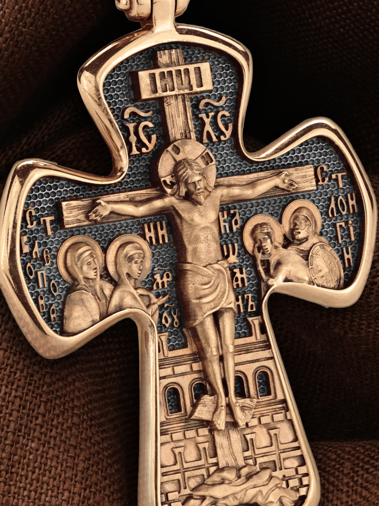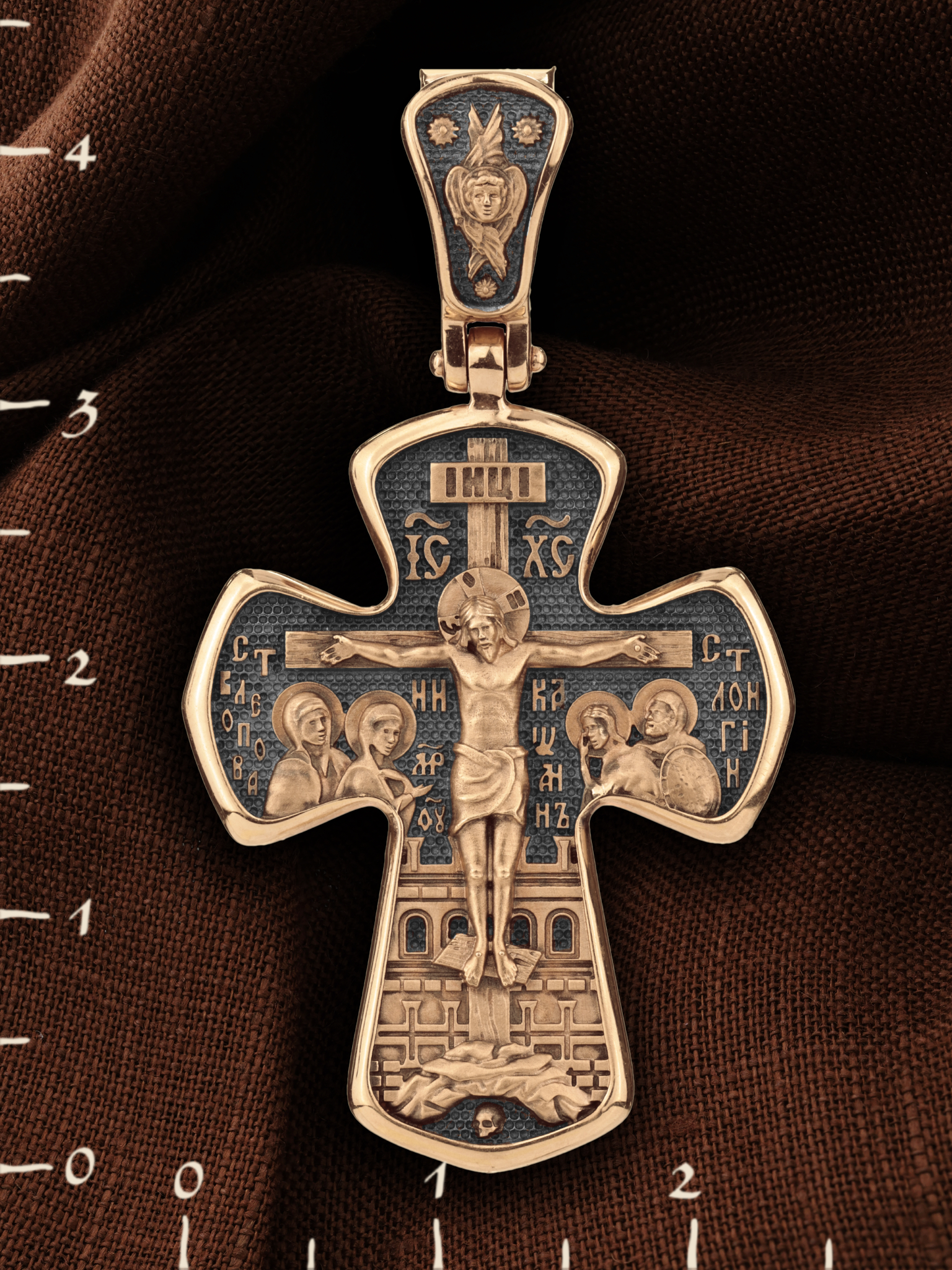 На лицевой стороне креста изображено Распятие Господа и Спасителя нашего Иисуса Христа, отдавшего Себя на смерть, для искупления грехов мира. Господь сказал: кто хочет идти за Мною, отвергнись себя, и возьми крест свой, и следуй за Мною. (Мк. 8: 34). Крест является символом жертвенной любви всеблагого Бога к падшим людям, всепобеждающим духовным оружием христиан, основанием и средоточием церковной жизни. На верхней перекладине помещена надпись «IС» « ХС», что означает Иисус Христос. Ниже — слово «НИКА», что означает «победитель». Слева от Распятия изображена Пресвятая Богородица, справа — апостол и евангелист Иоанн Богослов, один из ближайших учеников Иисуса Христа. За Распятием высится Иерусалимская стена, в знак того, что Господь был распят вне стен города. Возвышение, на котором стоит Крест, символизирует гору Голгофу, на которой произошло Распятие. Под подножием Креста изображена покоящаяся голова (череп) Адама. На кулонном кольце помещен крест.