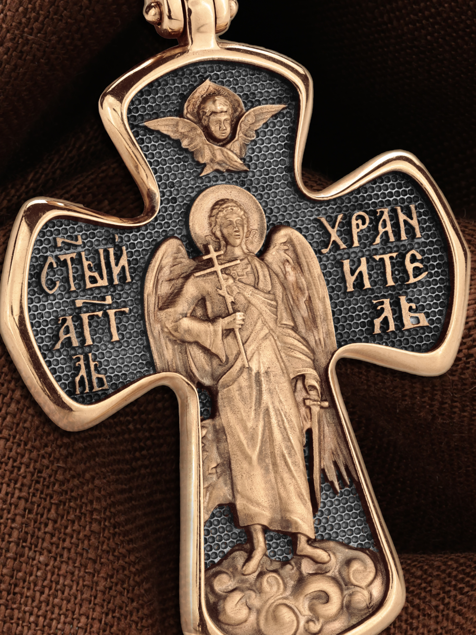 На оборотной стороне креста изображен Святой Ангел-Хранитель держащего в правой руке крест, а в левой — мечь. Ангел-Хранитель — это Ангел приставляемый Богом к человеку при крещении для охраны и помощи в добрых делах. Он невидимо находится при человеке на протяжении всей его жизни, если человек сохраняет в себе любовь к Богу и истинную веру перед Ним. Ангел-Xранитель делают для нас все, что служит к истинному нашему благу и спасению. Невидимо пребывая при нас постоянно, он, руководствуя нас ко спасению, не только по нашему желанию таинственно наставляет нас на все доброе и полезное, не только возносит наши молитвы к Богу, но еще и сам от себя охраняют и защищают нас от врагов видимых и невидимых и ходатайствует за нас пред Богом. Одного лишь каждому из нас он желает — спасения души; к этому он направляет все свои заботы. Над образом помещен Серафим.