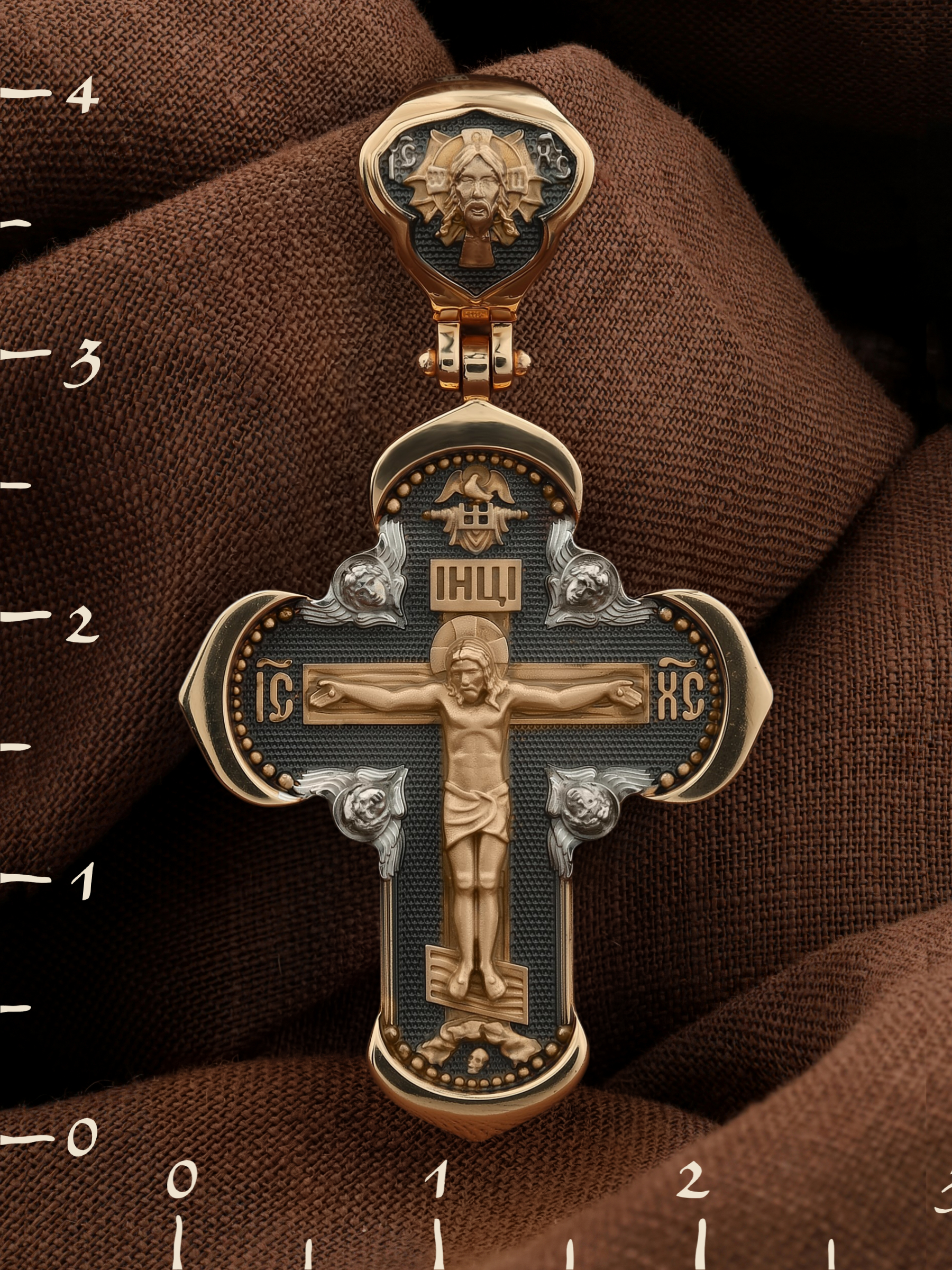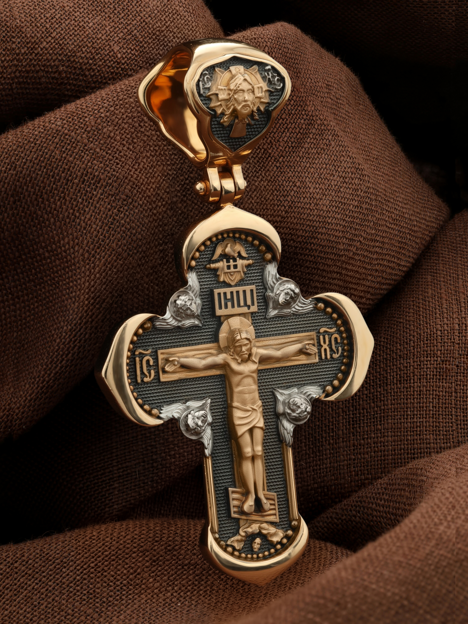 На лицевой стороне креста изображено Распятие Господа и Спасителя нашего Иисуса Христа, отдавшего Себя на смерть, для искупления грехов мира. Крест является символом жертвенной любви Всеблагого Бога к падшим людям, всепобеждающим духовным оружием христиан, основанием и средоточием церковной жизни. Господь сказал: «кто хочет идти за Мною, отвергнись себя, и возьми крест свой, и следуй за Мною». (Мк. 8: 34). На верхней табличке, выше головы Иисуса, расположена надпись, составленная Понтием Пилатом — «IНЦI». Она означает «Иисус Назорей, Царь Иудейский». Надпись «IC» «ХC», означает Иисус Христос, помещается на разных сторонах поперечной перекладины креста. Крест стоит на горе камней, символизирующих Голгофу. В ее основании различается череп– это голова Адама. На кулонном кольце изображен Нерукотворный образ Господа и Спасителя нашего Иисуса Христа, чудесно отпечатавшийся на плате, которым Христос вытер свой лик.