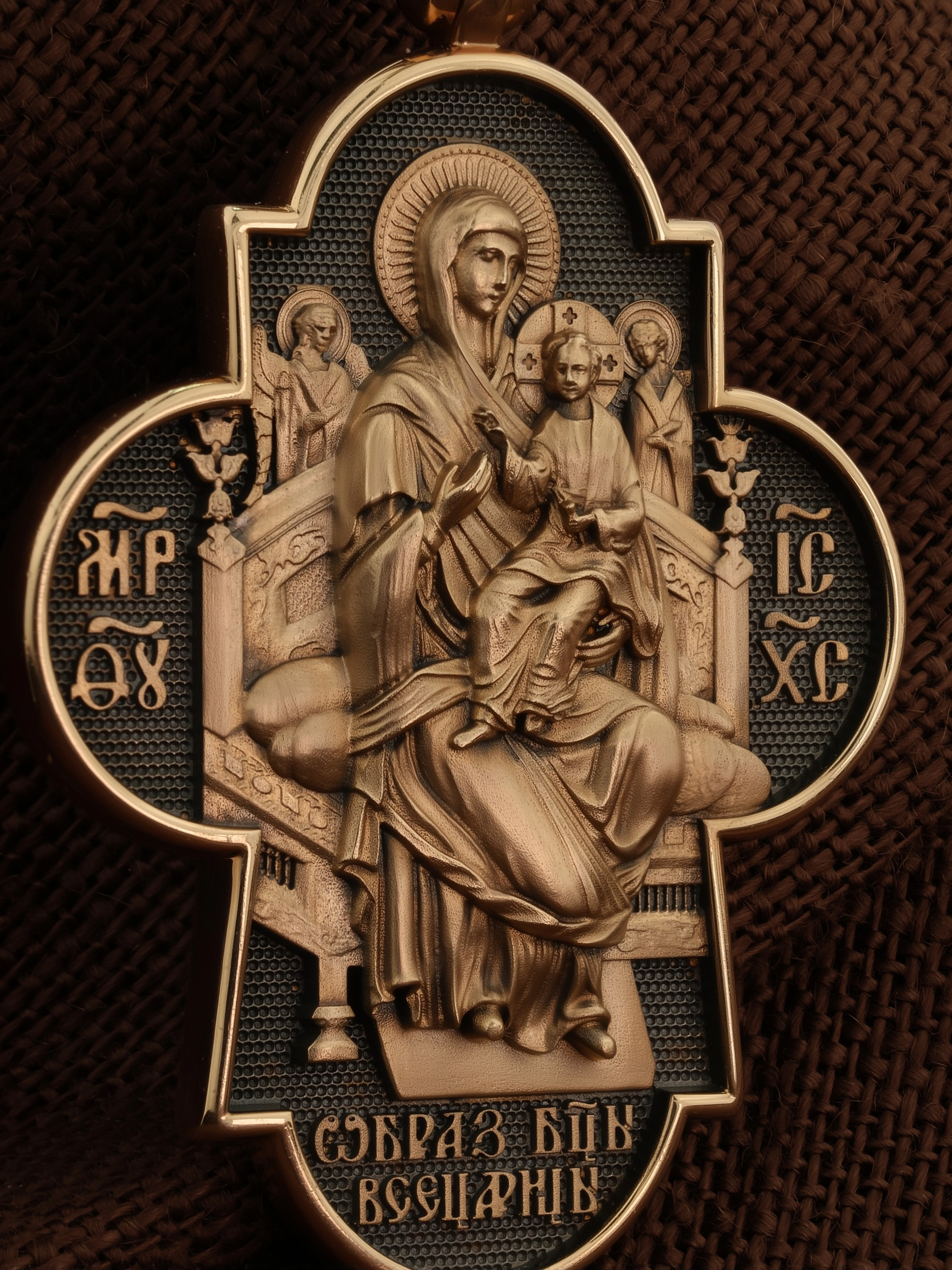 На оборотной стороне креста изображена икона Божией Матери «Всецарица» или «Пантанасса», на которой Пресвятая Богородица восседает на царском троне. На руках Ее — Богомладенец Христос со свитком в левой руке и благословляющий десницей. Правой рукой Богородица указывает на Своего Царственного Сына, как на Спасителя мира. Чудотворная икона была написана в XVII веке и находится на Святой Горе Афон, в одном из древних греческих монастырей — Ватопеде. По молитвам перед иконой совершается множество чудесных исцелений. Пречистая Богородица наставляет на праведный путь, помогает укрепить веру, найти утешение. На кулонном кольце изображен шестикрылый Серафим.