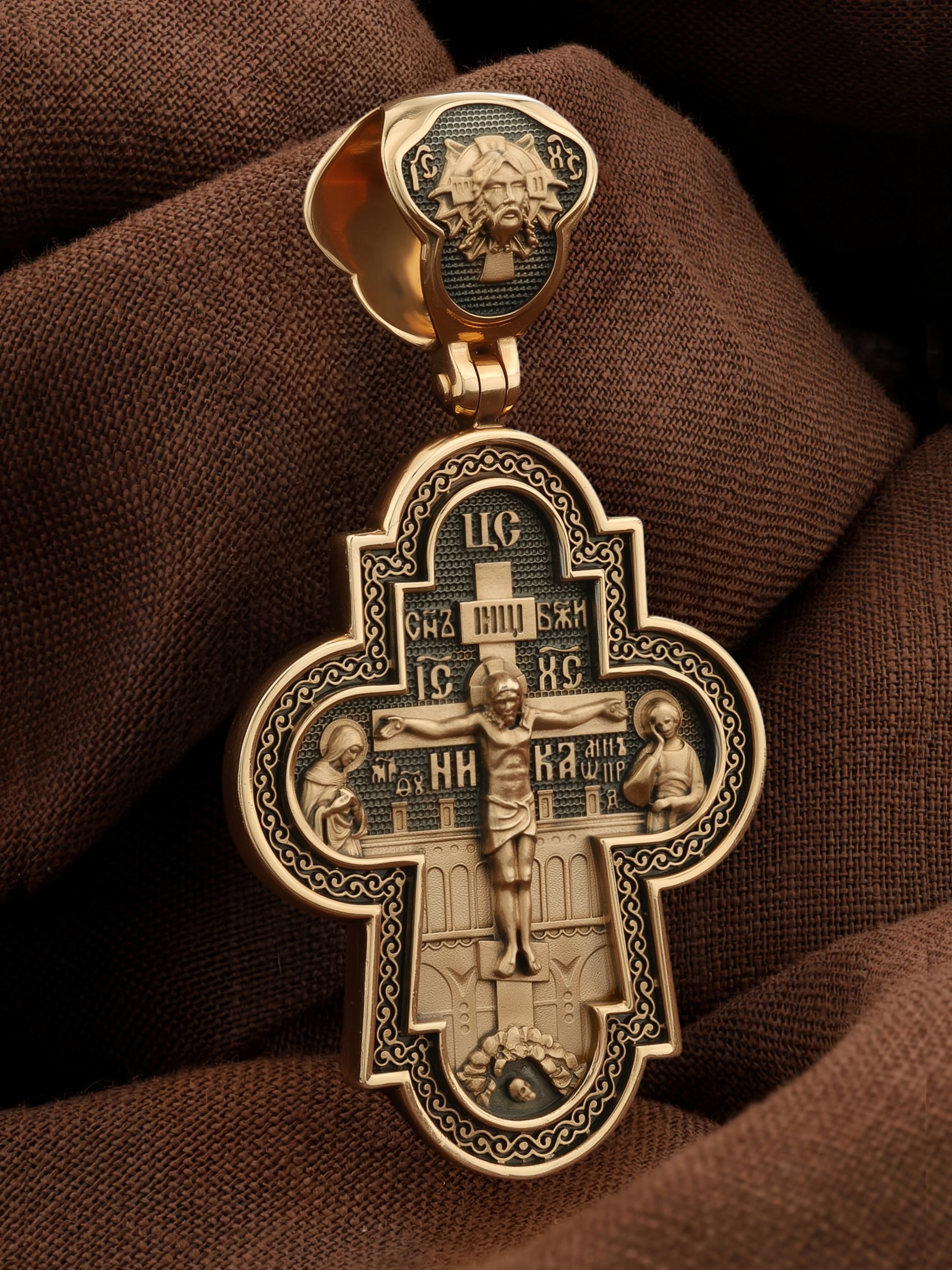 На лицевой стороне креста изображено Распятие Господа и Спасителя нашего Иисуса Христа, отдавшего Себя на смерть, чтобы другие могли жить — жить вечной жизнью, жить с Богом. Через крестную жертву Бог раскрывает нам Свою безмерную любовь и призывает к ответной любви. Своею кровью Господь освятил крест и сделал его проводником Своей благодати, источником освящения верующих. На верхней табличке, выше головы Иисуса, расположена надпись, составленная Понтием Пилатом — «IНЦI». Она означает «Иисус Назорей, Царь Иудейский». Распятие сопровождается каноническими надписями. Над Распятием находится надпись «Царь Славы». Надпись «IС» « ХС» означает Иисус Христос и помещается на разных сторонах поперечной (большой) перекладины креста. Рядом расположены надпись «Сын Божий» и слово «НИКА», что означает «победитель». Слева от Распятия изображена Пресвятая Богородица, справа — апостол и евангелист Иоанн Богослов, один из ближайших учеников Иисуса Христа. За Распятием высится Иерусалимская стена, в знак того, что Господь был распят вне стен города. Возвышение, на котором стоит Крест, символизирует гору Голгофу, на которой произошло Распятие. Под подножием Креста изображена покоящаяся голова (череп) Адама. Над На кулонном кольце изображен Нерукотворный образ Господа и Спасителя нашего Иисуса Христа, чудесно отпечатавшийся на плате, котором Христос вытер свой лик.