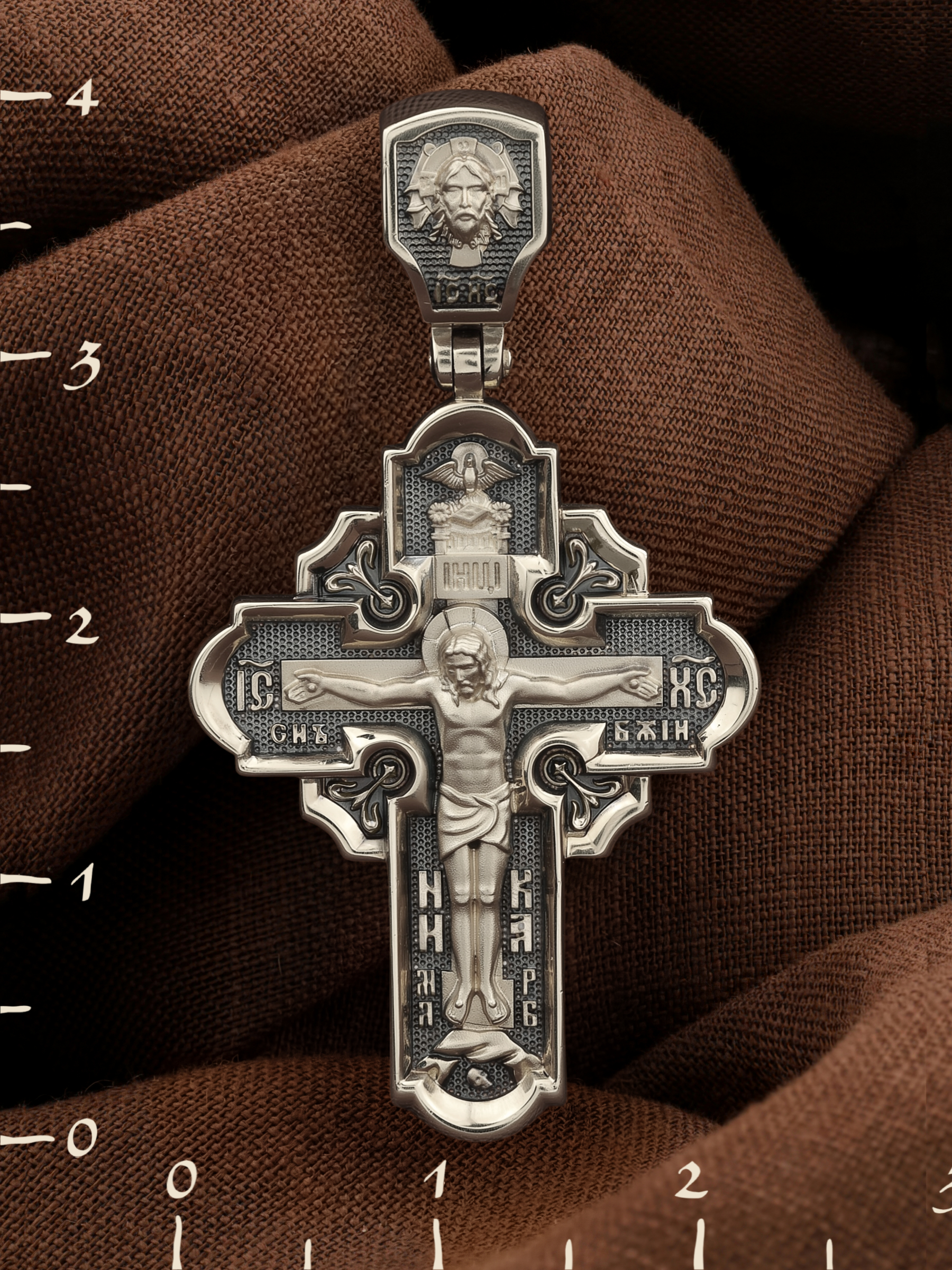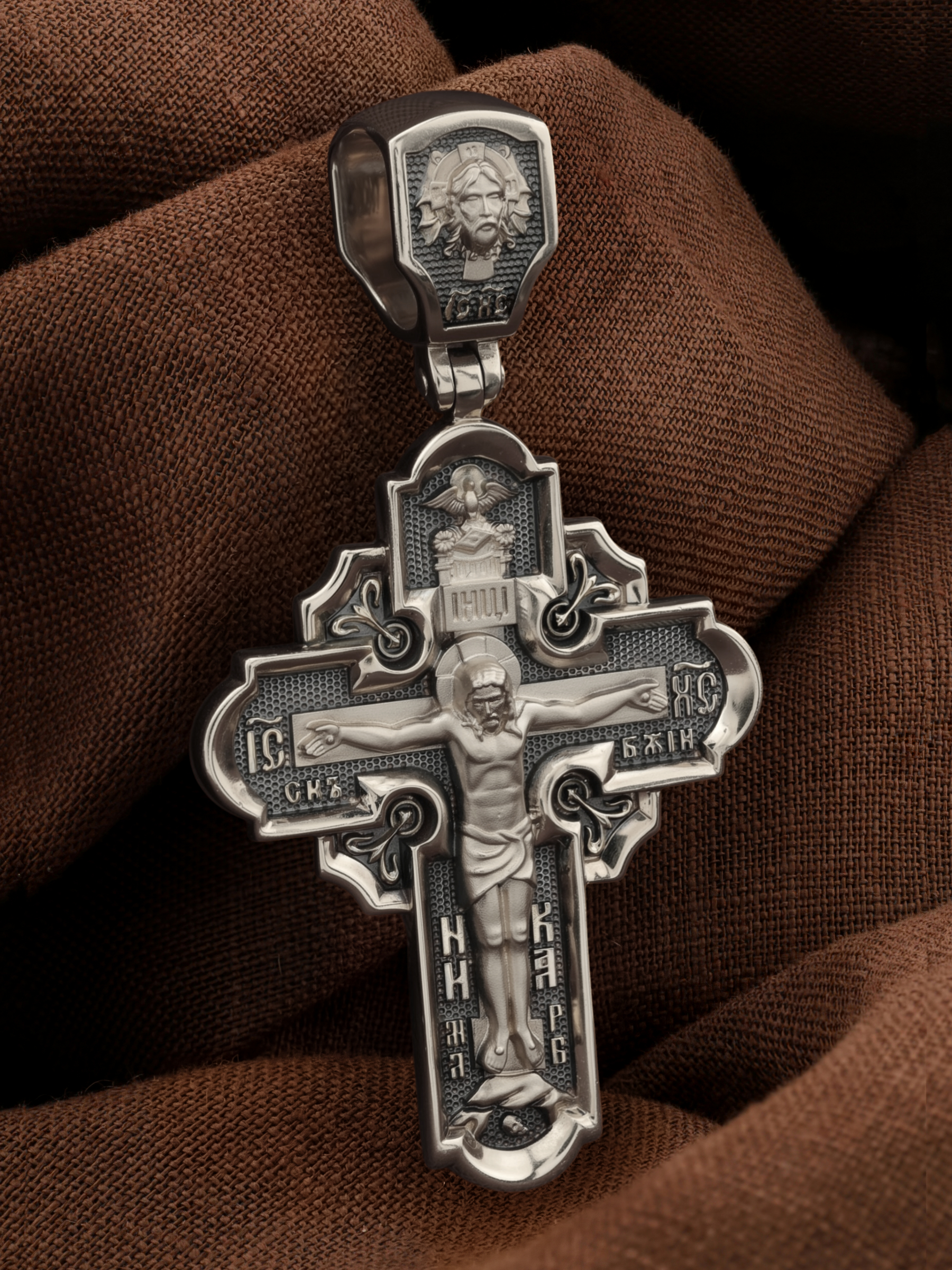 На лицевой стороне креста изображено Распятие Господа и Спасителя нашего Иисуса Христа, отдавшего Себя на смерть, чтобы другие могли жить — жить вечной жизнью, жить с Богом. Своею кровью Господь освятил крест и сделал его проводником Своей благодати, источником освящения верующих. На верхней табличке, выше головы Иисуса, расположена надпись, составленная Понтием Пилатом — «ИНЦИ». Она означает «Иисус Назорей, Царь Иудейский». Надпись «IС ХС» означает Иисус Христос помещается на разных сторонах поперечной (большой) перекладины креста. На кулонном кольце помещено изображение Духа Святого в виде голубя, сходящего с Небес