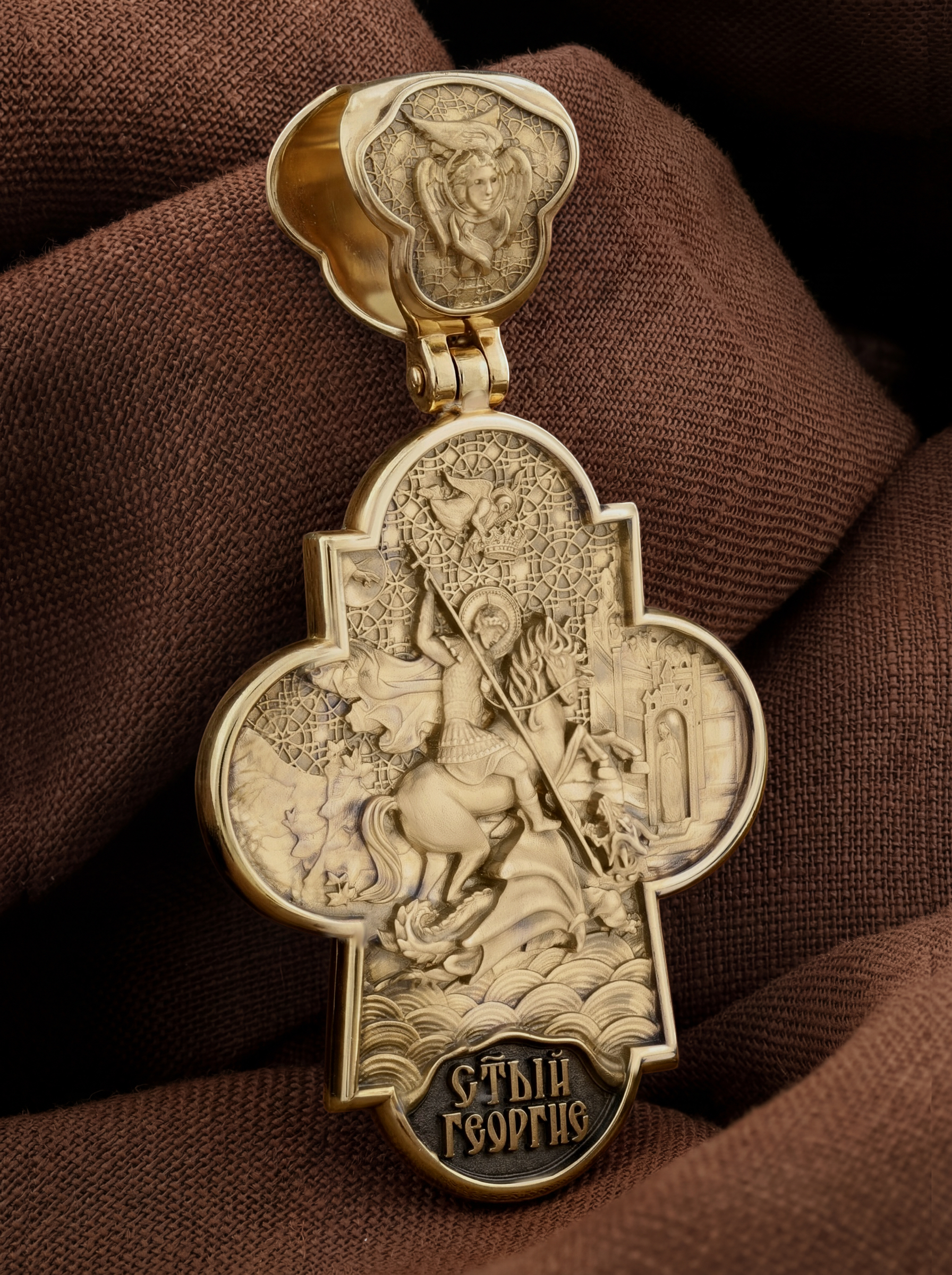 На оборотной стороне креста помещено изображение Святого Великомученика Георгия Победоносца — одного из самых почитаемых и удивительных святых. Георгий родился в Каппадокии (Малая Азия) в семье богатых и знатных горожан. Юношей поступил на службу к римскому императору Диоклетиану, за отличное знание военного дела и проявленную в боях и походах храбрость был приближен к императору и удостоен высокого воинского звания. Во время начавшихся гонений на христиан, перешел на сторону гонимых и, отвергнув человеческий страх, стал ярым проповедником учения Христа. Мучители подвергли опального воеводу жесточайшим восьмидневным пыткам и казнили его (обезглавили) в возрасте около тридцати лет в 303 году. Георгий изображен как воитель, сидящий на вздыбленном коне и поражающий копьем огнедышащего змея. Слева над образом изображена благословляющая Божия десница. Над святым изображен ангел возлагающий на него венец мученика. Змей символизирует собою сатанинские силы. Молитвами вознесенными к Всевышнему и своей непреклонной верой он смог одолеть чудовище. Святой убил змея, спас царскую дочь, принесенную в жертву, и жителей города, их души от влияния дьявола, породив в них надежду и веру в Господа, призывая людей принять христианскую веру. На кулонном кольце изображен шестикрылый Ангел — Серафим.