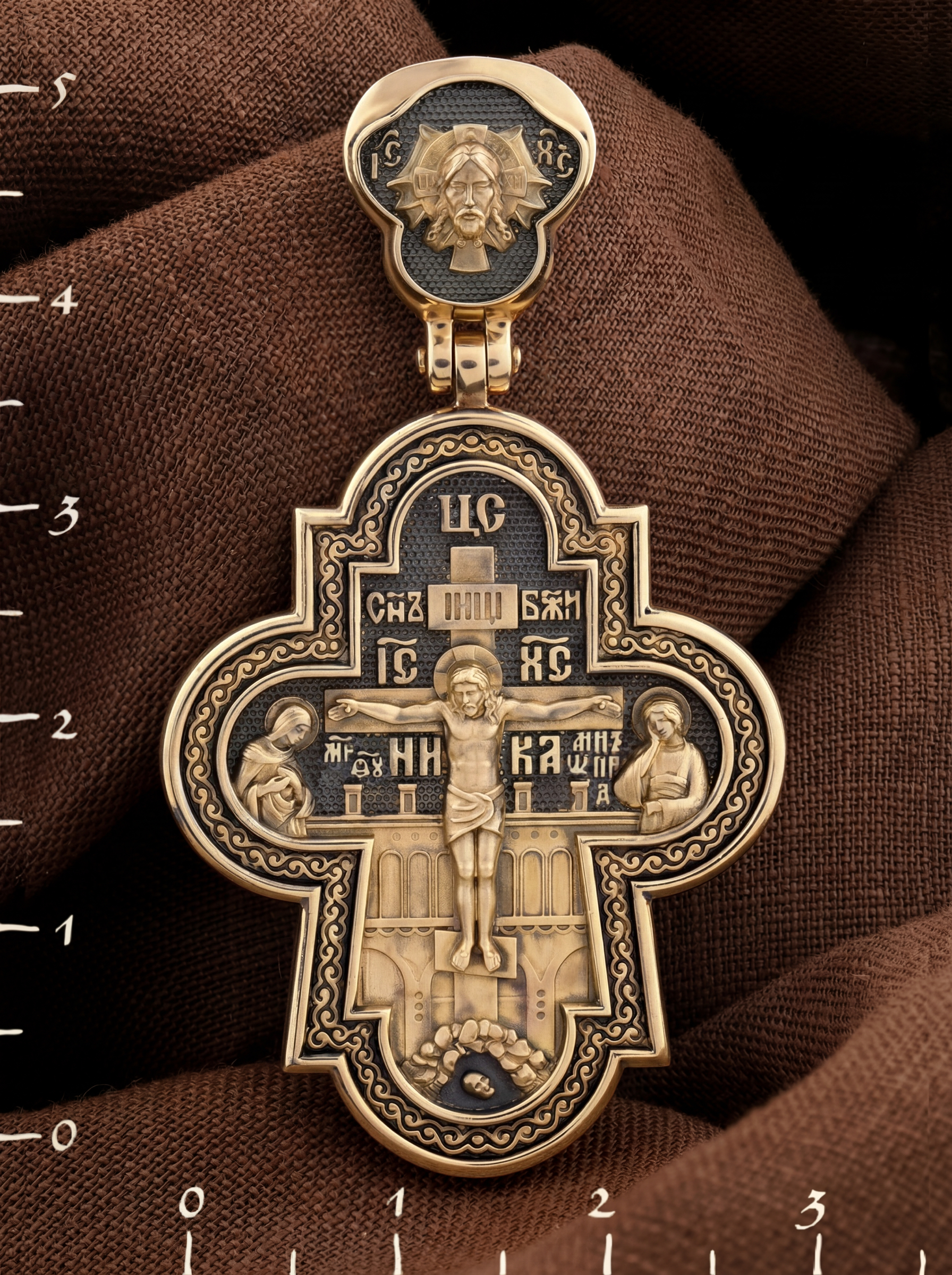 На лицевой стороне креста изображено Распятие Господа и Спасителя нашего Иисуса Христа, отдавшего Себя на смерть, для искупления грехов мира. Крест является символом жертвенной любви Всеблагого Бога к падшим людям, всепобеждающим духовным оружием христиан, основанием и средоточием церковной жизни. Господь сказал: кто хочет идти за Мною, отвергнись себя, и возьми крест свой, и следуй за Мною. (Мк. 8: 34). Над Распятием помещена надпись «Царь Славы». На верхней табличке, выше головы Иисуса, расположена надпись, составленная Понтием Пилатом — «IНЦI». Она означает «Иисус Назорей, Царь Иудейский». Надпись «IC» «ХC», означает Иисус Христос, помещается на разных сторонах поперечной перекладины креста. Возвышение, на котором стоит Крест, символизирует гору Голгофу, на которой произошло Распятие. Под подножием Креста изображена покоящаяся голова (череп) Адама. На кулонном кольце изображен Нерукотворный образ Господа и Спасителя нашего Иисуса Христа, чудесно отпечатавшийся на плате, которым Христос вытер свой лик.