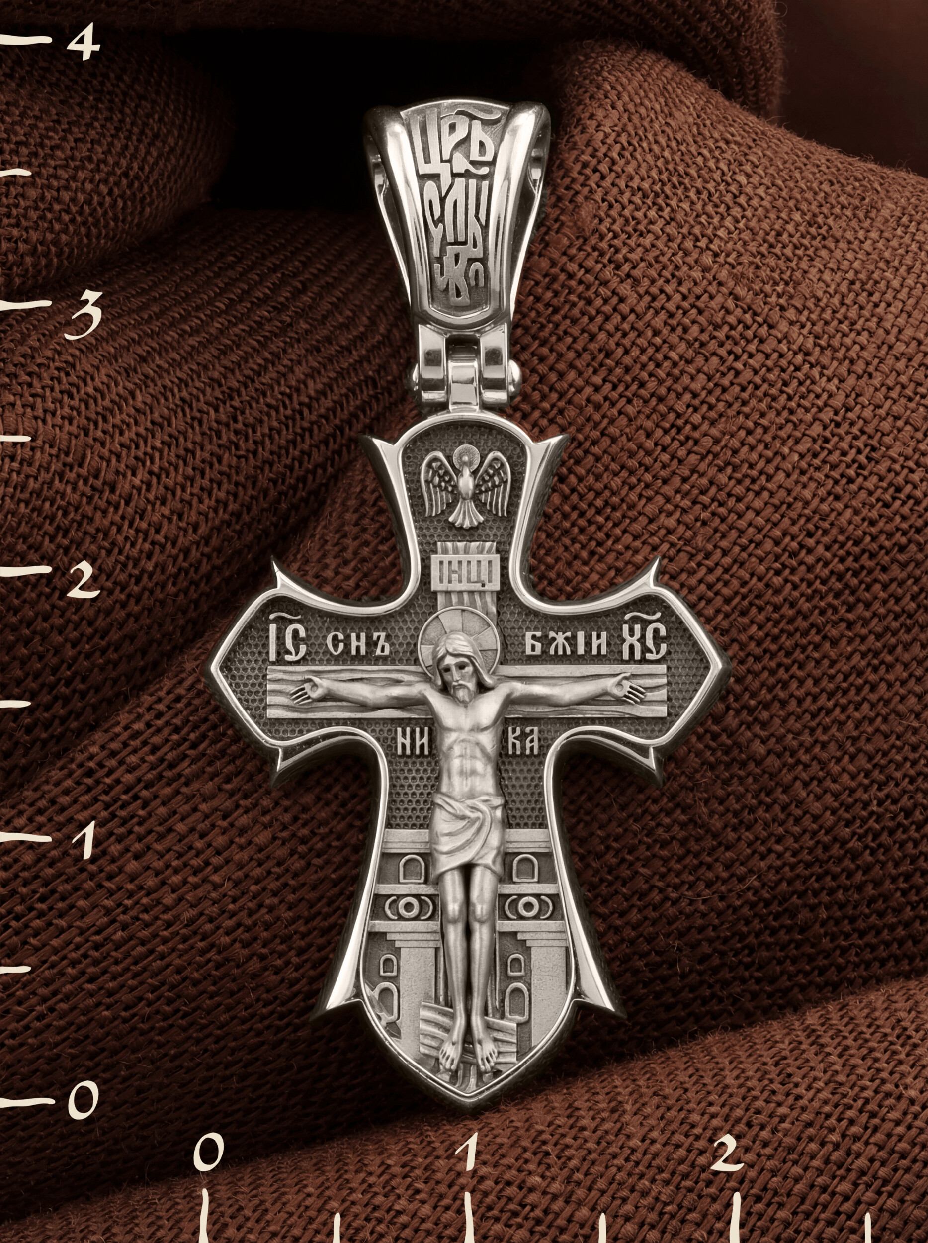 На лицевой стороне креста изображено распятие Господа нашего Иисуса Христа. Позади Распятия видна иерусалимская стена, знак того, что Господь был распят вне стен города. Но вместе с тем стена символизирует и Небесный Иерусалим, путь который открылся для человека через Голгофу. На кулоном кольце видим слова «ЦРЬ СЛВЫ» — Царь Славы. Верхняя перекладина символизирует собой табличку с надписью «IHЦI» — Иисус Назарянин Царь Иудейский. Над перекладиной пишется сокращенно имя Спасителя «IC XC» — Иисус Христос и словосочетание «СНЪ БЖIЙ» — «СЫН БОЖИЙ». Рядом с образом Христа помещены слова — «НИКА» (греч. — Победитель). Возвышение, на котором стоит Крест, символизирует гору Голгофу, на которой произошло Распятие. У подножия Креста изображают прах Адама, обозначенный черепом.
