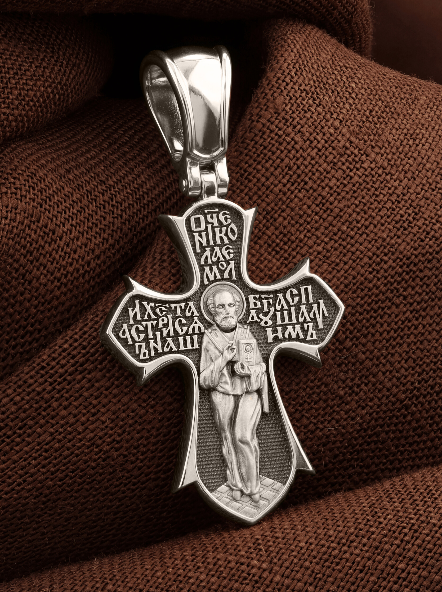 Оборотную сторону креста возглавляет икона Святителя Николая Чудотворца, которого еще называют Николай Угодник за то, что он угодил своей жизнью Богу. Николай Чудотворец, помощник в делах, покровитель учащихся, утешитель обиженных. Также Святитель Николай Чудотворец известен своими молитвами за путешественников, когда непрестанный ветер и бушующие волны утихают и корабль заходит в спокойную гавань. На кресте написана молитва: «Отче Николае, моли Христа Бога спастися душам нашим».