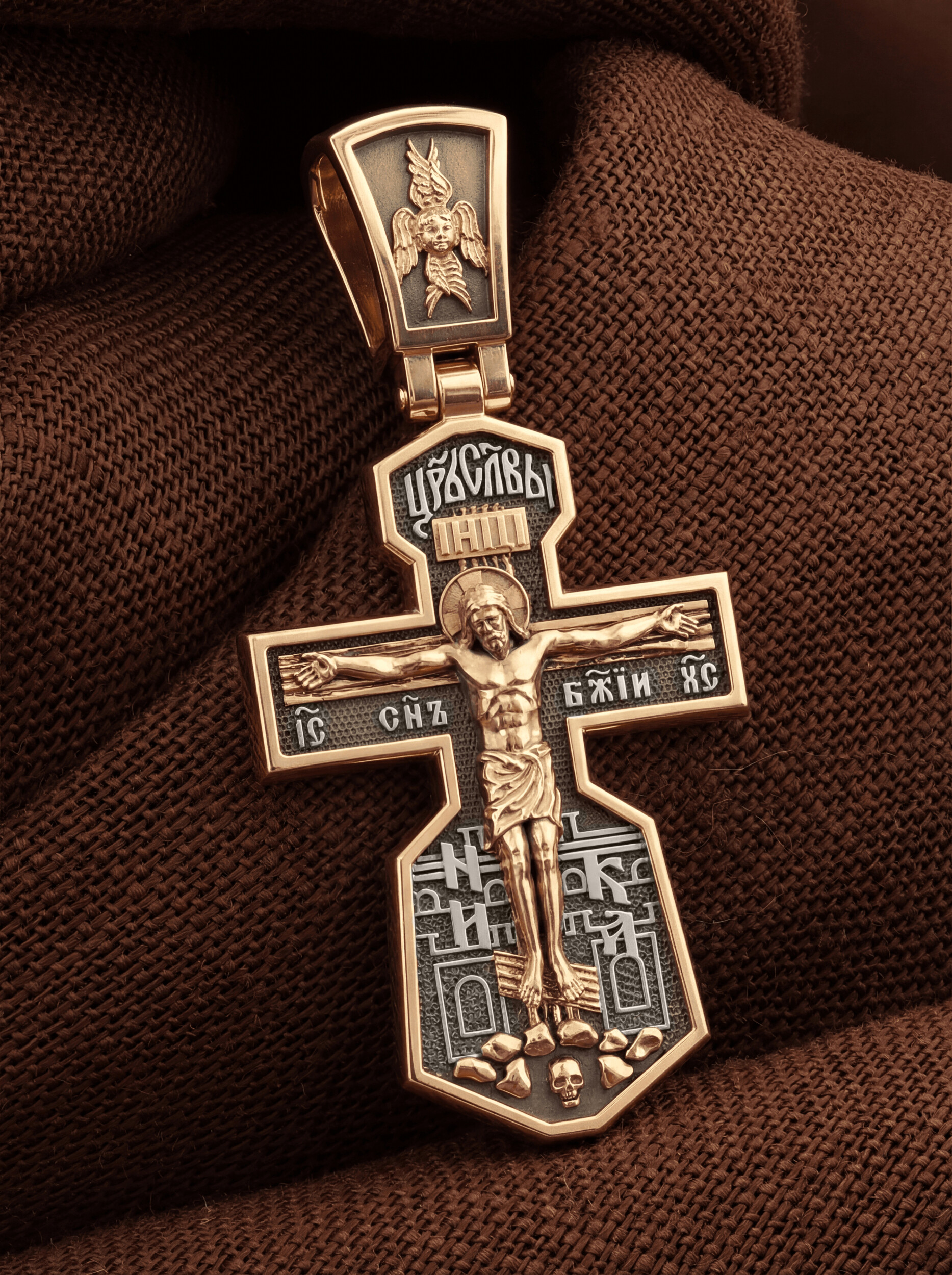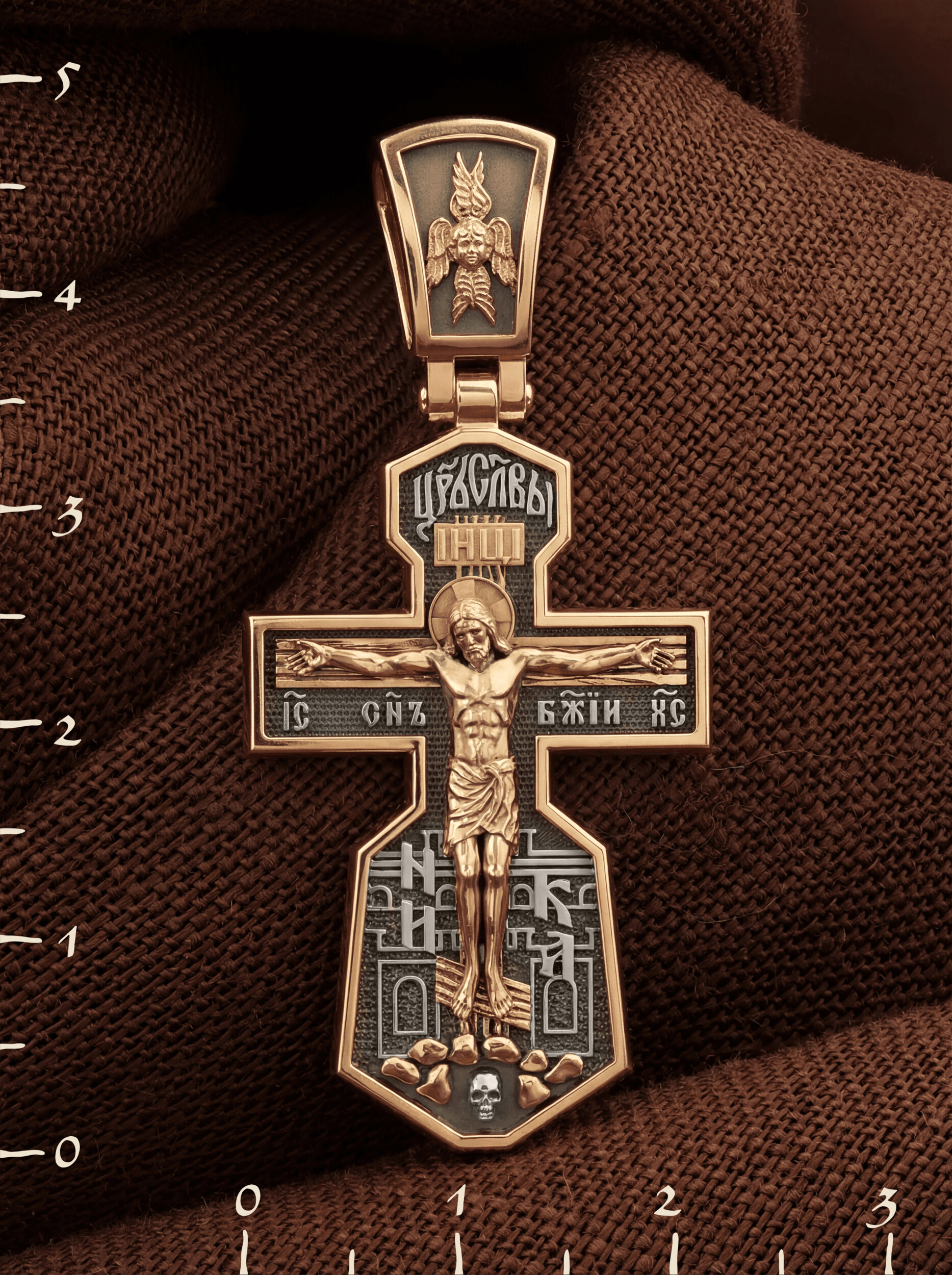 На лицевой стороне креста изображено Распятие Иисуса Христа. Господь представлен свободно покоящимся на кресте с простертыми руками и как бы обнимающим всю Вселенную. Он — Спаситель, искупивший грехи мира, «поправший смертию смерть» и призывающий к Себе «все концы земли». Поэтому рядом с Его образом помещены слова — «НИКА» и «Царь Славы». Эти слова характеризуют Господа как Великого Архиерея, победителя смерти. Верхняя перекладина символизирует титло — табличку, на которой, согласно Евангелию, было начертано: Иисус Назорей Царь Иудейский (IНЦI). Также Распятие сопровождается надписями, олицетворяющими Христа. Это святое имя Христа «IC» (Иисус) «ХС» (Христос), и словосочетание «СЫН БОЖИЙ».