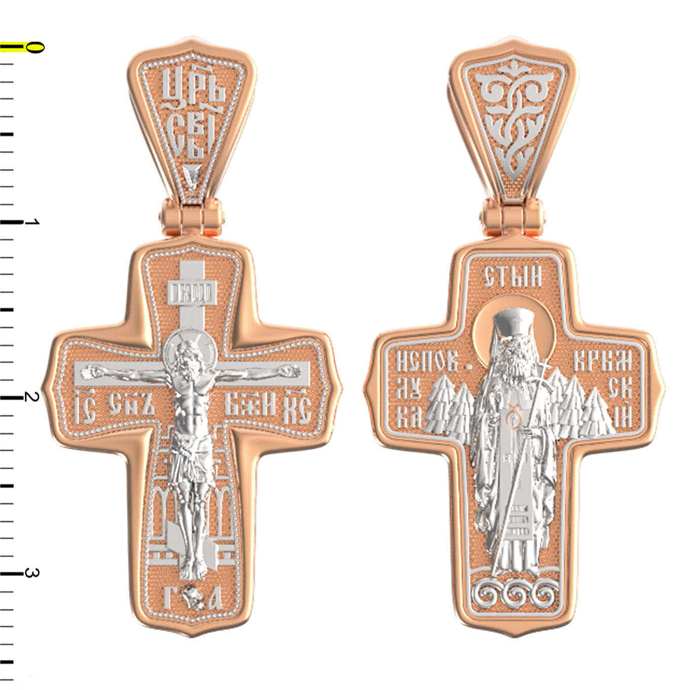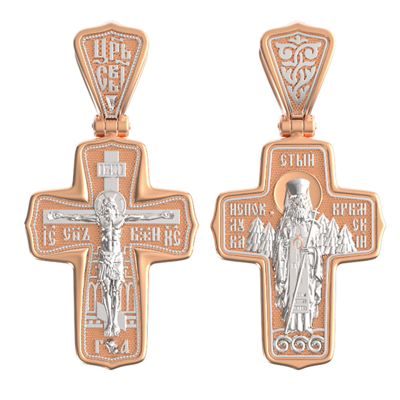 На лицевой стороне креста изображено Распятие Господа и Спасителя нашего Иисуса Христа. Крест- символ спасения и искупления рода человеческого, знамение победы над смертью и адом. Он стал символом восстания из мертвых и обретения вечной жизни в Царствии Иисуса Христа, величайшим символом силы и власти Христовой. Иисус Христос, как искупительная жертва освобождения человечества от власти греха, умер крестной смертью и в третий день воскрес. На верхней табличке, выше головы Иисуса, расположена надпись, составленная Понтием Пилатом — «IНЦI». Она означает «Иисус Назорей, Царь Иудейский». На кулонном кольце помещена надпись «Царь Славы». Надпись «IС» « ХС» означает Иисус Христос и помещается на разных сторонах поперечной перекладины креста. Рядом расположена надпись «Сын Божий». За крестом высится Иерусалимская стена. Ниже подножия креста различается череп и надпись «Г.А» — это глава Адамова. На православном кресте Христос не умирает, а свободно простирает руки, ладони Иисуса открыты, будто он хочет обнять все человечество, даря им свою любовь и открывая путь к вечной жизни.