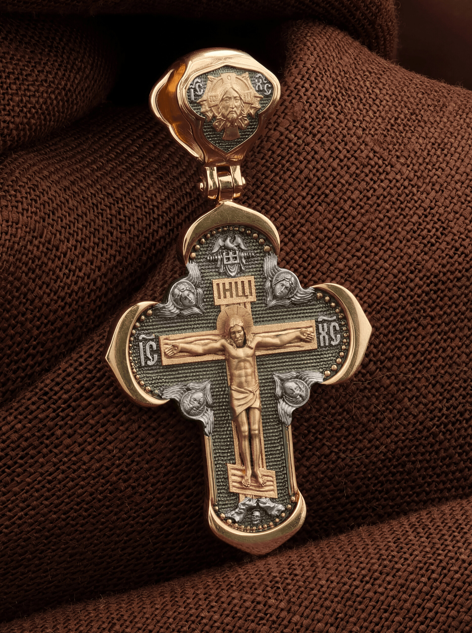 На лицевой стороне креста изображено Распятие Господа и Спасителя нашего Иисуса Христа, отдавшего Себя на смерть, для искупления грехов мира. Крест является символом жертвенной любви Всеблагого Бога к падшим людям, всепобеждающим духовным оружием христиан, основанием и средоточием церковной жизни. Господь сказал: «кто хочет идти за Мною, отвергнись себя, и возьми крест свой, и следуй за Мною». (Мк. 8: 34). На верхней табличке, выше головы Иисуса, расположена надпись, составленная Понтием Пилатом — «IНЦI». Она означает «Иисус Назорей, Царь Иудейский». Надпись «IC» «ХC», означает Иисус Христос, помещается на разных сторонах поперечной перекладины креста. Крест стоит на горе камней, символизирующих Голгофу. В ее основании различается череп– это голова Адама. На кулонном кольце изображен Нерукотворный образ Господа и Спасителя нашего Иисуса Христа, чудесно отпечатавшийся на плате, которым Христос вытер свой лик.