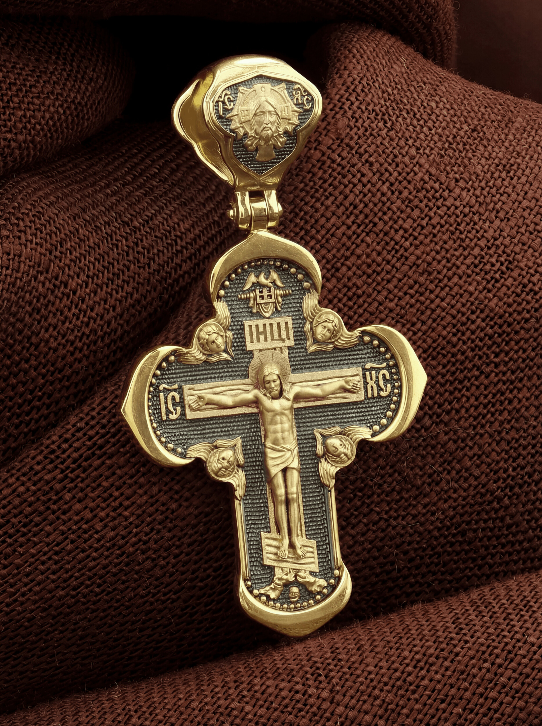 На лицевой стороне креста изображено Распятие Господа и Спасителя нашего Иисуса Христа, отдавшего Себя на смерть, для искупления грехов мира. Крест является символом жертвенной любви Всеблагого Бога к падшим людям, всепобеждающим духовным оружием христиан, основанием и средоточием церковной жизни. Господь сказал: «кто хочет идти за Мною, отвергнись себя, и возьми крест свой, и следуй за Мною». (Мк. 8: 34). На верхней табличке, выше головы Иисуса, расположена надпись, составленная Понтием Пилатом — «IНЦI». Она означает «Иисус Назорей, Царь Иудейский». Надпись «IC» «ХC», означает Иисус Христос, помещается на разных сторонах поперечной перекладины креста. Крест стоит на горе камней, символизирующих Голгофу. В ее основании различается череп– это голова Адама. На кулонном кольце изображен Нерукотворный образ Господа и Спасителя нашего Иисуса Христа, чудесно отпечатавшийся на плате, которым Христос вытер свой лик.