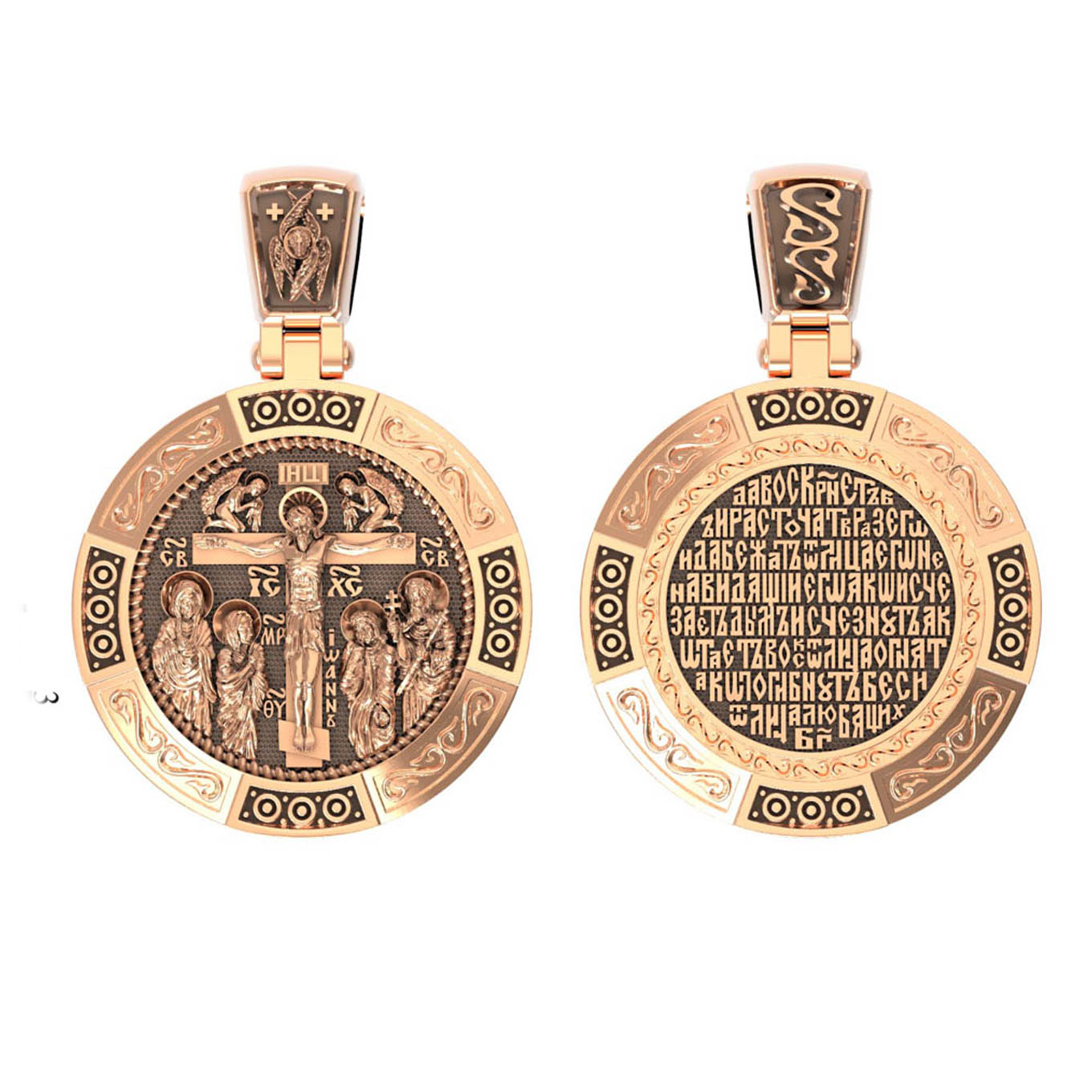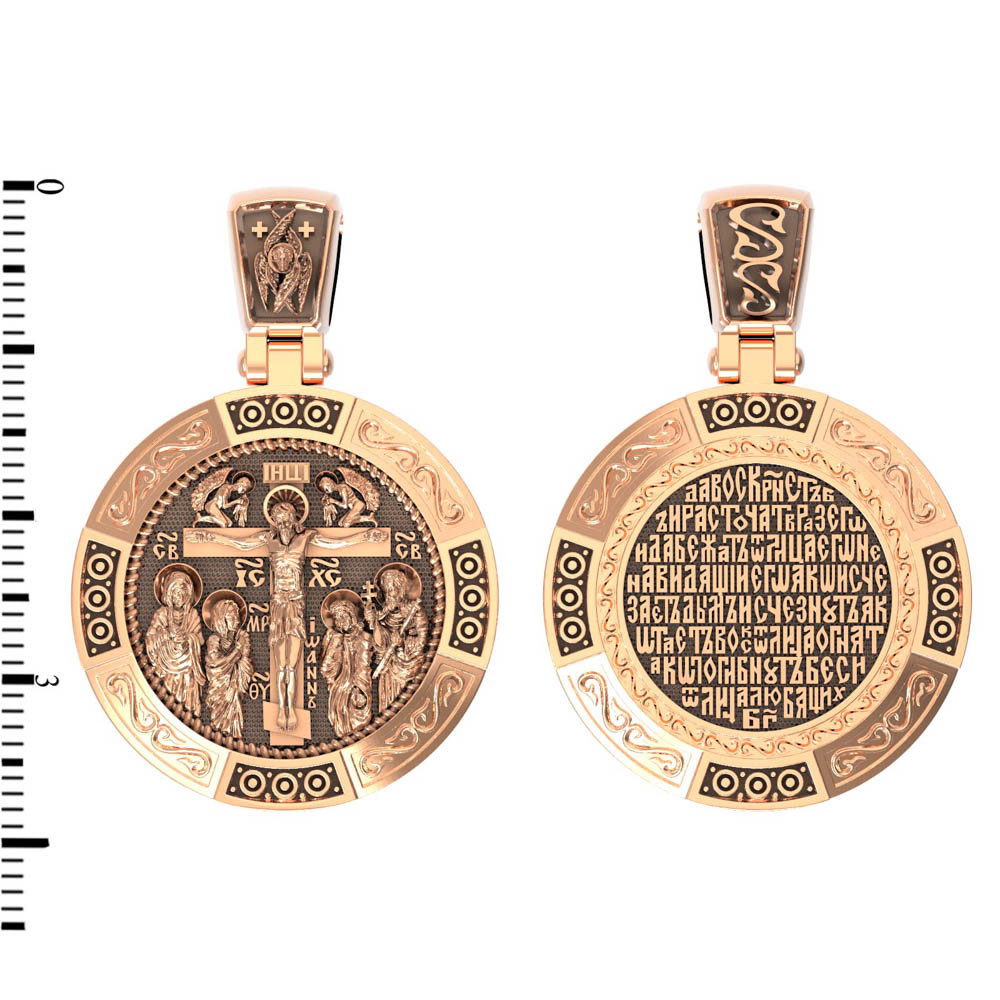На лицевой стороне образка изображено Распятие Господа Иисуса Христа с предстоящими Ему святыми, которые, по преданию, находились у Креста Господа во время Его казни. Слева — Пресвятая Богородица и св. Мария Клеопова, справа — апостол Иоанн Богослов и мч. Лонгин Сотник.