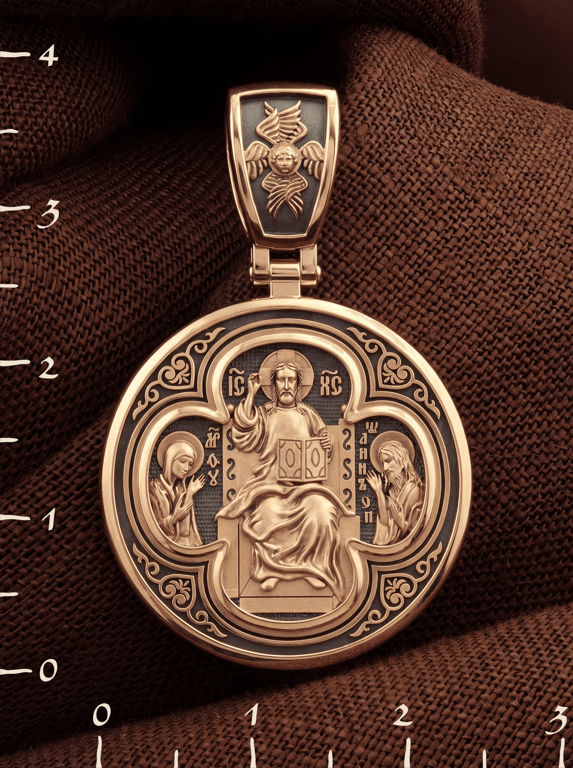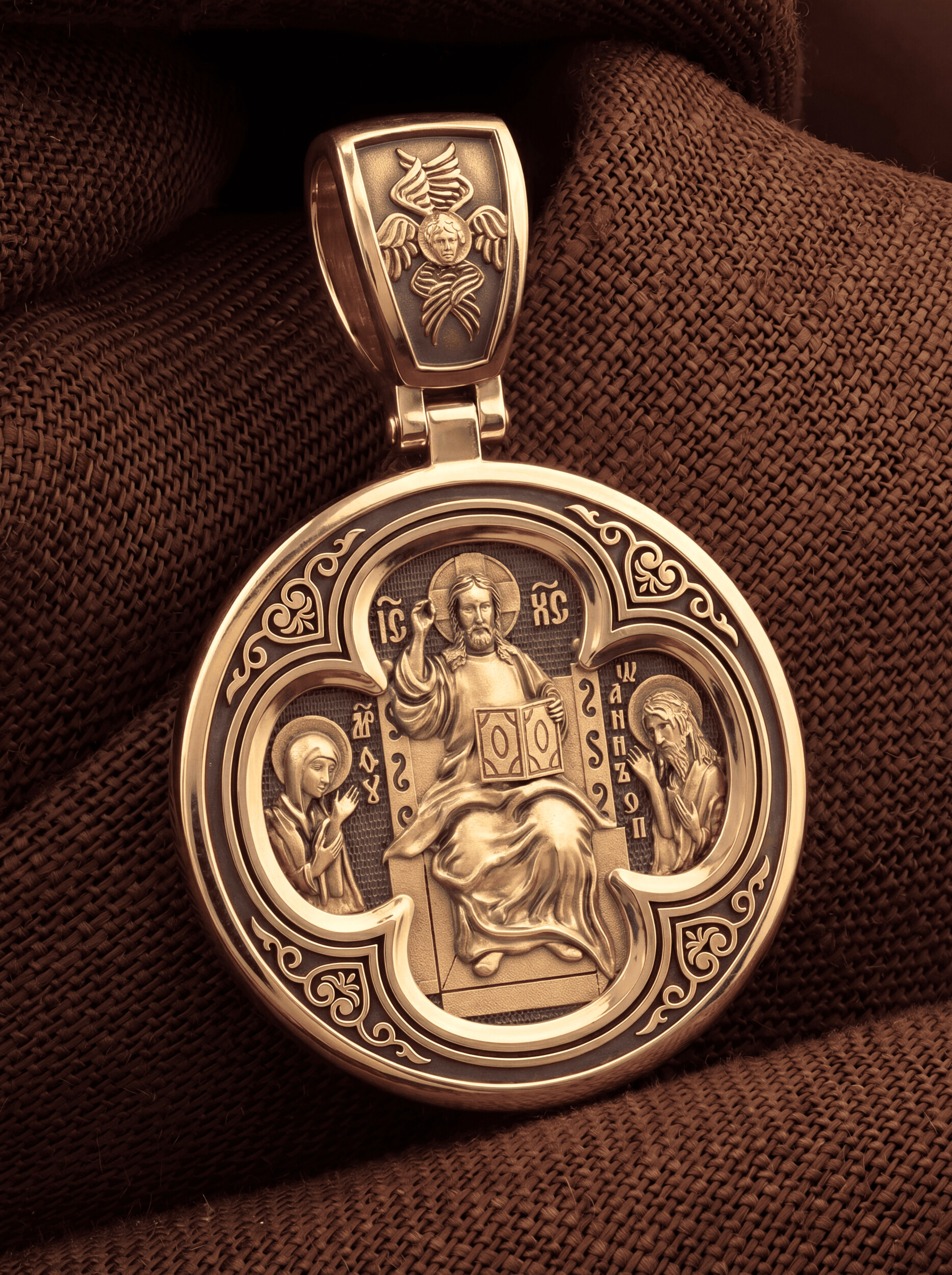 На лицевой стороне образка изображена икона Иисуса Христа Деисус. Он представлен в образе Господа Вседержителя, восседающего на престоле. В его руках — Книга Судеб всего человечества. С двух сторон ему предстоят Пресвятая Богородица и пророк Иоанн Предтеча, Креститель Господень.