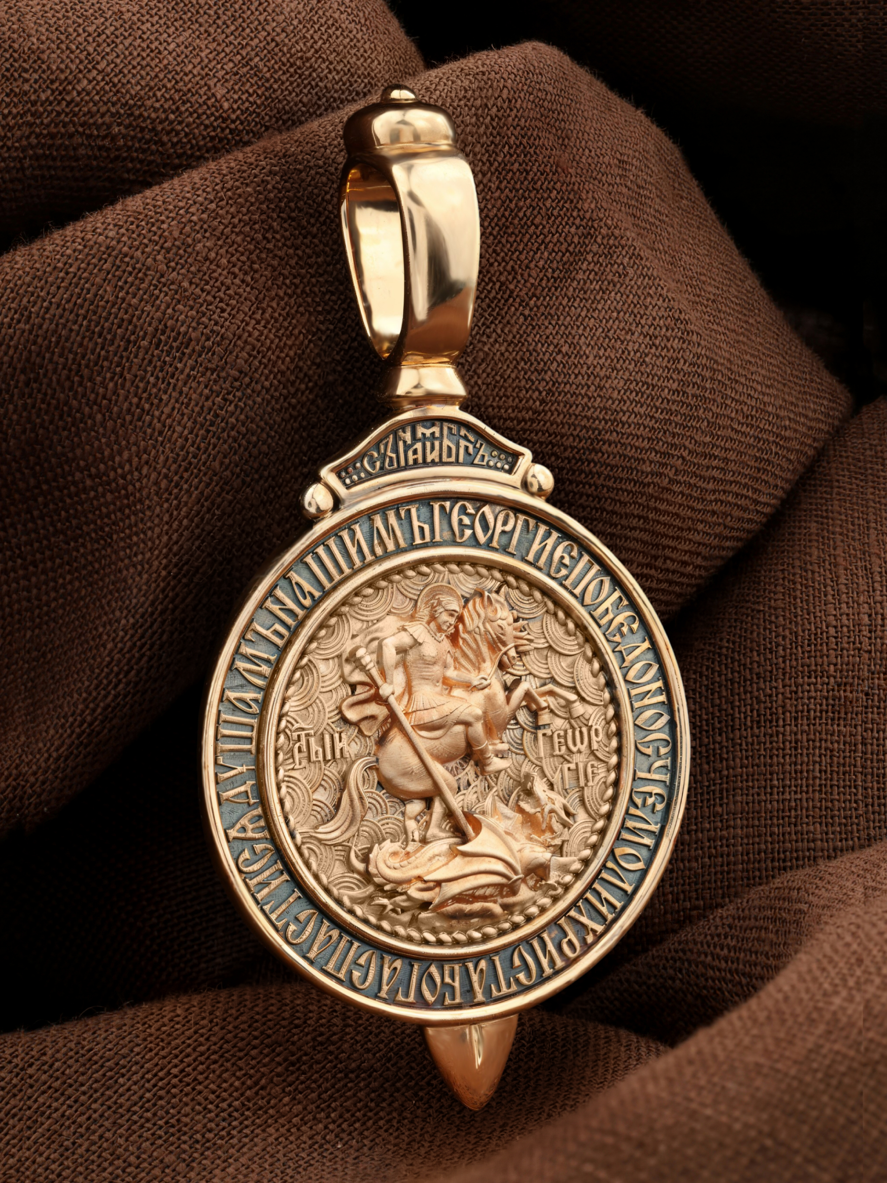 Основой композиции лицевой стороны является изображение Святого Великомученика Георгия Победоносца — одного из самых почитаемых и удивительных святых. На Руси он известен как Юрий или Егорий, покровитель воинов, помощник в крестьянском труде. На образке он изображен как воитель, сидящий на вздыбленном коне и поражающий копьем огнедышащего змея. Змей символизирует собою сатанинские силы. Молитвами вознесенными к Всевышнему и своей непреклонной верой он смог одолеть чудовище. Святой убил змея, спас царскую дочь, принесенную в жертву, и жителей города, их души от влияния дьявола, породив в них надежду и веру в Господа, призывая людей принять христианскую веру. Изображение святого великомученика Георгия Победоносца обрамлено словами молитвы: «Геогрие Победоносче, моли Христа Бога спастися душам нашим».