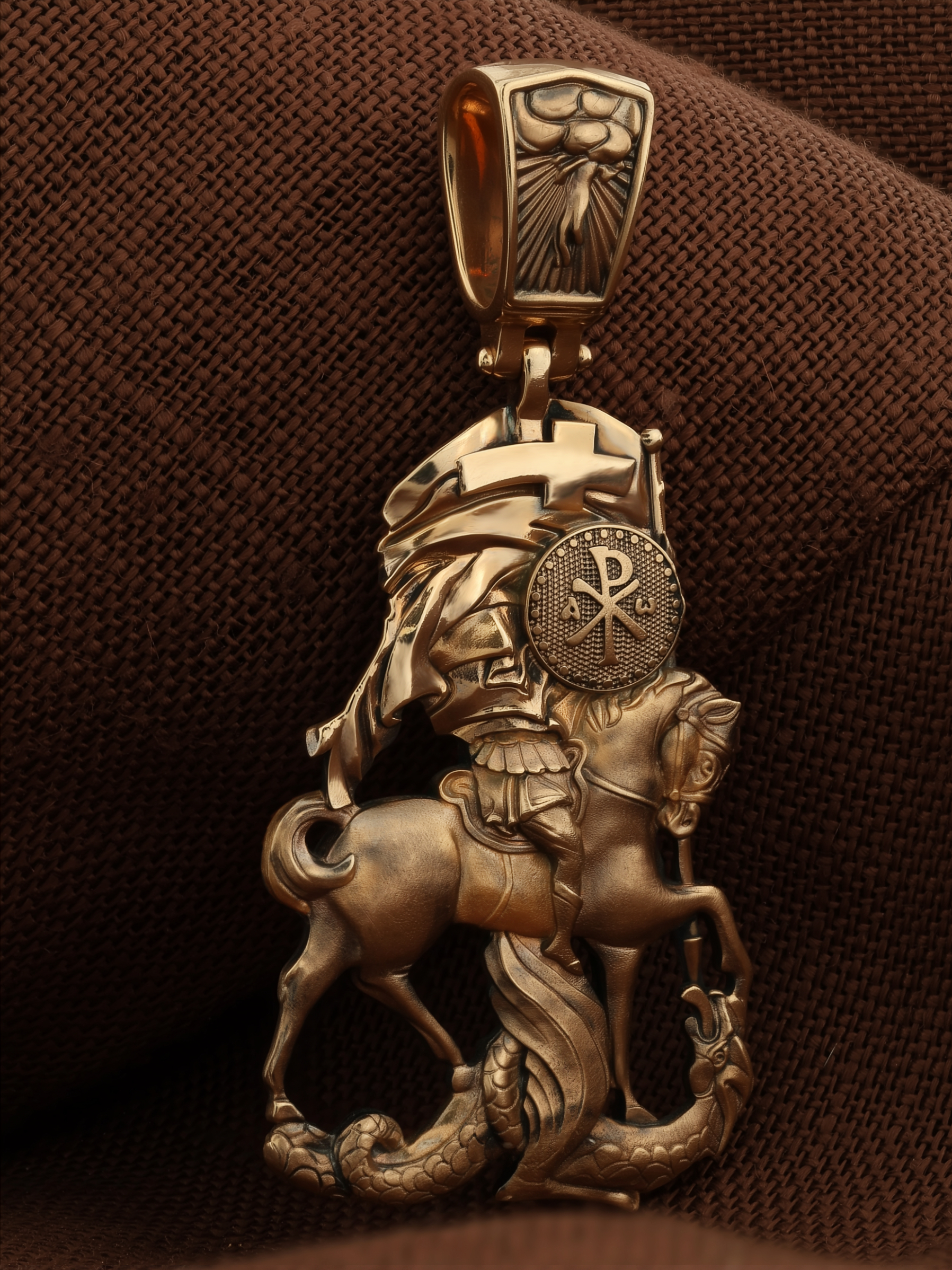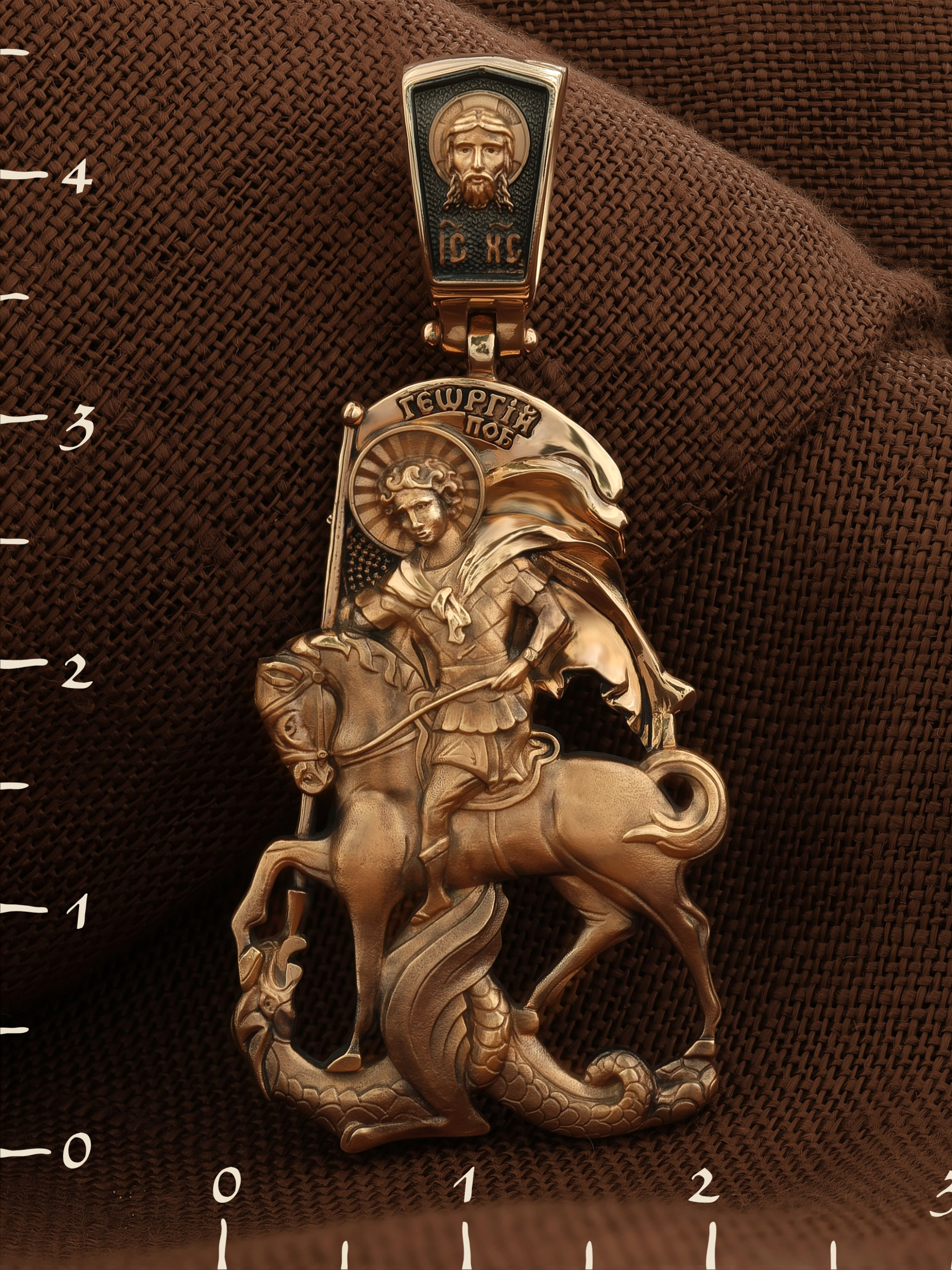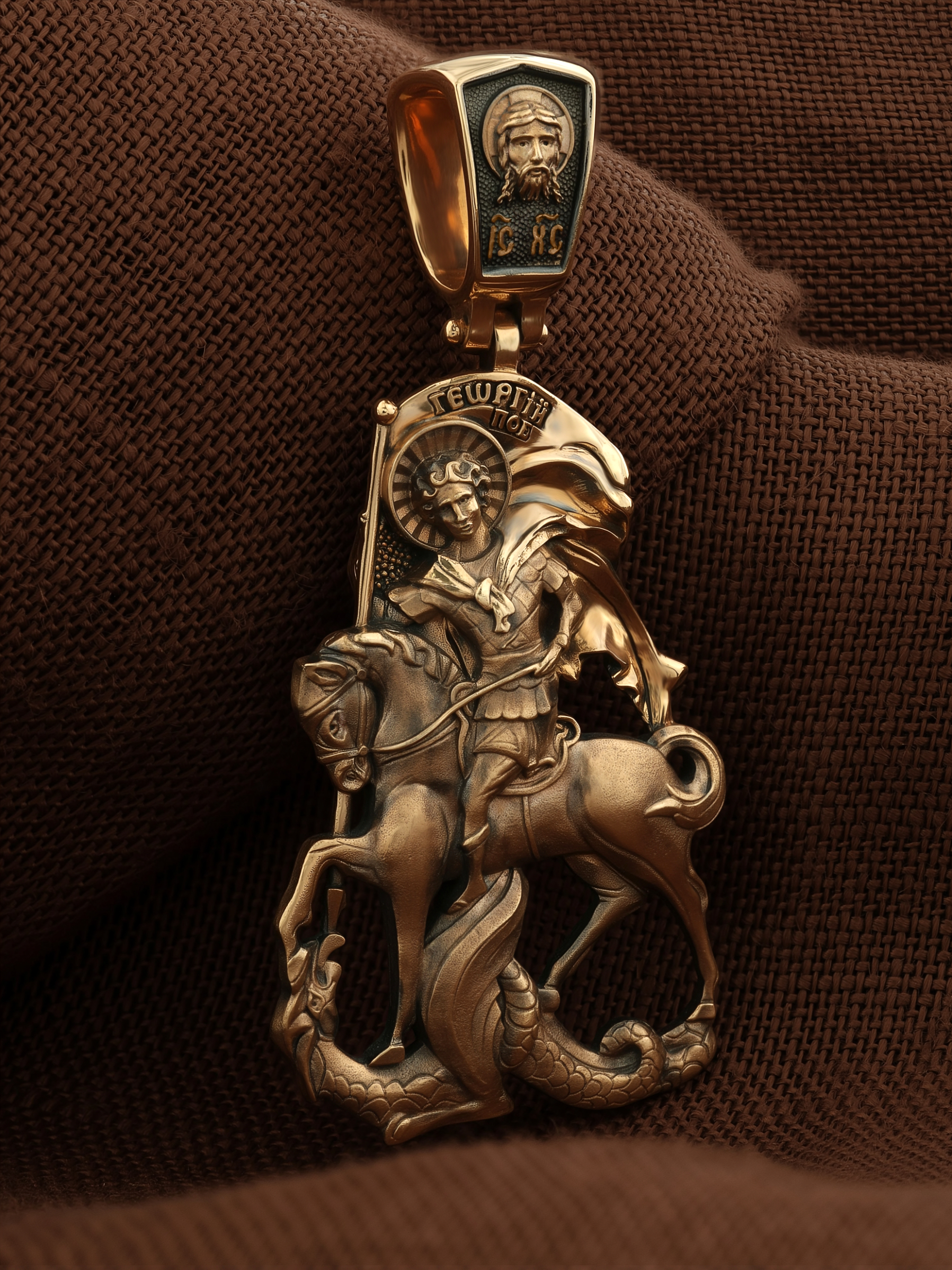 Основой композиции образка является изображение Святого Великомученика Георгия Победоносца — одного из самых почитаемых и удивительных святых. Георгий родился в Каппадокии (Малая Азия) в семье богатых и знатных горожан. Юношей поступил на службу к римскому императору Диоклетиану, за отличное знание военного дела и проявленную в боях и походах храбрость был приближен к императору и удостоен высокого воинского звания. Во время начавшихся гонений на христиан, перешел на сторону гонимых и, отвергнув человеческий страх, стал ярым проповедником учения Христа. Мучители подвергли опального воеводу жесточайшим восьмидневным пыткам и казнили его (обезглавили) в возрасте около тридцати лет в 303 году. На Руси он известен как Юрий или Егорий, заступник для верующих, чья жизнь имеет какое-либо отношение к военным делам, помощник в крестьянском труде. Образок сделан в виде воинского щита. На нем Георгий изображен как воитель, сидящий на вздыбленном коне и поражающий копьем огнедышащего змея. Справа над образом изображена благословляющая Божия десница. Змей символизирует собою сатанинские силы. Молитвами вознесенными к Всевышнему и своей непреклонной верой он смог одолеть чудовище. Святой убил змея, спас царскую дочь, принесенную в жертву, и жителей города, их души от влияния дьявола, породив в них надежду и веру в Господа, призывая людей принять христианскую веру. На оборотной стороне образка написана молитва: «Мучениче Георгие, моли Бога о мне».