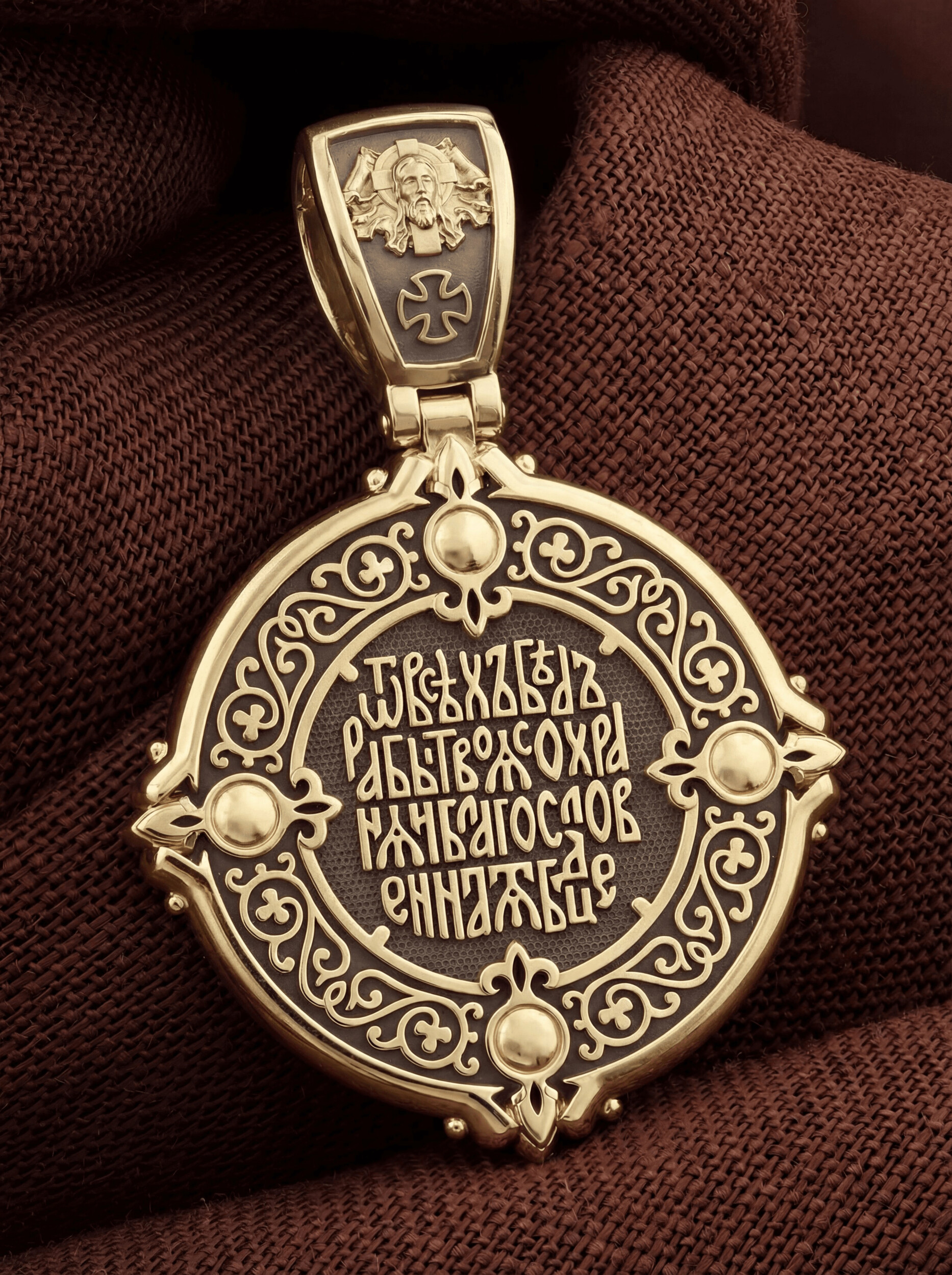На обороте написана молитва к Богородице: «От всех бед рабы Твоя сохраняй, Благословенная Богородица!». На кулонном кольце изображен Спас Нерукотворный — Символ вочеловечившегося Божества и шестикрылый Серафим — самый приближенный к Господу Ангел.