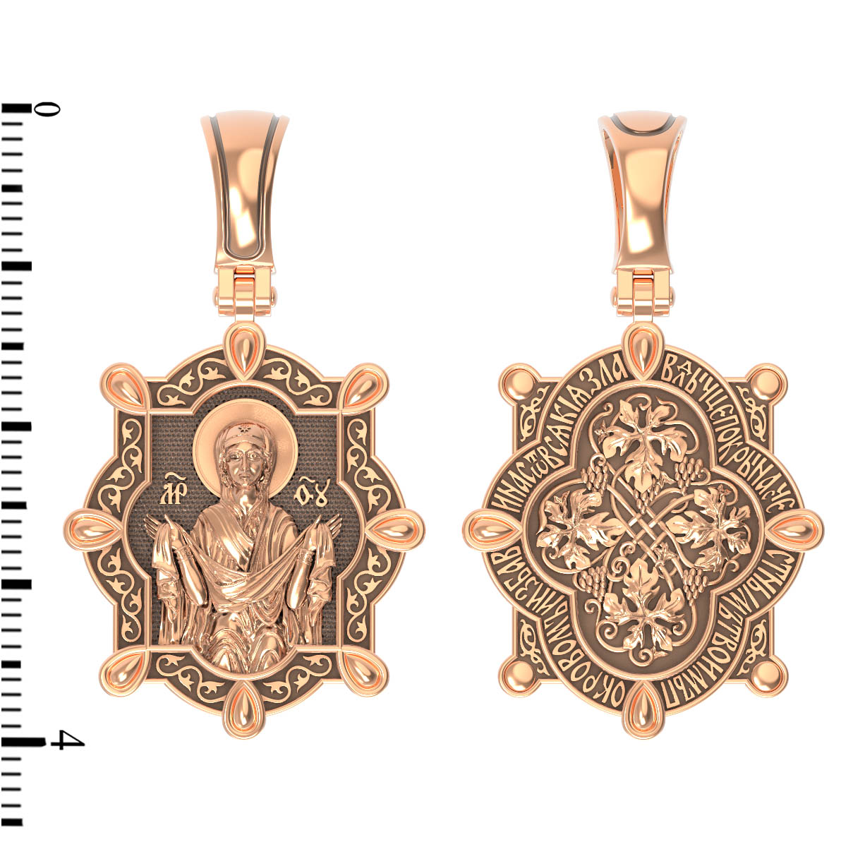 На лицевой части образка изображена икона Покров Пресвятой Богородицы. Праздник Покрова Божией Матери является воспоминанием чуда, которое произошло во Влахнернской церкви 1 (14) октября 910 года: Пресвятая Богородица явилась верующим над алтарем храма и распростерла над ними Свое покрывало. В этот день Божья Матерь открыла людям, что Она является Ходатаицей за них перед Богом. Богородица простирает Свой молитвенный покров над всеми православными христианами и умоляет Сына Своего о даровании вечного спасения каждому человеку.