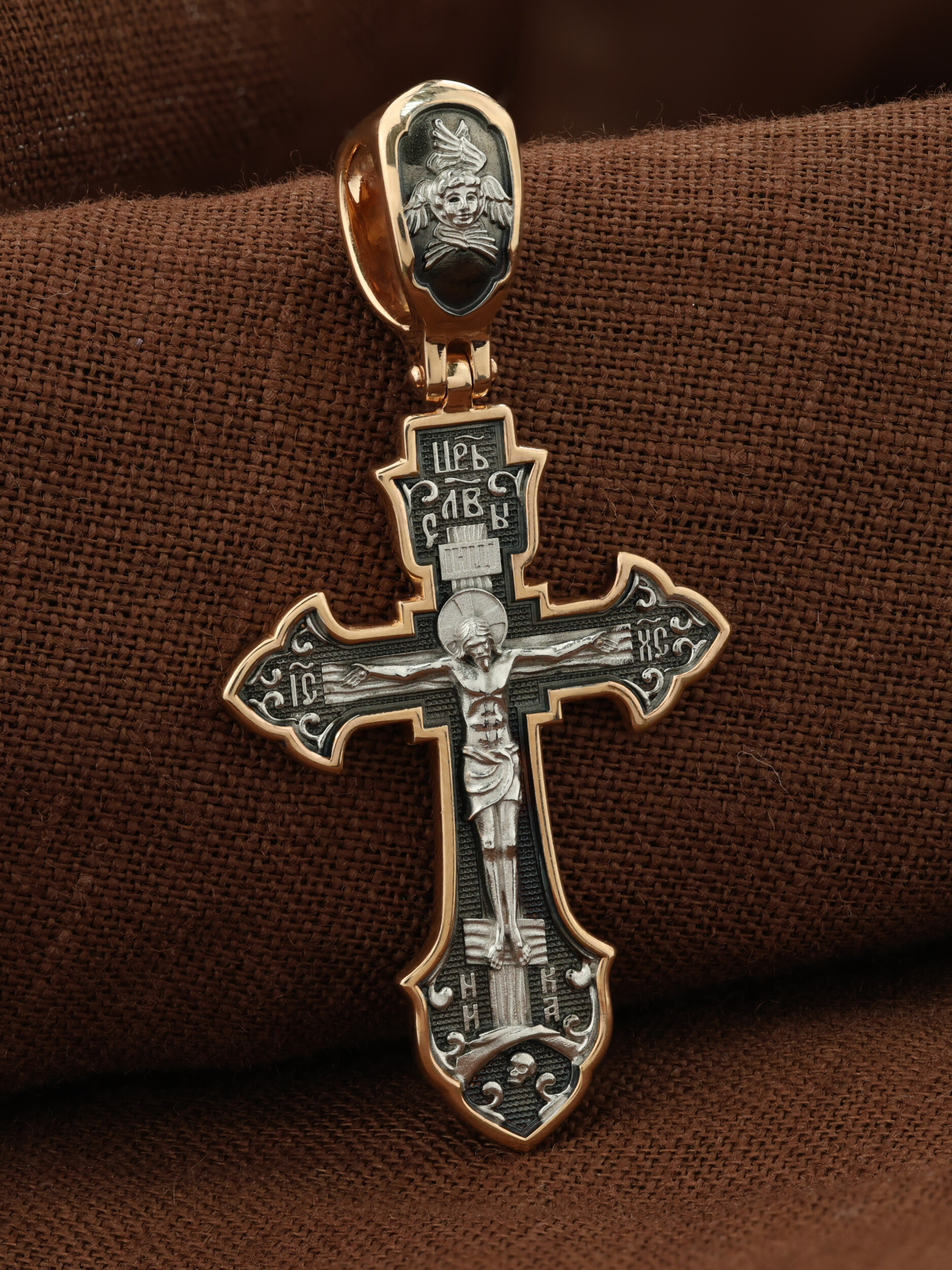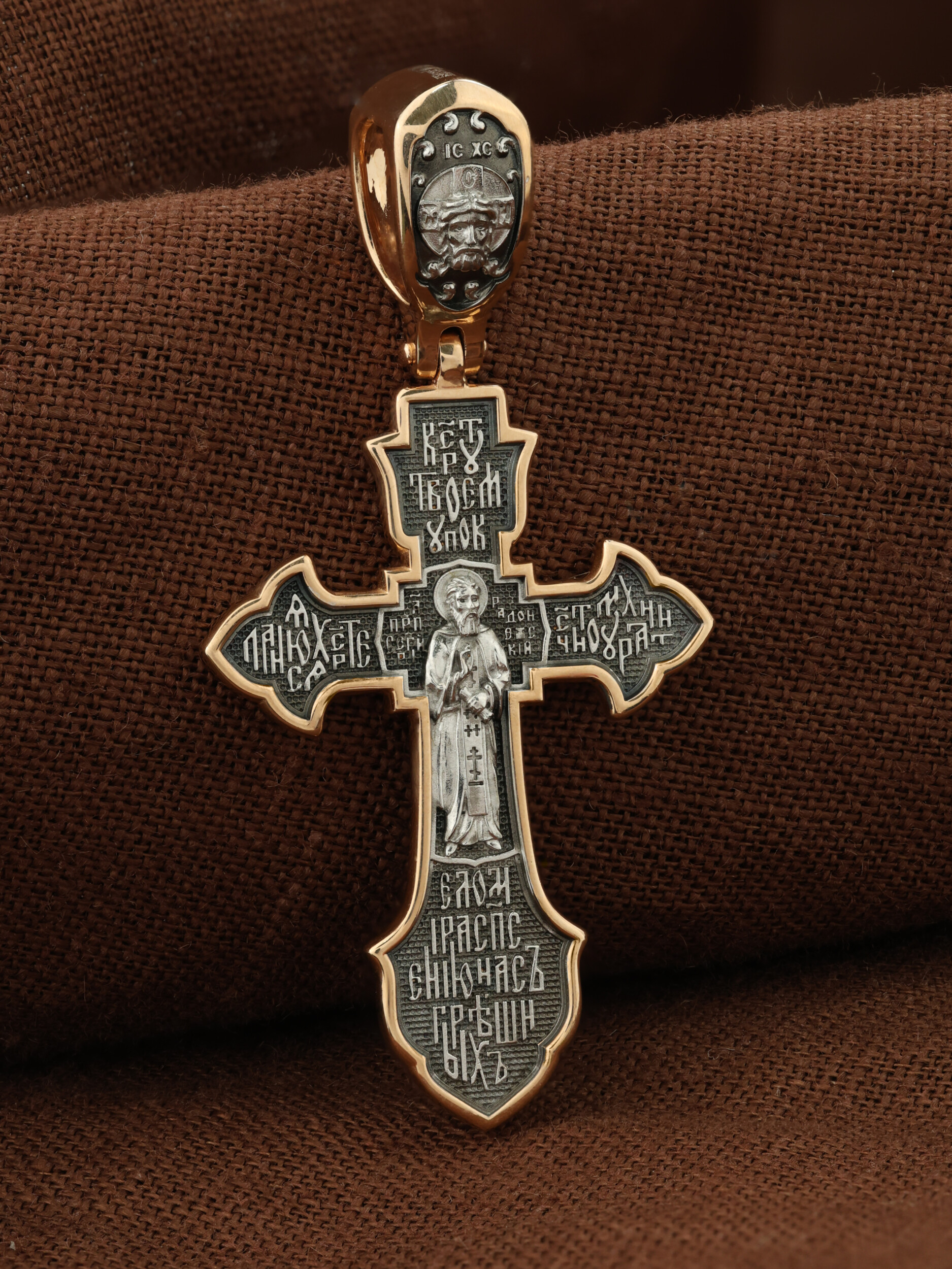 На лицевой стороне этого креста центральную часть занимает икона Распятия Христа — образ жертвы, принесенной Господом за грехи людей. Именно ко Христу, сошедшему на землю ради нашего спасения, возносятся все молитвы. Рядом с Его образом помещены слова — «НИКА» и «Царь Славы». Эти слова характеризуют Господа как Великого Архиерея, победителя смерти. Также Распятие сопровождается надписями, олицетворяющими Христа — это святое имя Христа «IC» (Иисус) «ХС» (Христос). Венчает лицевую сторону креста надпись «Царь Славы». На кулонном кольце помещено изображение Спаса Нерукотворного.