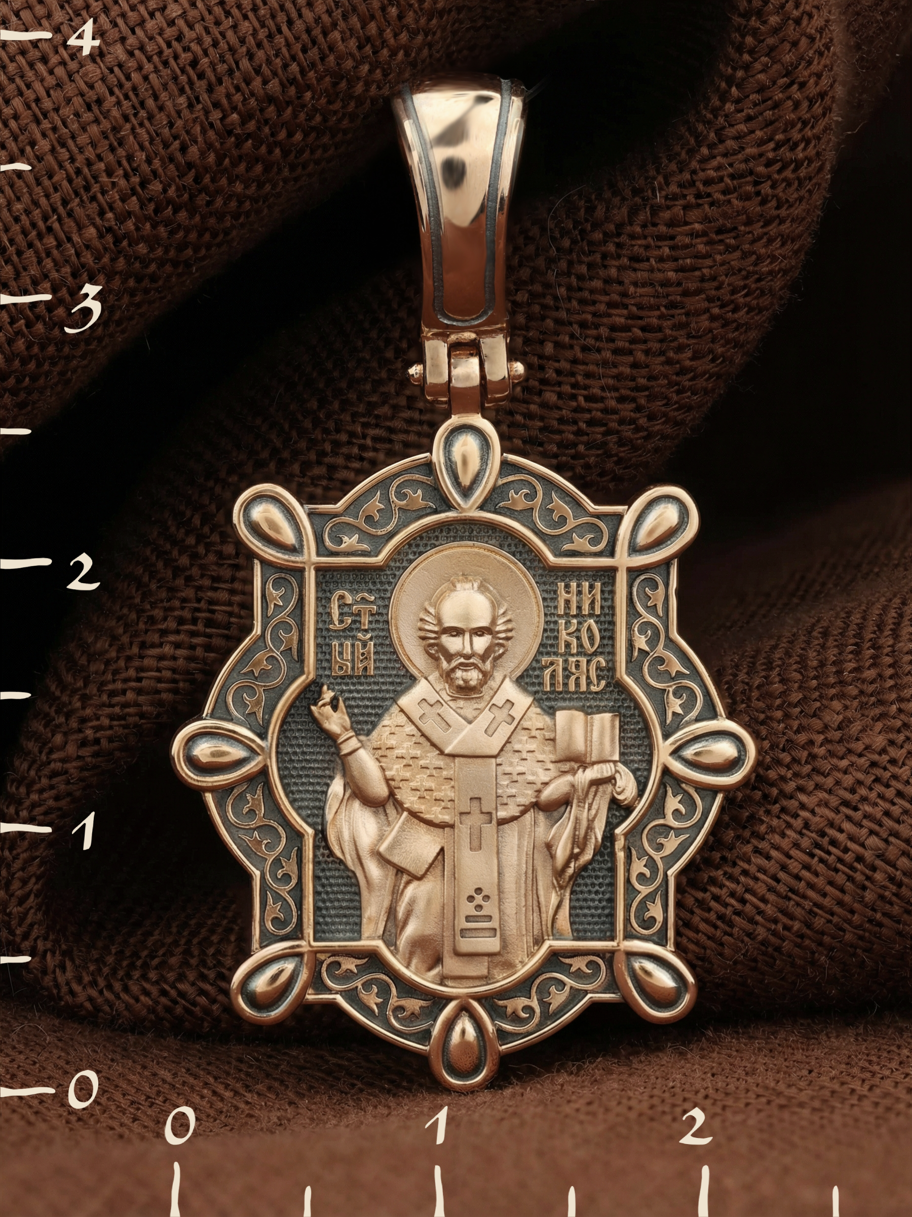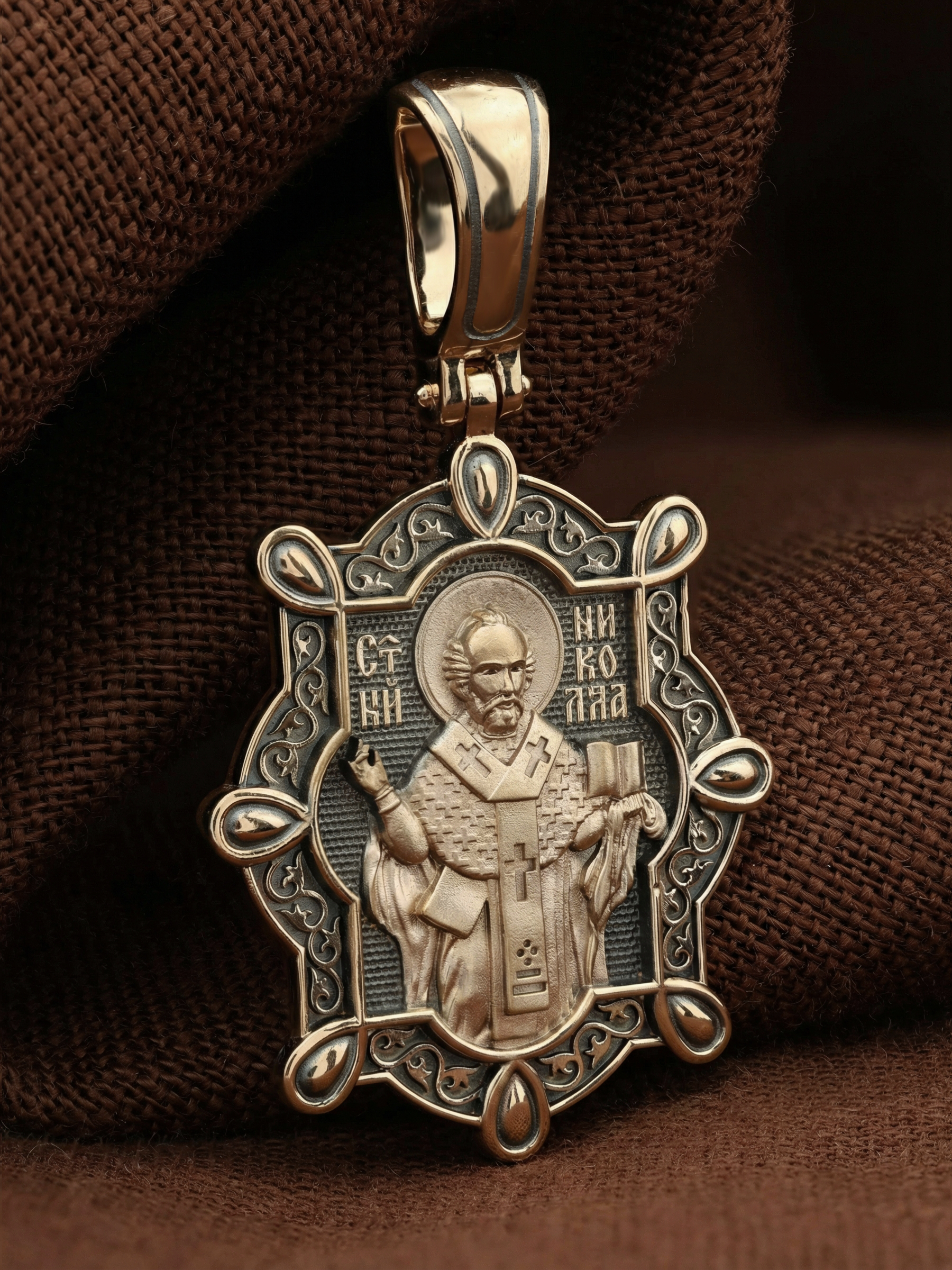 На лицевой стороне образка изображен Святитель Николай архиепископ Мир Ликийских, Чудотворец. Он является одним из самых почитаемых святых в православном мире. Святитель Николай родился во второй половине III века в Малой Азии в Ликийском городе Патары. Сохранилось Предание, что во время крещения он простоял в купели три часа. С детства Святитель избегал развлечений, любил молитву, прекрасно учился и проводил свободное время за чтением Священного писания. Приняв сан священника, святитель Николай стал проводить еще более строгую подвижническую жизнь. Вся жизнь святого Николая — это служение Богу. Он помогал сущим в бедах, укрощал штормы, спасал от потопления и выносил на сушу из глубины морской, освобождал из плена и приносил освобожденных домой, избавлял от темницы, освобождал от смерти, подавал различные исцеления: слепым — прозрение, глухим — слух, немым — дар слова.