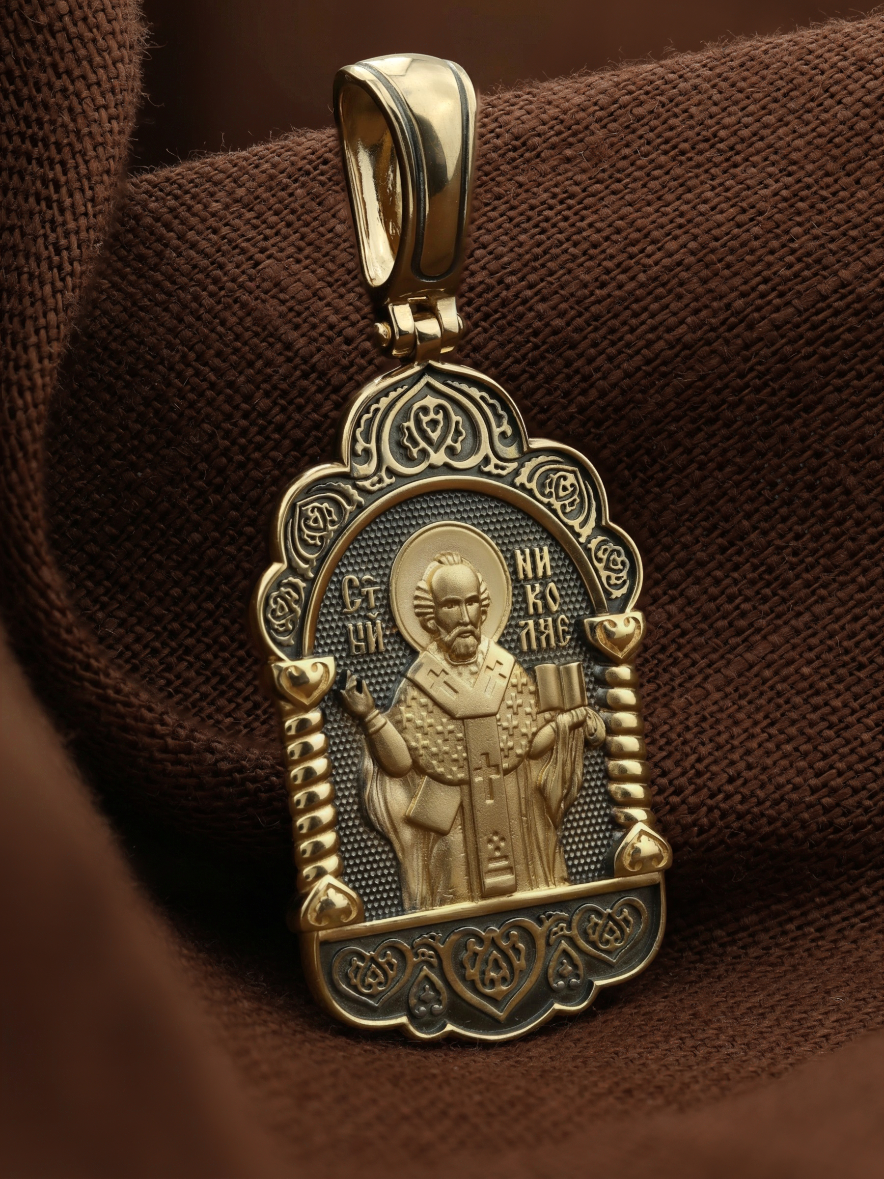 На лицевой стороне образка изображен Святитель Николай архиепископ Мир Ликийских, Чудотворец. Он является одним из самых почитаемых святых в православном мире. Святитель Николай родился во второй половине III века в Малой Азии в Ликийском городе Патары. С рождения Божий Угодник проявлял необыкновенные дарования. Сохранилось Предание, что во время крещения он, никем не поддерживаемый, простоял в купели три часа. Приняв сан священника, святитель Николай стал проводить еще более строгую подвижническую жизнь. Избранник Божий Николай стал вершиной всех добродетелей, поднятой до райской высоты. С кем из величайших праведников не сравнялся он образом духовной красоты, кому из них не последовал в своих деяниях и чудотворениях? Вся жизнь святого Николая — это служение Богу. Много великих и преславных чудес сотворил великий Святитель Николай Угодник. Он помогал сущим в бедах, укрощал штормы, спасал от потопления и выносил на сушу из глубины морской, освобождал из плена и приносил освобожденных домой, избавлял от уз и темницы, защищал от посечения мечом, освобождал от смерти и подавал многим различные исцеления, слепым прозрение, хромым хождение, глухим слух, немым дар слова.