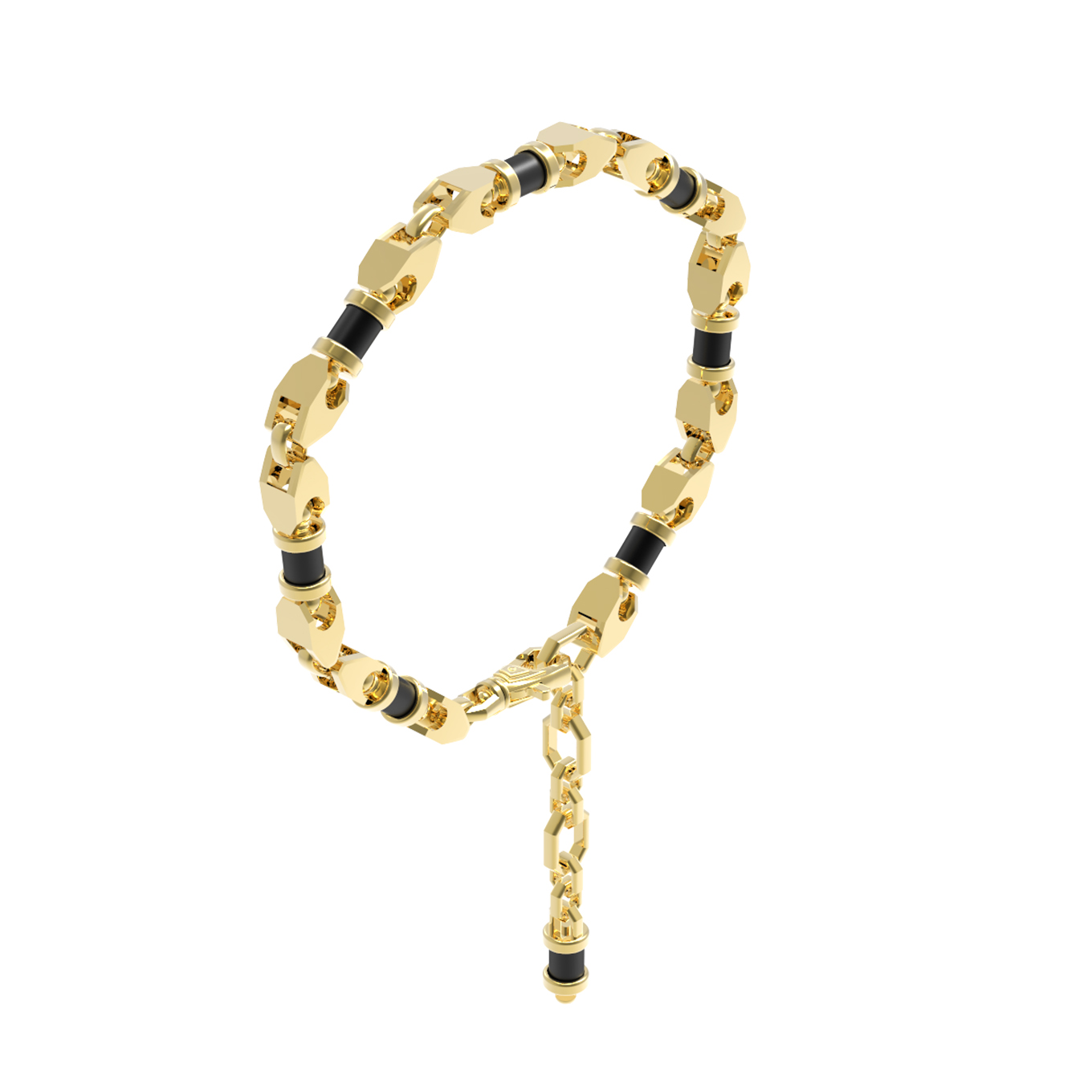 Особенностью этого ювелирного аксессуара является тщательно продуманная геометрия вставок. В браслете использовано 8 вставок из оникса, имеющих элегантную форму цилиндра. Эти детали гармонично интегрированы в конструкцию браслета, создавая динамичный и вместе с тем сдержанный визуальный ритм. Каждое звено выполнено с высоким вниманием к деталям, обеспечивая комфортную посадку на запястье и долговечность изделия в повседневной носке.
