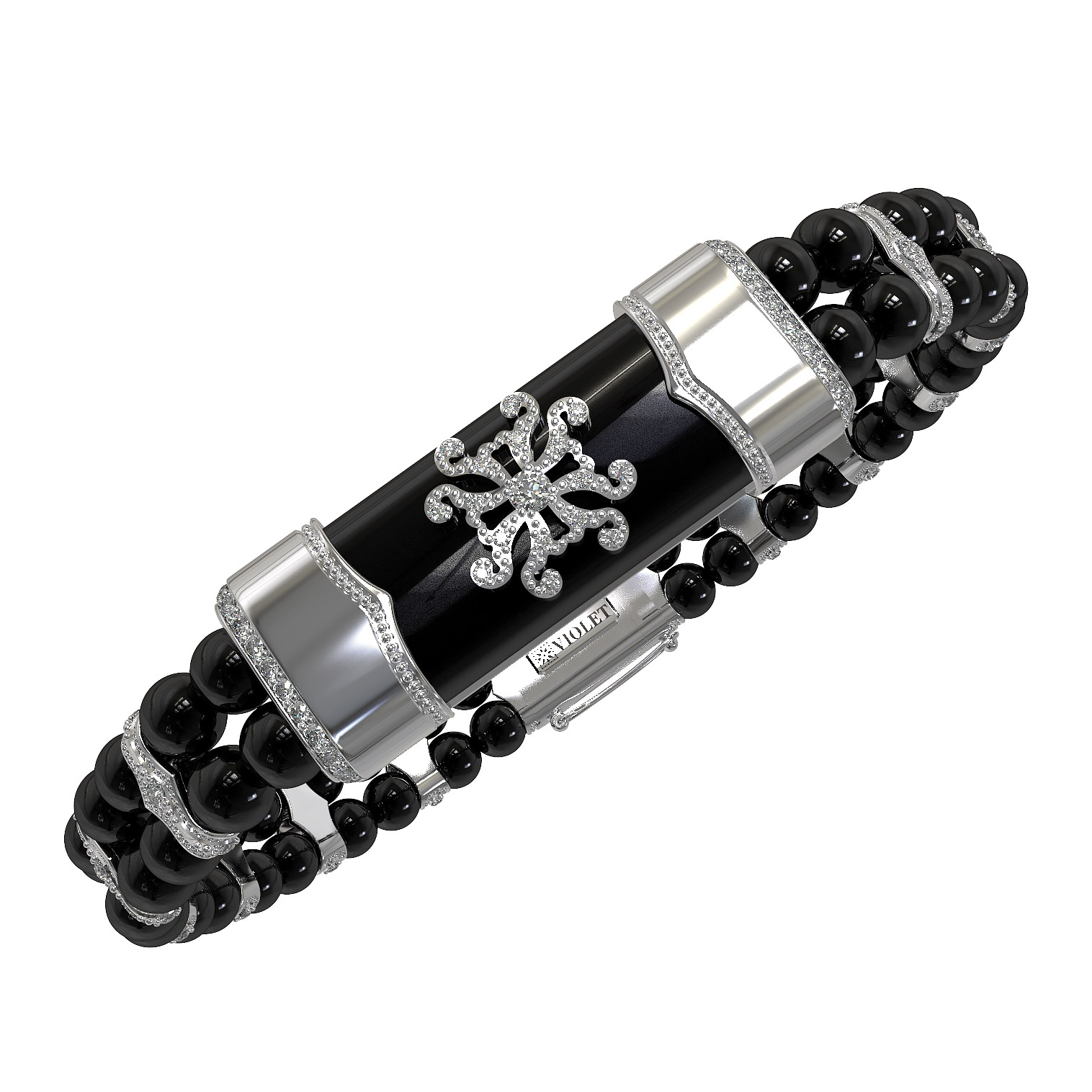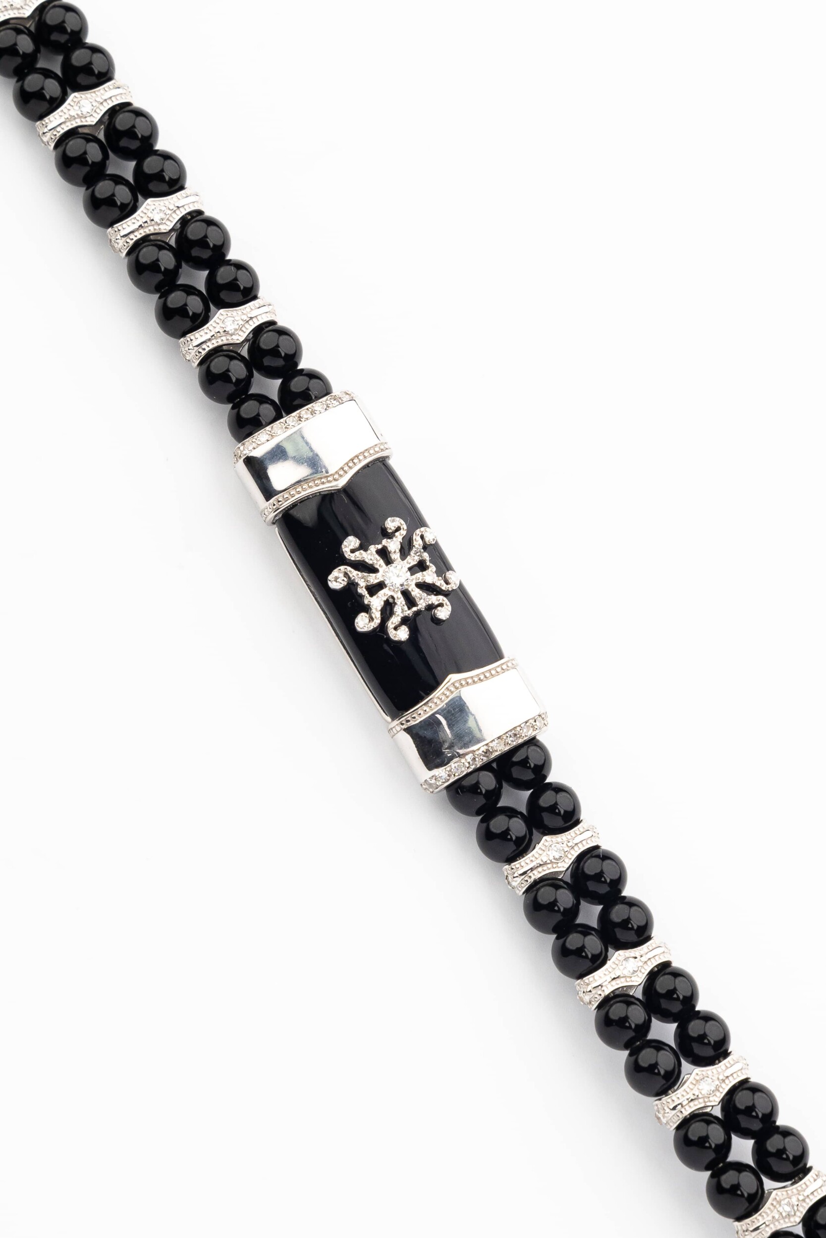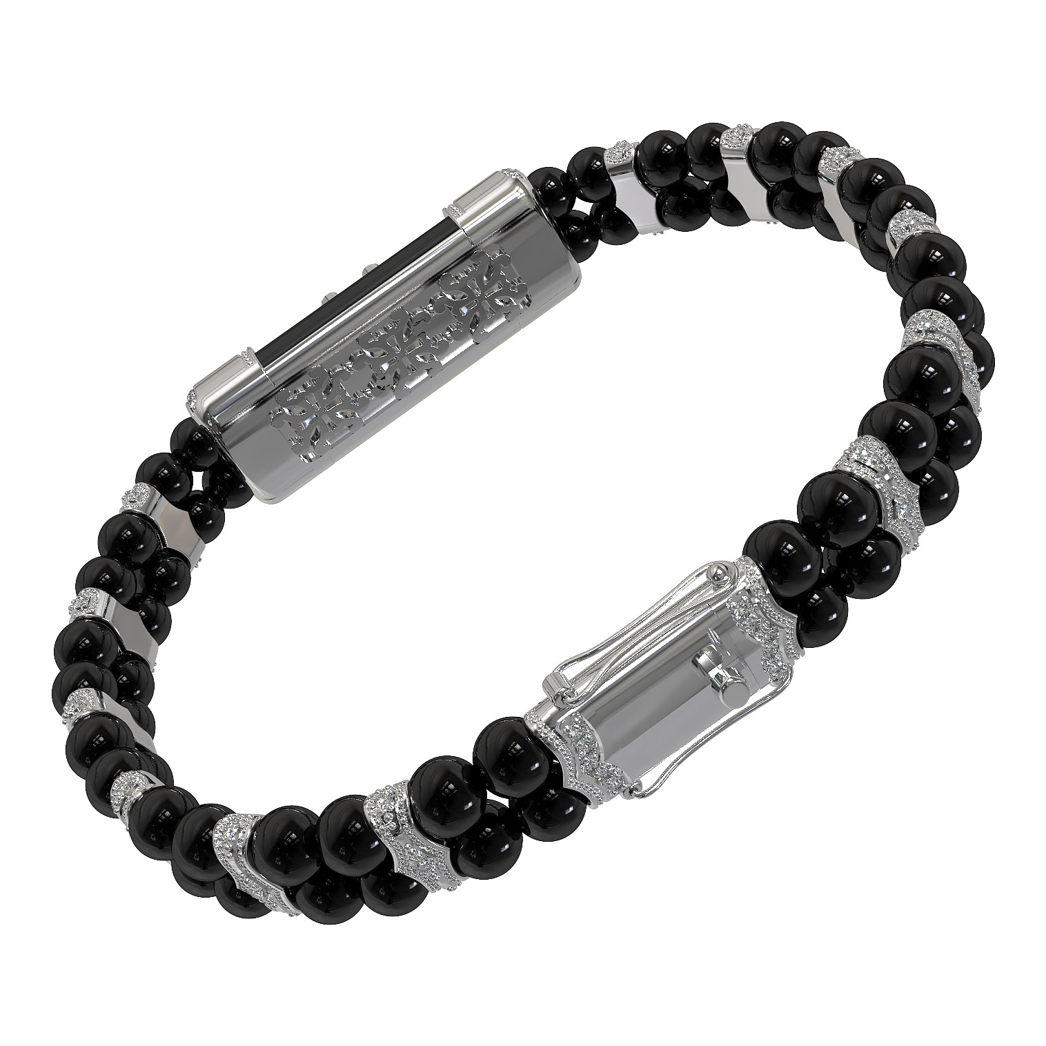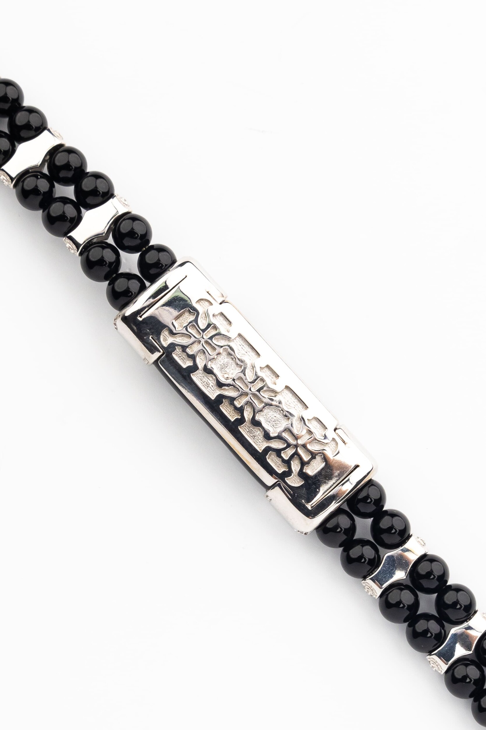 Центральным элементом композиции выступает глубокий черный оникс в форме изящных бусин, которые создают завораживающий визуальный ритм. Особое очарование браслету придает сочетание оникса с сиянием белого золота и россыпью 438 бриллиантов, инкрустированных в изделие. Круглая огранка камней обеспечивает непревзойденную игру света, превращая украшение в настоящий шедевр ювелирного мастерства.