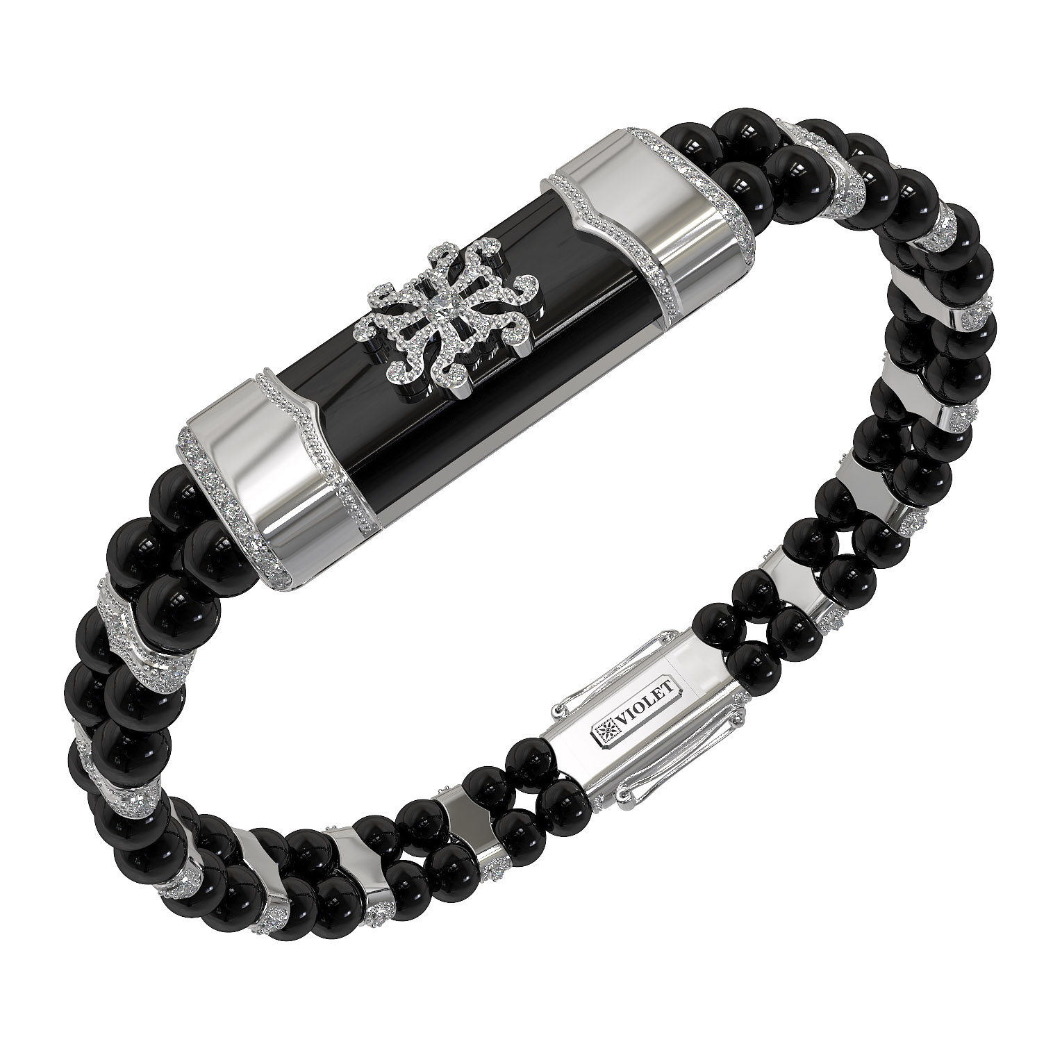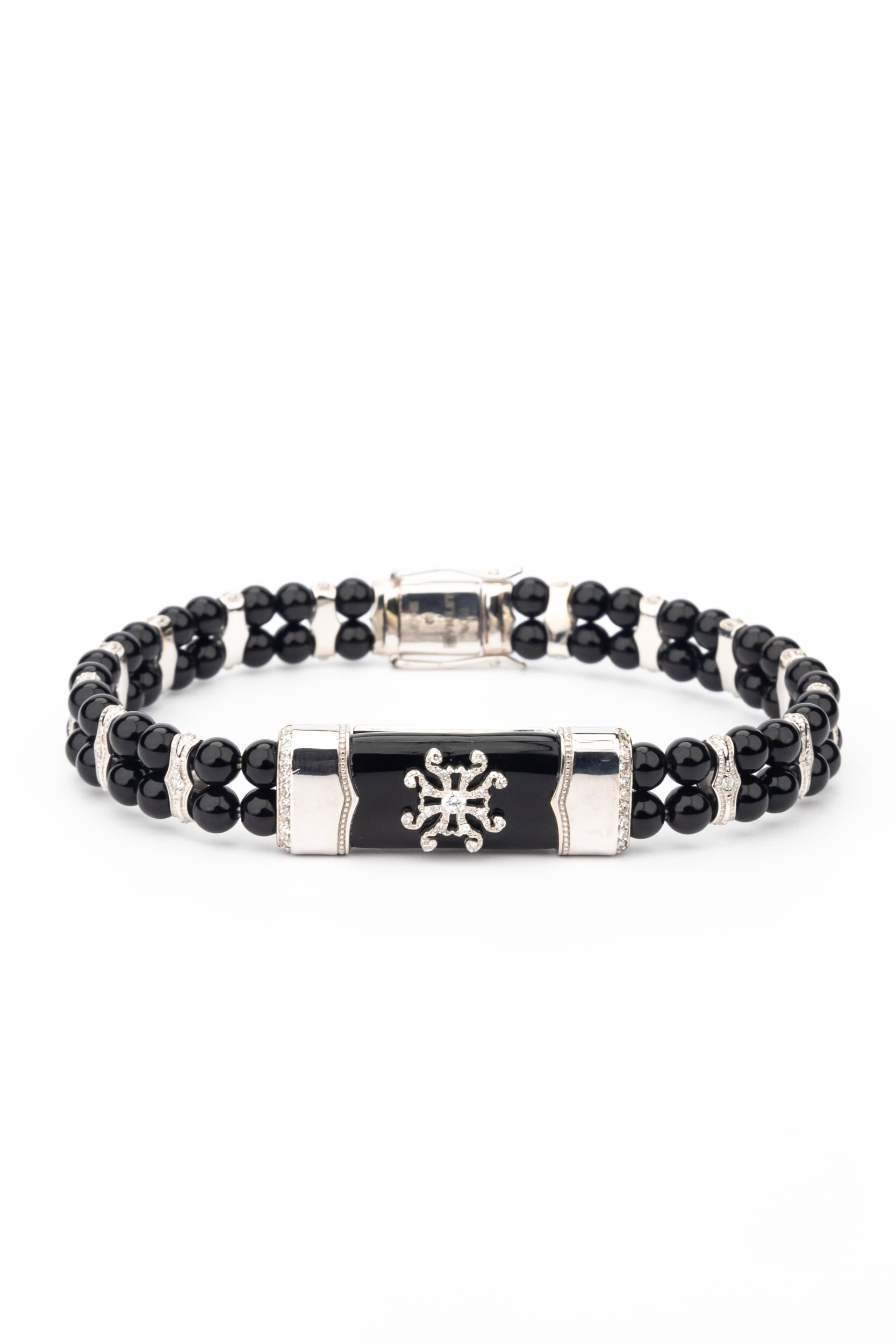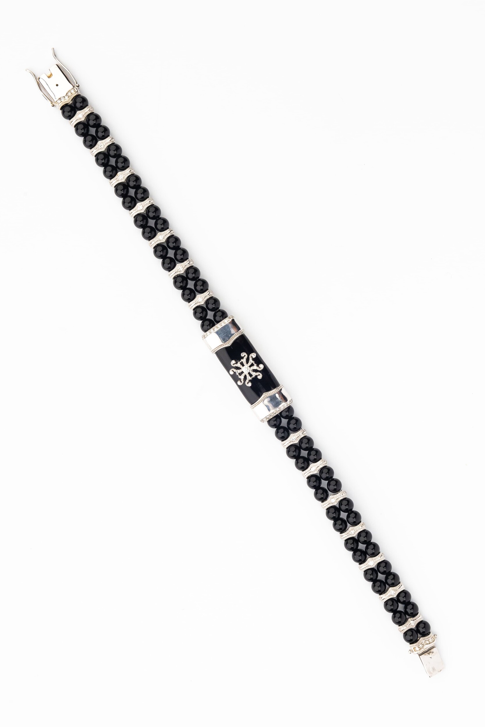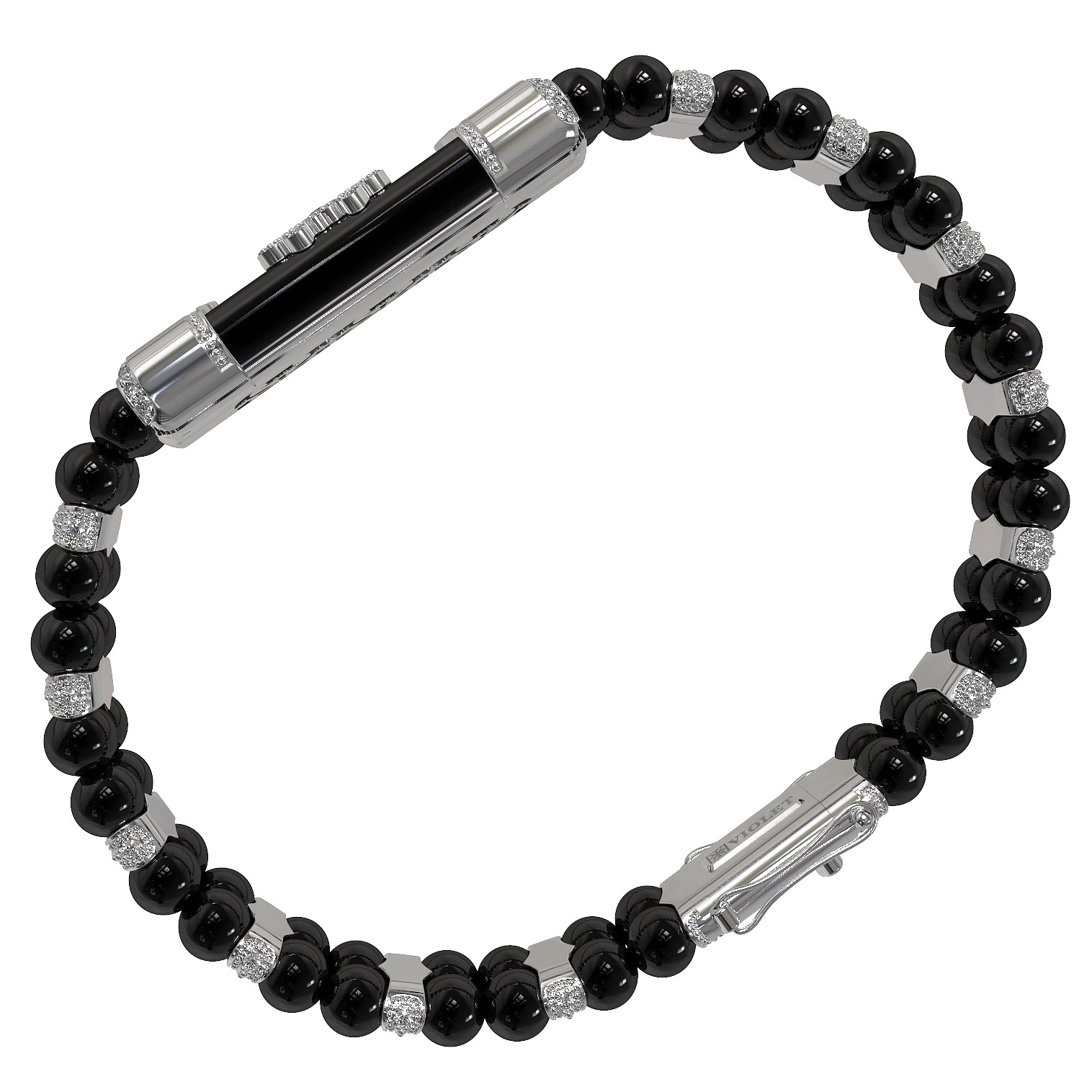 Центральным элементом композиции выступает глубокий черный оникс в форме изящных бусин, которые создают завораживающий визуальный ритм. Особое очарование браслету придает сочетание оникса с сиянием белого золота и россыпью 438 бриллиантов, инкрустированных в изделие. Круглая огранка камней обеспечивает непревзойденную игру света, превращая украшение в настоящий шедевр ювелирного мастерства.