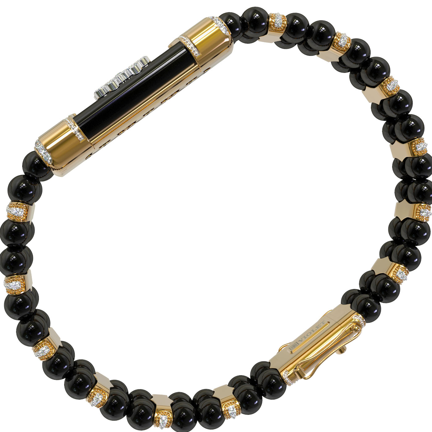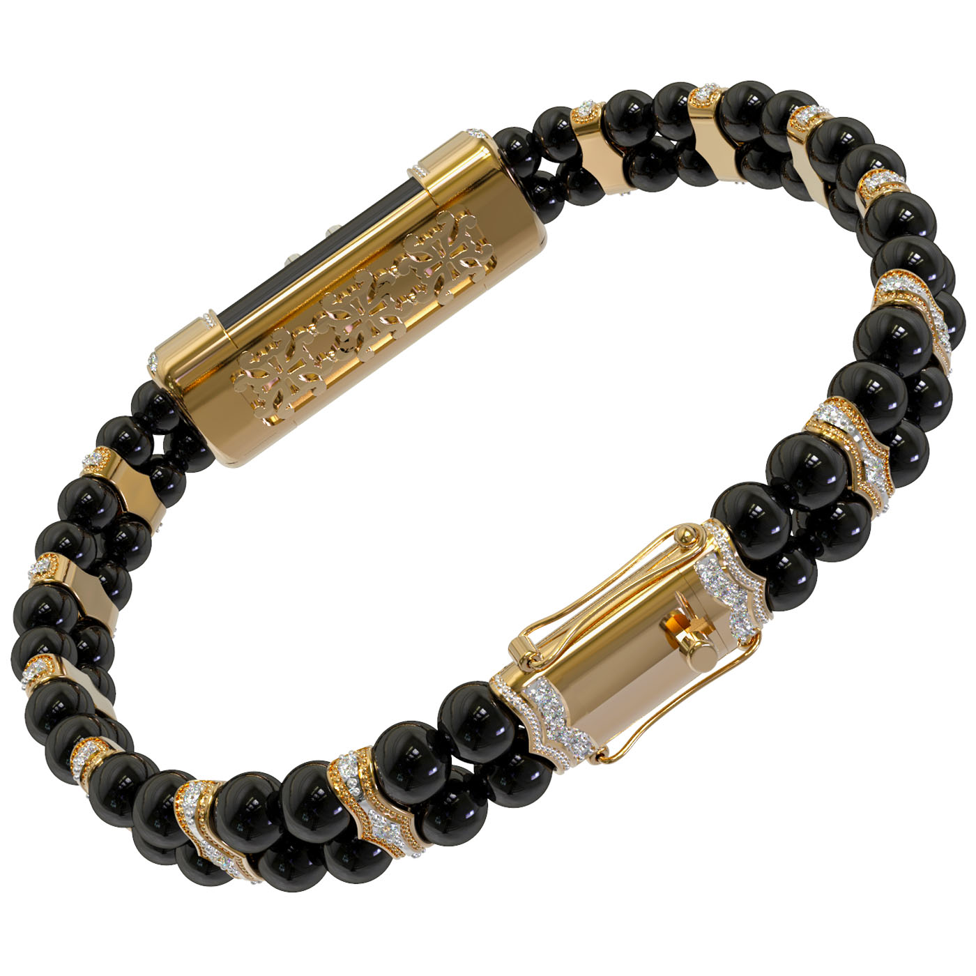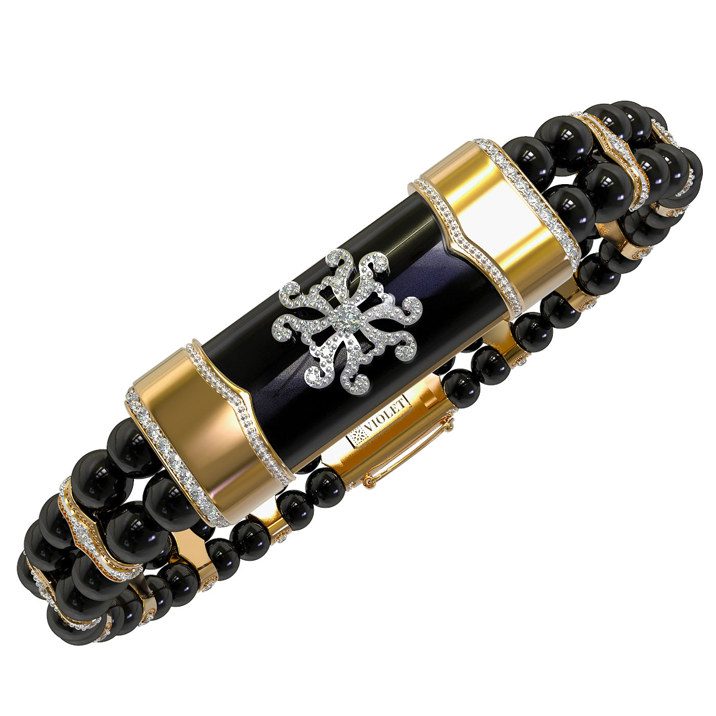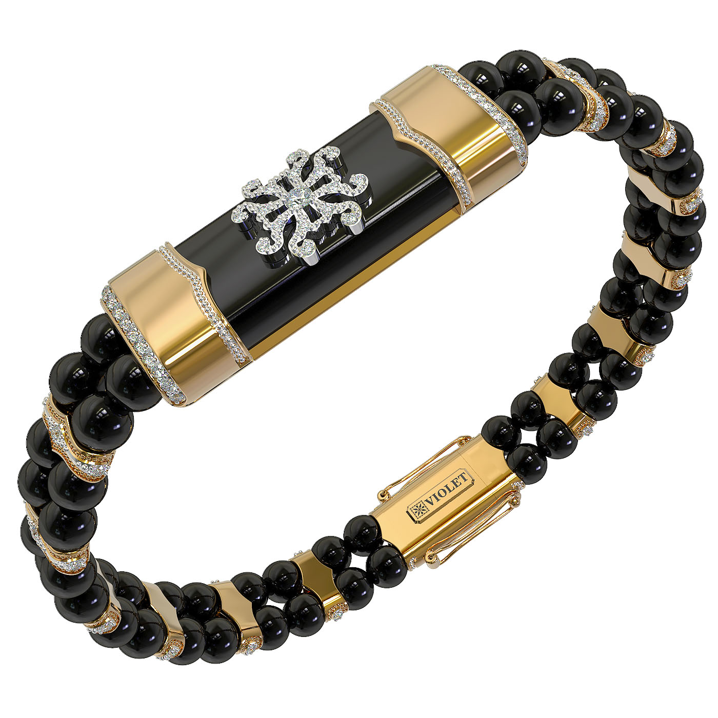 Дизайн изделия впечатляет проработкой деталей: основу составляют гладкие вставки из оникса в форме бусин, дополненные вставками круглой формы. Центральный элемент и декор браслета инкрустированы 438 бриллиантами, которые привносят сияние и роскошь. Белые сверкающие камни создают эффектный контраст с черными вставками, делая аксессуар по-настоящему притягательным. Мастерское исполнение гарантирует комфортную посадку на запястье.