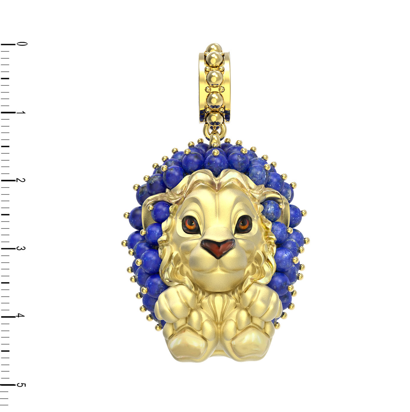 Особую выразительность подвеске придает сочетание ювелирных вставок: глубокий синий цвет натурального лазурита подчеркнут мастерским использованием эмали. Грива льва оформлена 48 вставками из лазурита круглой формы — бусина, которые создают эффектный объемный контур. Разноцветные акценты, достигнутые благодаря эмалевому покрытию, делают облик хищника живым и детализированным.