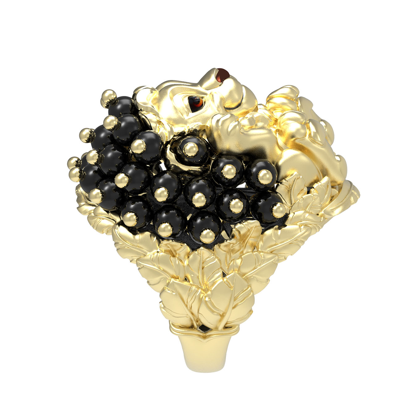 Массивное украшение изготовлено из качественного лимонного золота 585 пробы. Особую эстетику кольцу придает обрамление из 35 вставок оникса черного цвета, выполненных в форме аккуратных бусин, которые создают эффектную игру контрастов. Это изделие универсально и подойдет как для женщин, так и для мужчин, предпочитающих смелые и статусных аксессуары. При желании данное кольцо можно дополнить другими украшениями, собрав полноценный комплект.