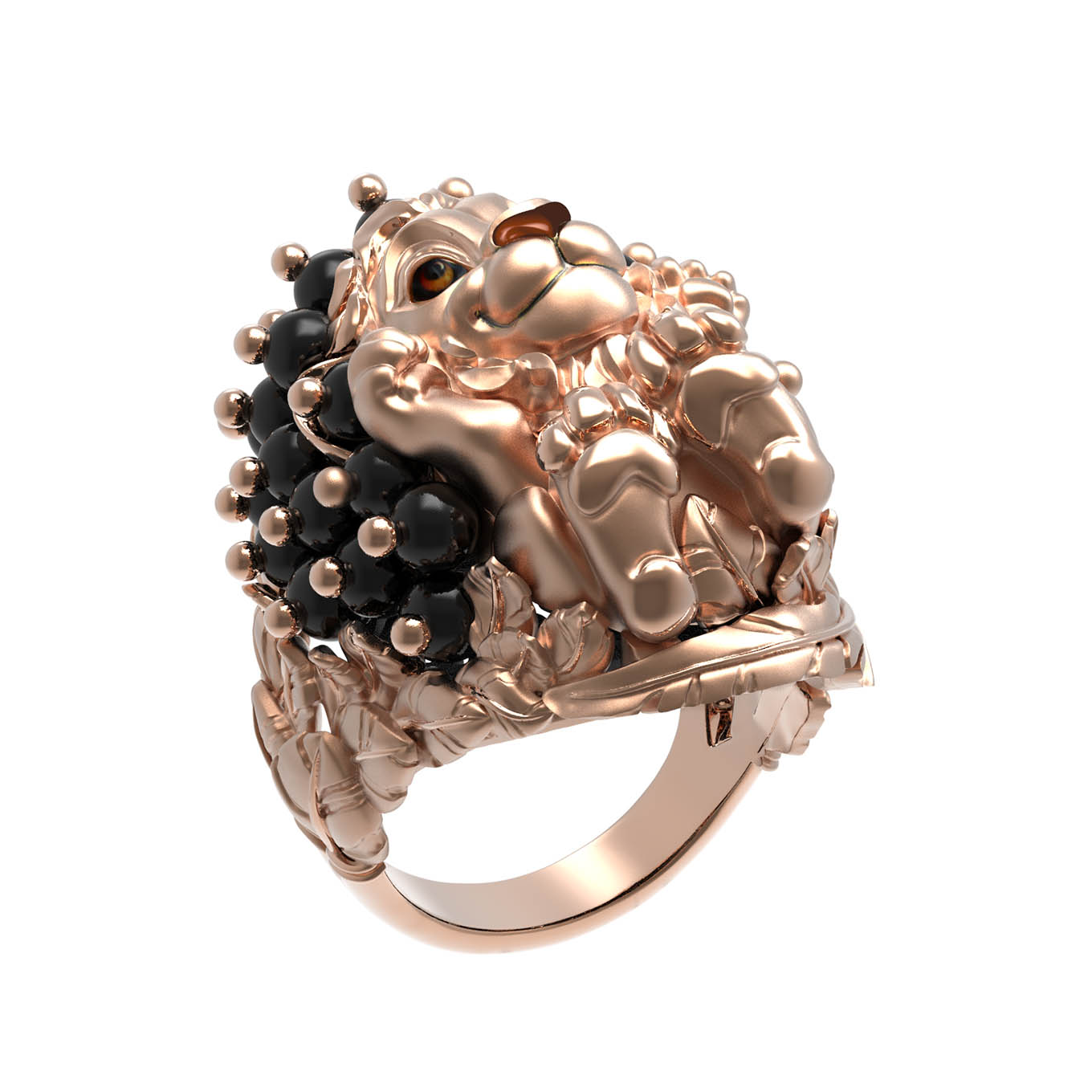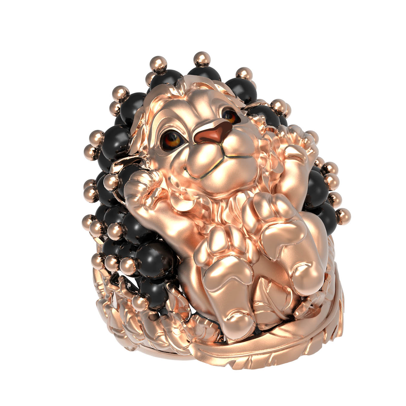 Мастерство ювелиров позволило гармонично соединить металл с изысканным декором: изделие украшено 35 вставками из черного оникса в форме бусин. Контрастное сочетание красного золота и темного оникса создает выразительный визуальный эффект. Дополнительную глубину и художественную выразительность придает вставка из цветной эмали, подчеркивающая детализированный образ льва. Это стильное кольцо одинаково хорошо подходит как для женщин, так и для мужчин, предпочитающих необычные и премиальные аксессуары.