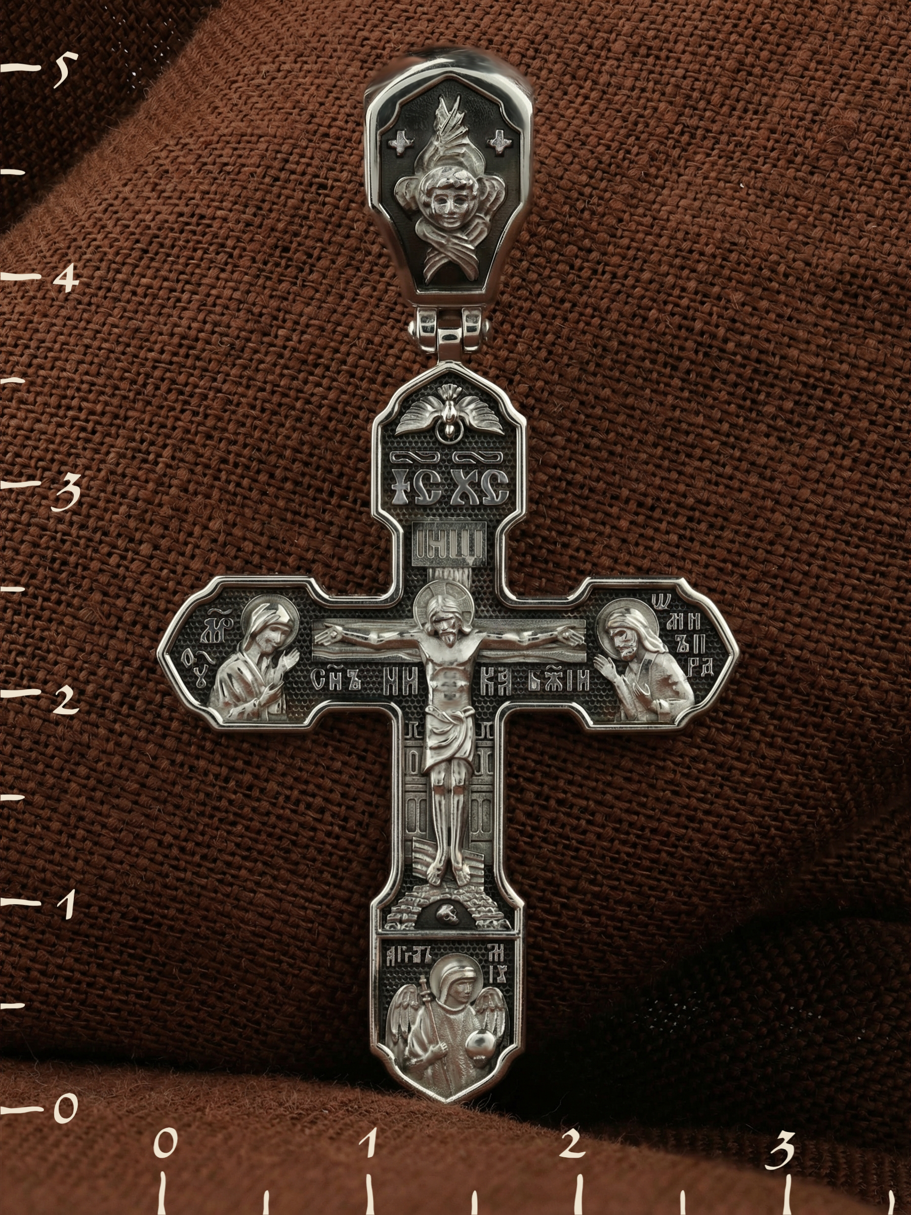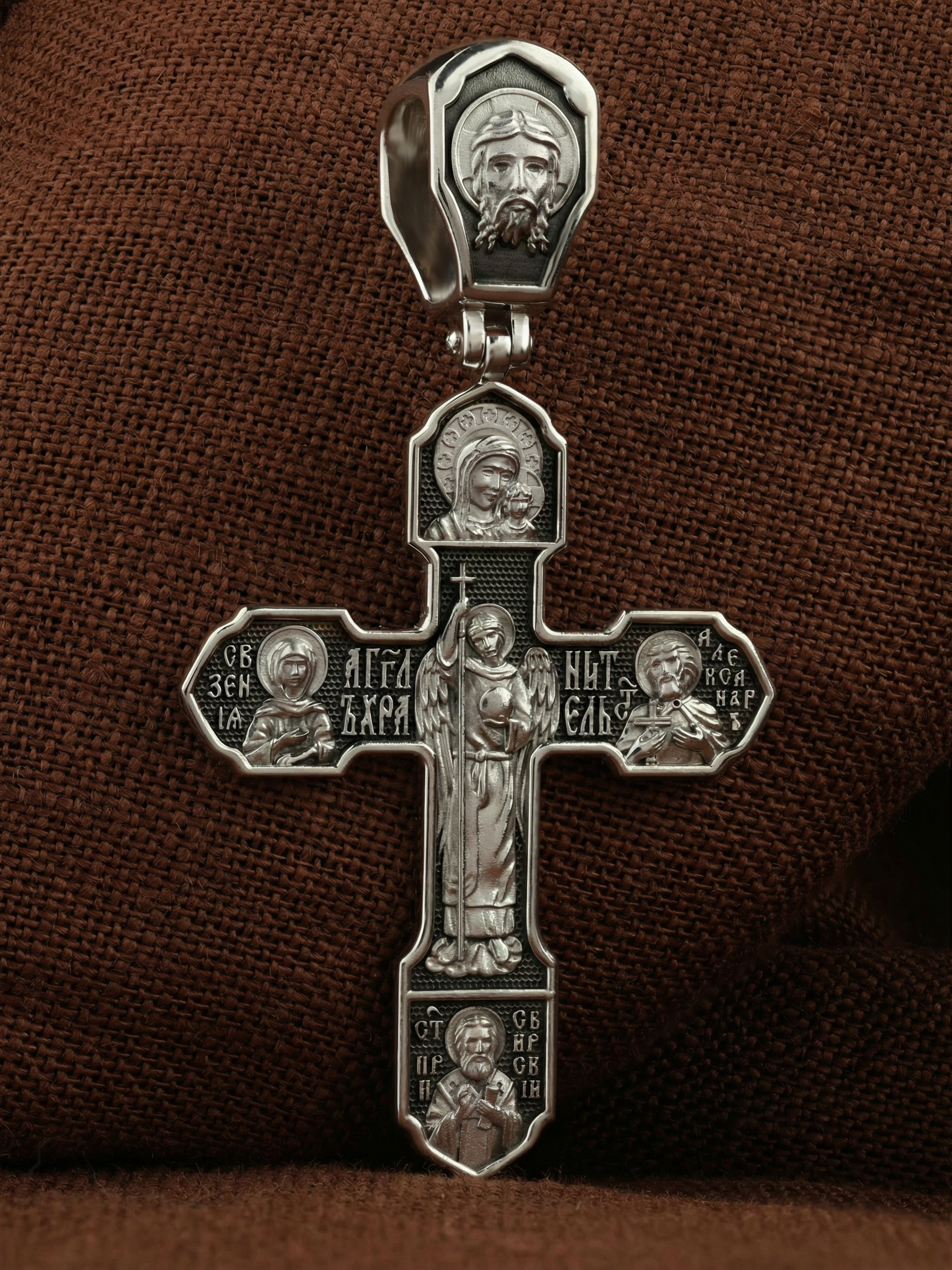 На лицевой стороне изображено Распятие Господа Иисуса Христа, над вершиной которого помещены титлы Его святого имени — «ИС ХС». Под основной перекладиной надписи — «НИКА», что в переводе с греческого означает «победитель», и словосочетание «СЫН БОЖИЙ», что означает божественную природу Иисуса Христа. С двух сторон Христу предстоят Пресвятая Богородица и св. Андрей Первозванный. Внизу — образ Архангела Михаила, могучего защитника от злых сил. Это он низверг дьявола и встал во главе ангелов для борьбы с бесовскими силами. Его имя означает «Кто яко Бог?».