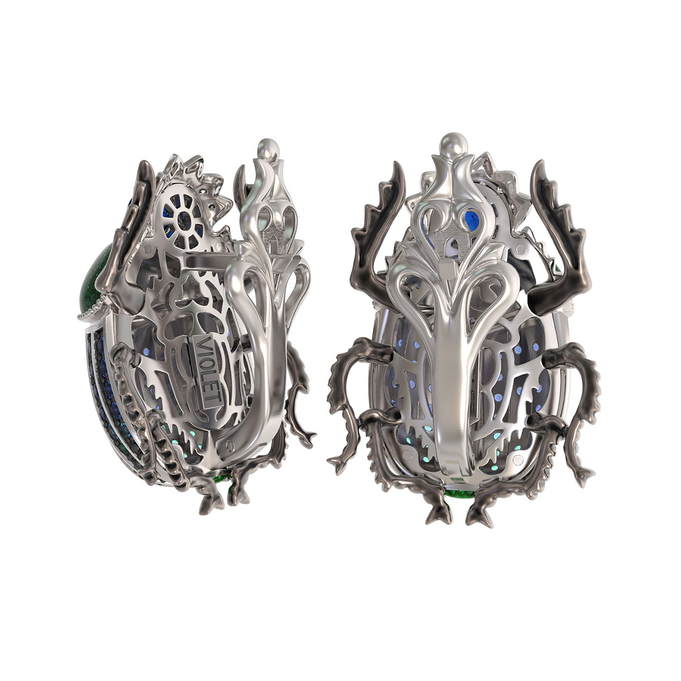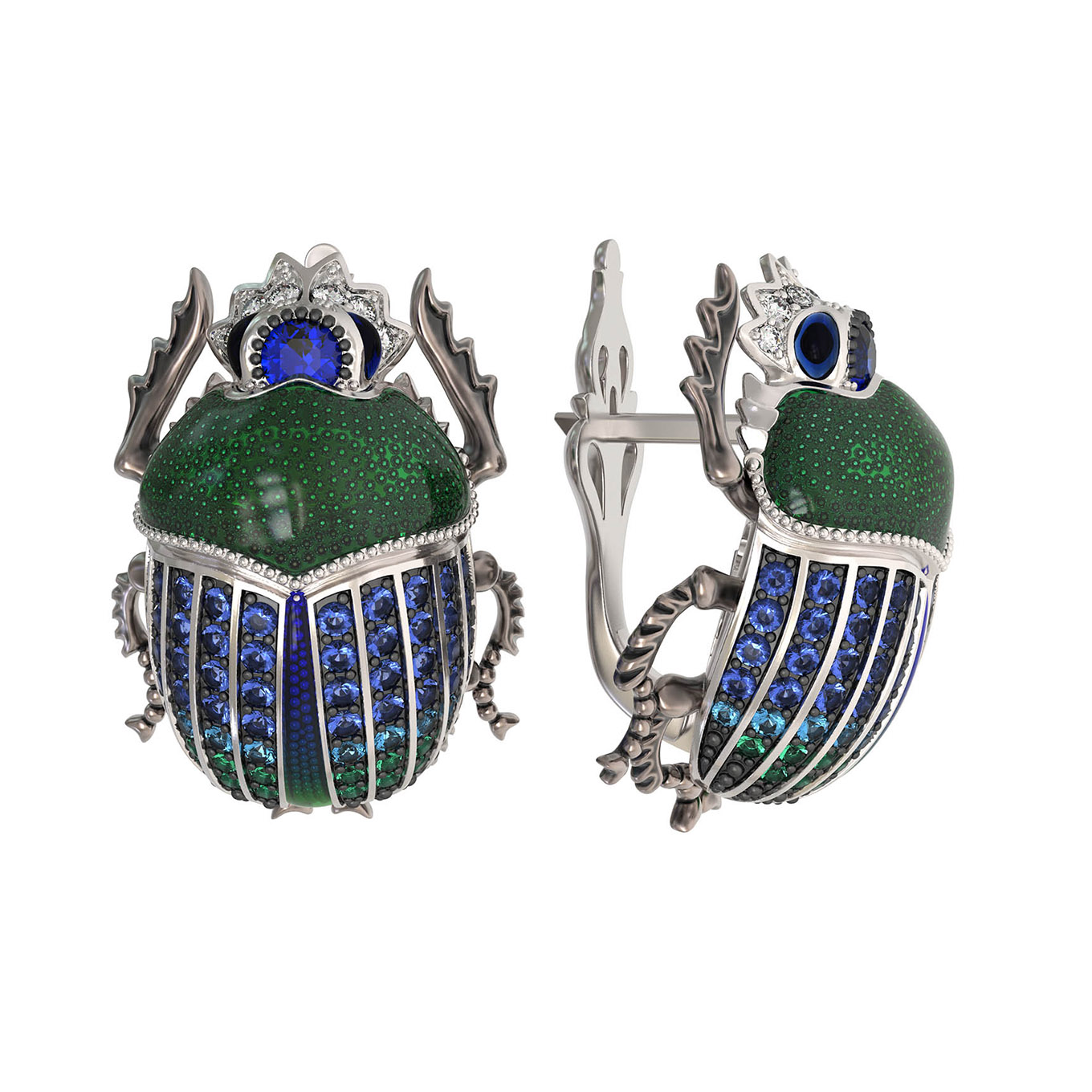 Эффектные серьги из белого золота 585 пробы из коллекции De Luxe — Скарабеи станут центральным акцентом вашего образа. Дизайн изделия вдохновлен таинственным миром природы, воплощая в себе грацию и загадочность насекомых. Детализированная форма скарабея выполнена с особым вниманием к каждому элементу, создавая уникальное ювелирное украшение, подходящее как для женщин, так и для мужчин, которые ценят смелые и концептуальные аксессуары.