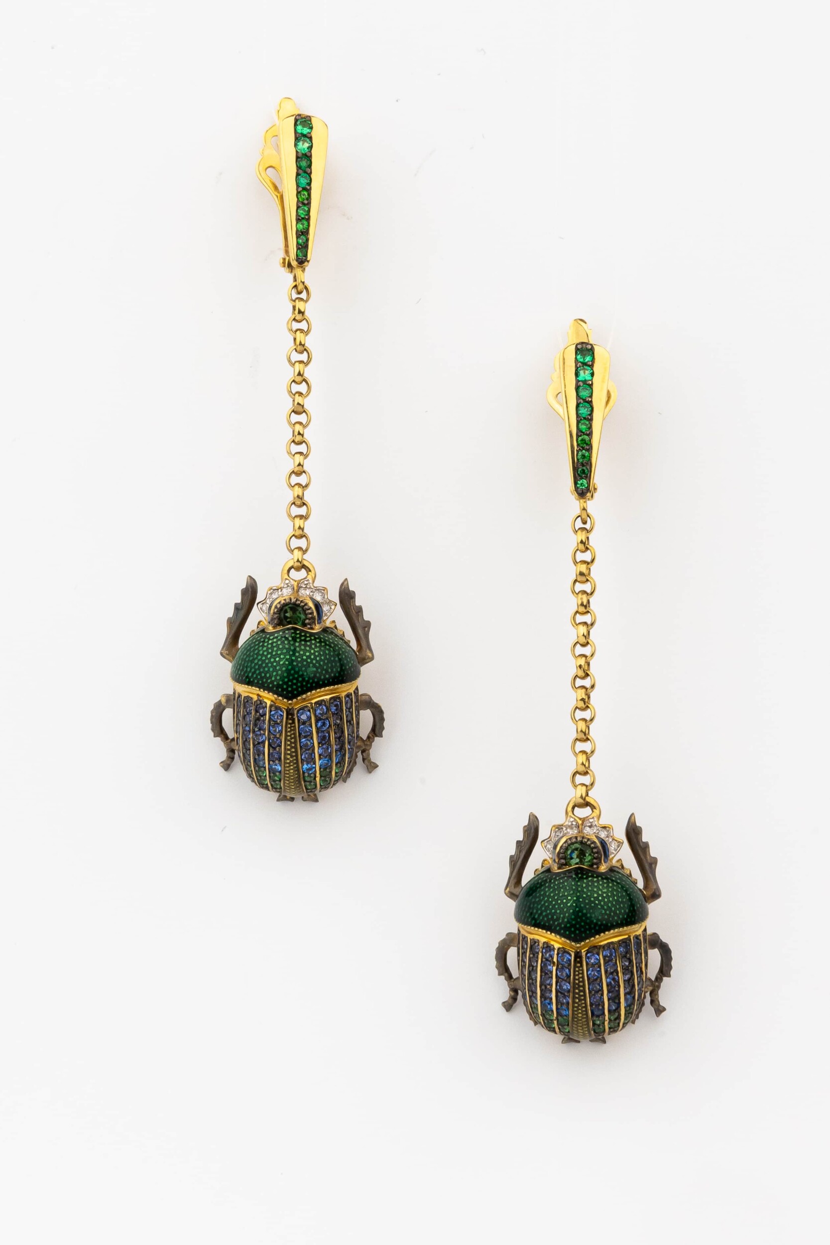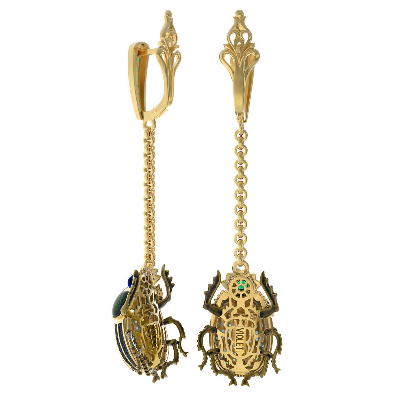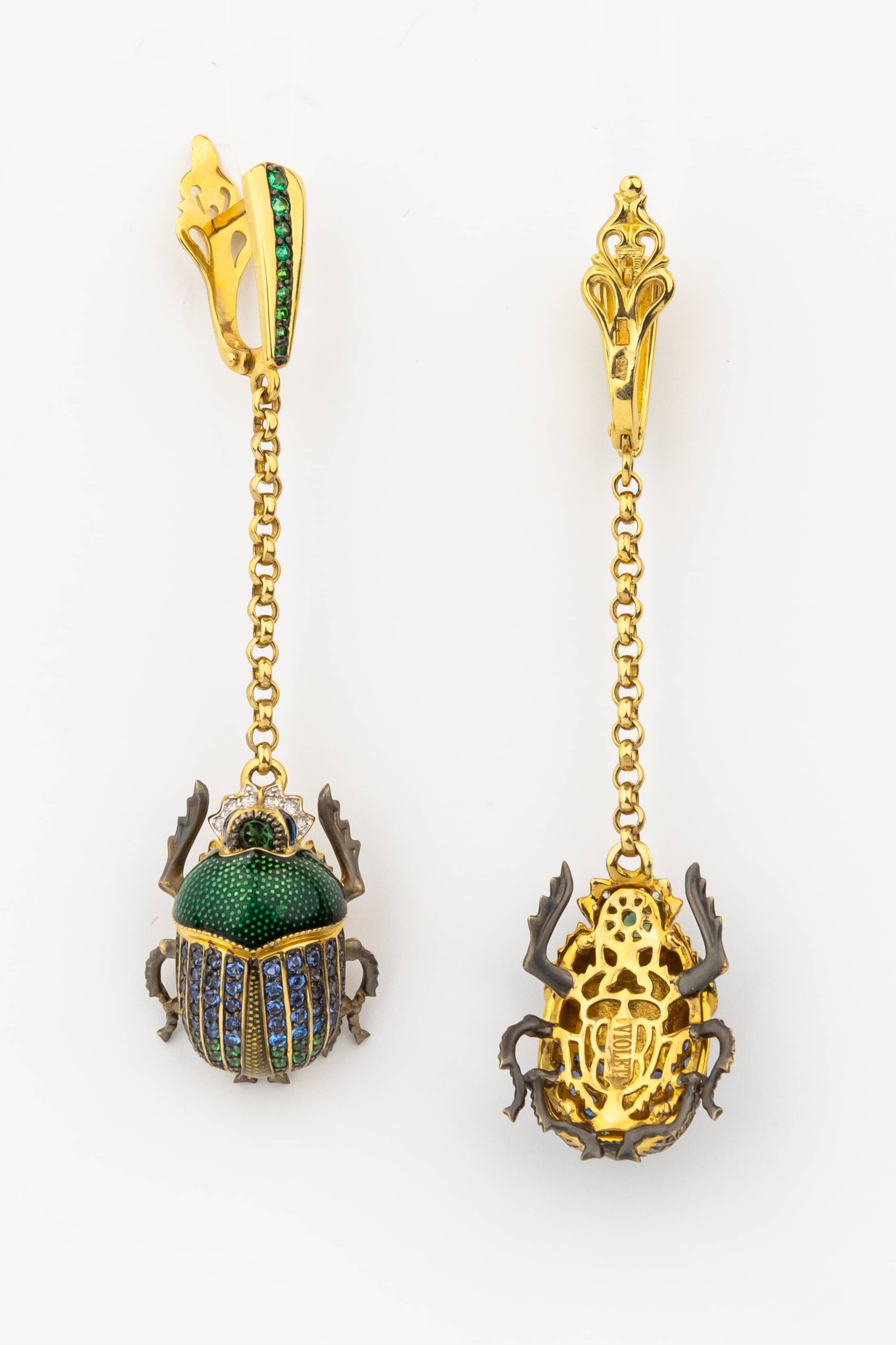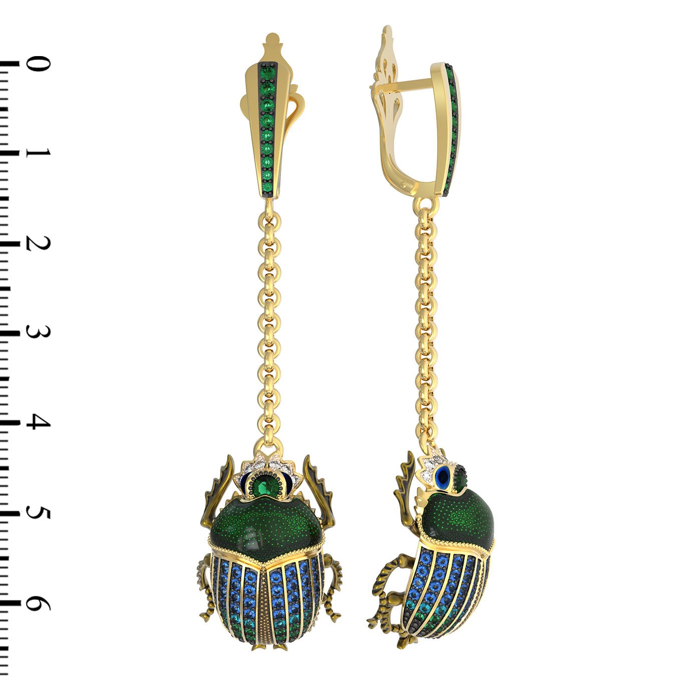 Серьги из лимонного золота 585 пробы c эмалью, фианитом, турмалином и сапфиром