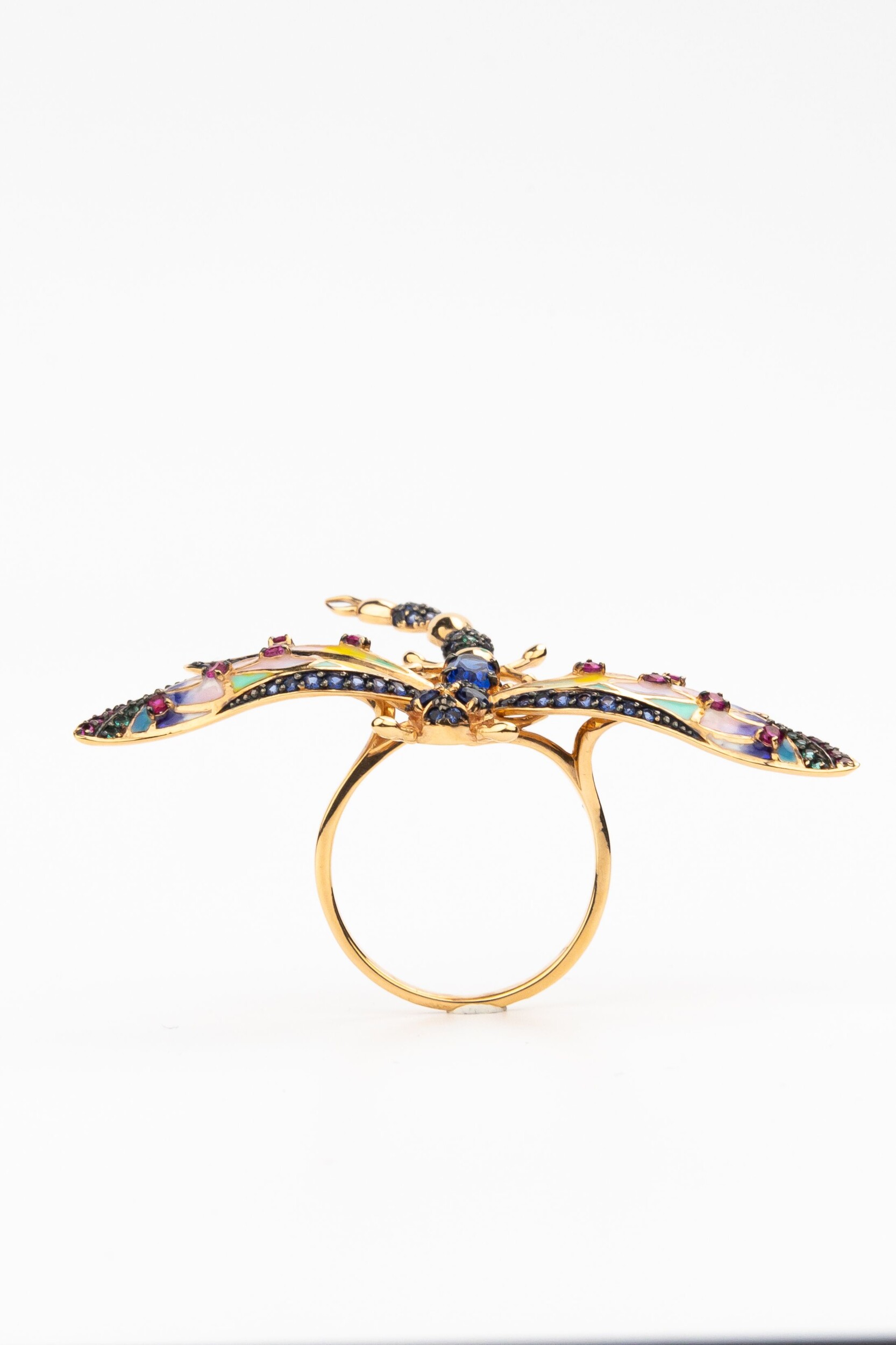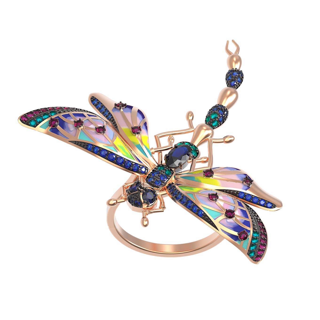 Кольцо из красного золота 585 пробы c фианитом, рубином, сапфиром и эмалью