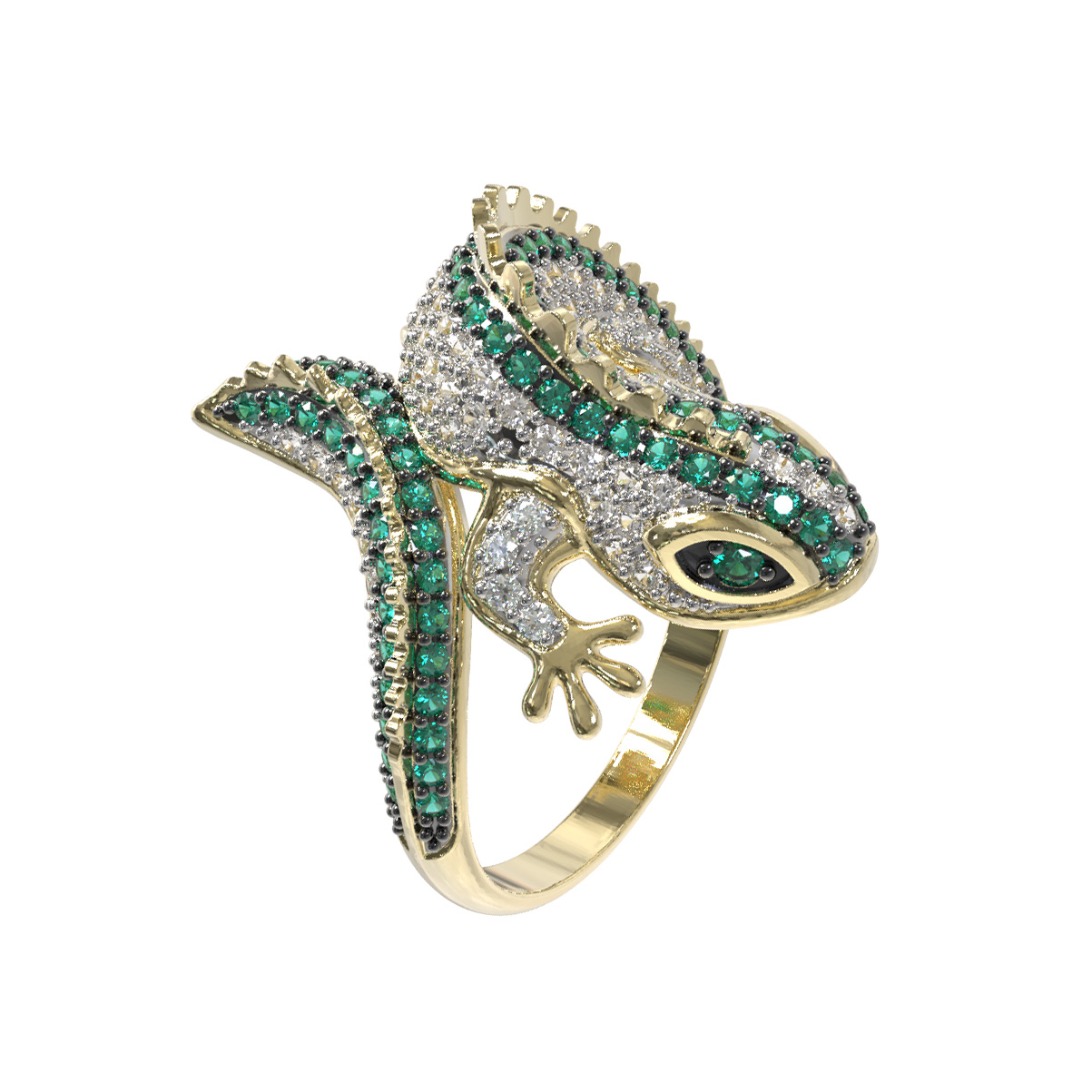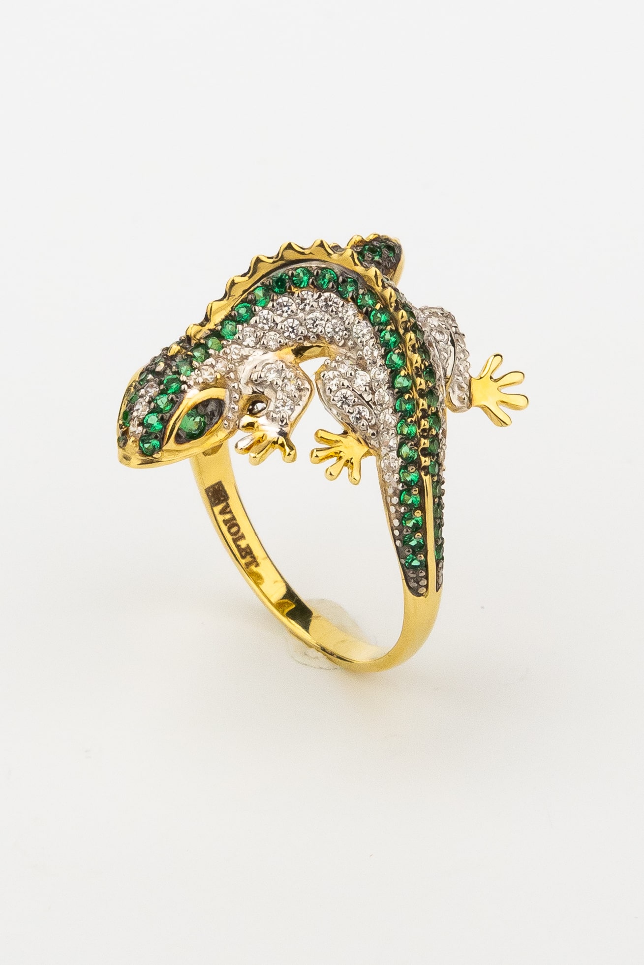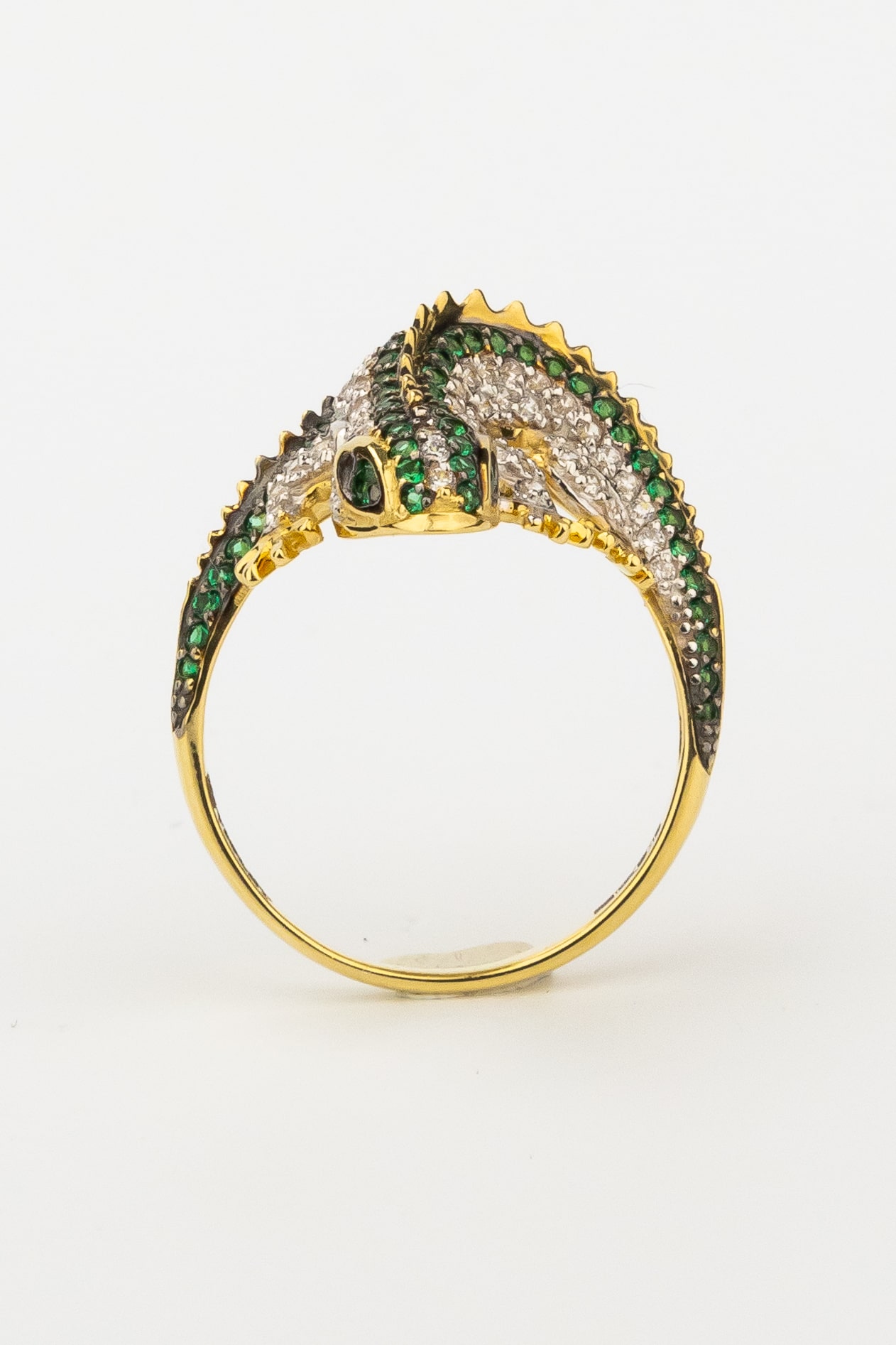 Роскошь изделия подчеркивается богатой инкрустацией: кольцо украшают 174 фианита круглой формы. Контрастное сочетание сияющих камней и благородного оттенка лимонного золота дополняется вставками насыщенного зелёного цвета, которые придают украшению особый шарм и выразительность. Тщательная проработка деталей делает это кольцо настоящим произведением ювелирного искусства.