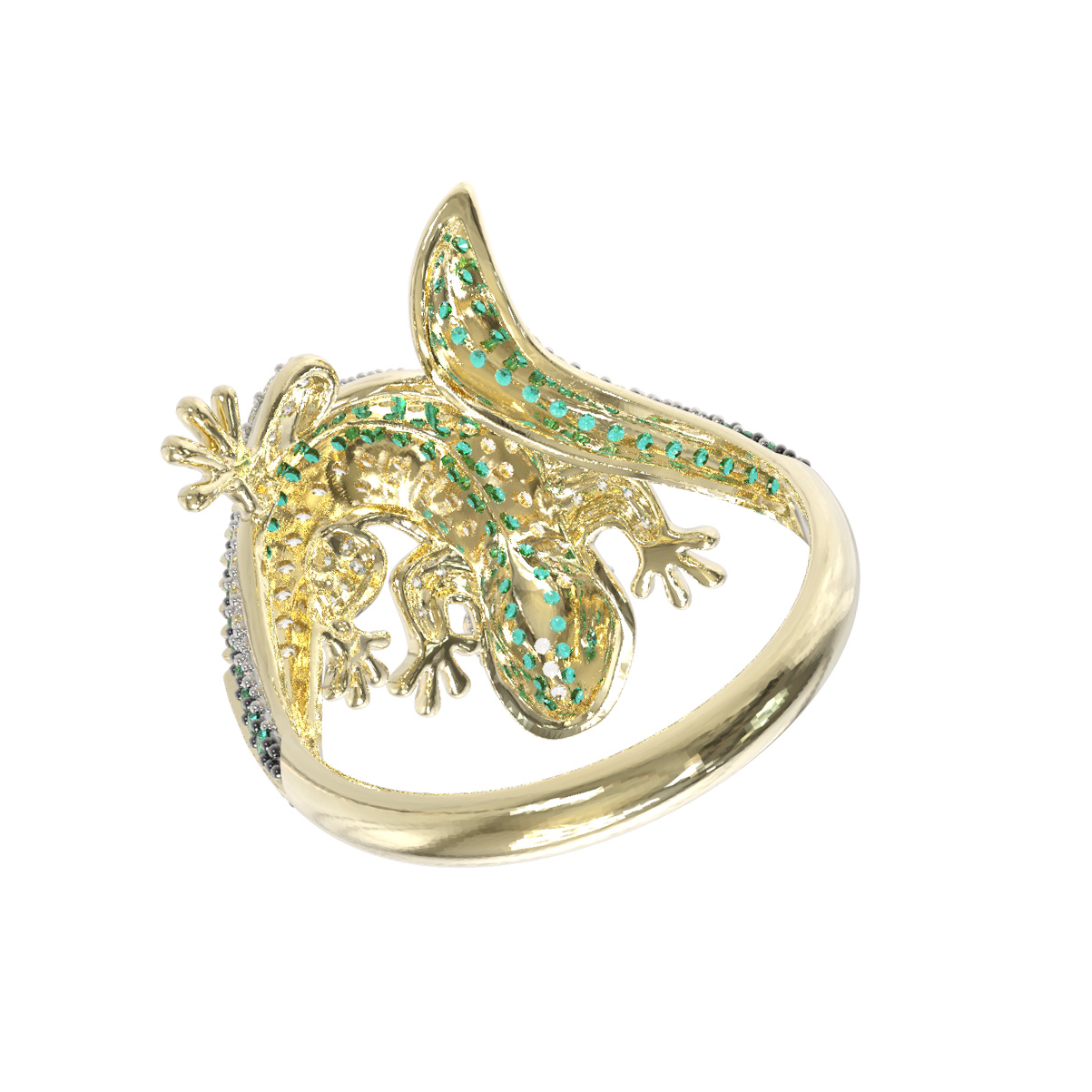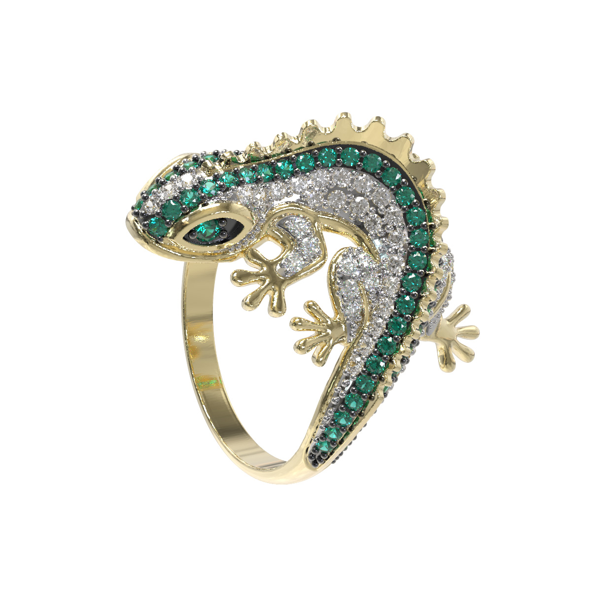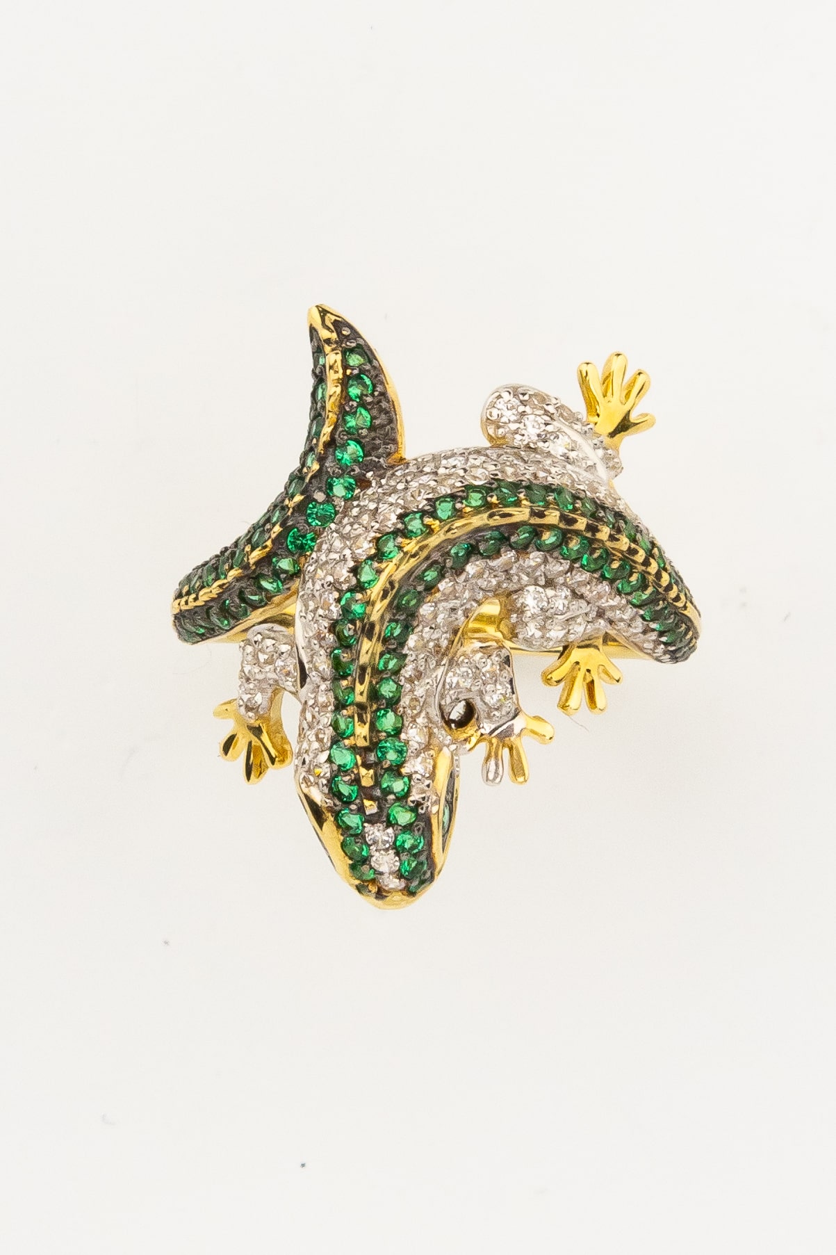 Роскошь изделия подчеркивается богатой инкрустацией: кольцо украшают 174 фианита круглой формы. Контрастное сочетание сияющих камней и благородного оттенка лимонного золота дополняется вставками насыщенного зелёного цвета, которые придают украшению особый шарм и выразительность. Тщательная проработка деталей делает это кольцо настоящим произведением ювелирного искусства.