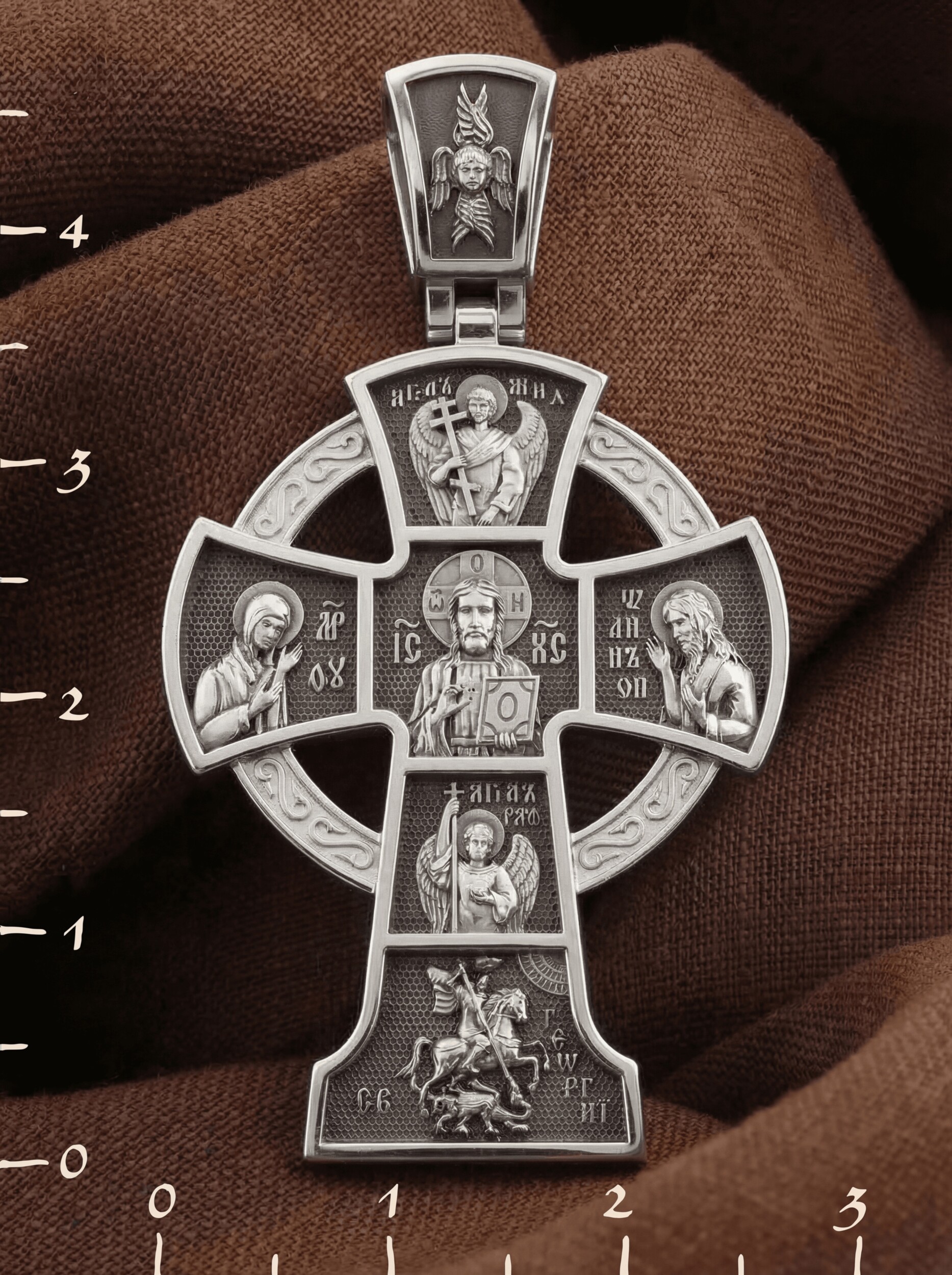 Вверху и внизу от спасителя предстоят два архангела, Михаил (Первый служитель Божественной славы, страж и защитник) и Гавриил (служитель Божественной крепости и изъявитель сокровенных Божьих тайн). Внизу помещен образ свт. Георгия Победоносца. Святой при жизни прославился не только как храбрый воин и твердый исповедник веры, но и как сострадательный, милосердный целитель и чудотворец. Святому молятся о покровительстве воинам и армии, о защите государства, сохранении и спасения России.