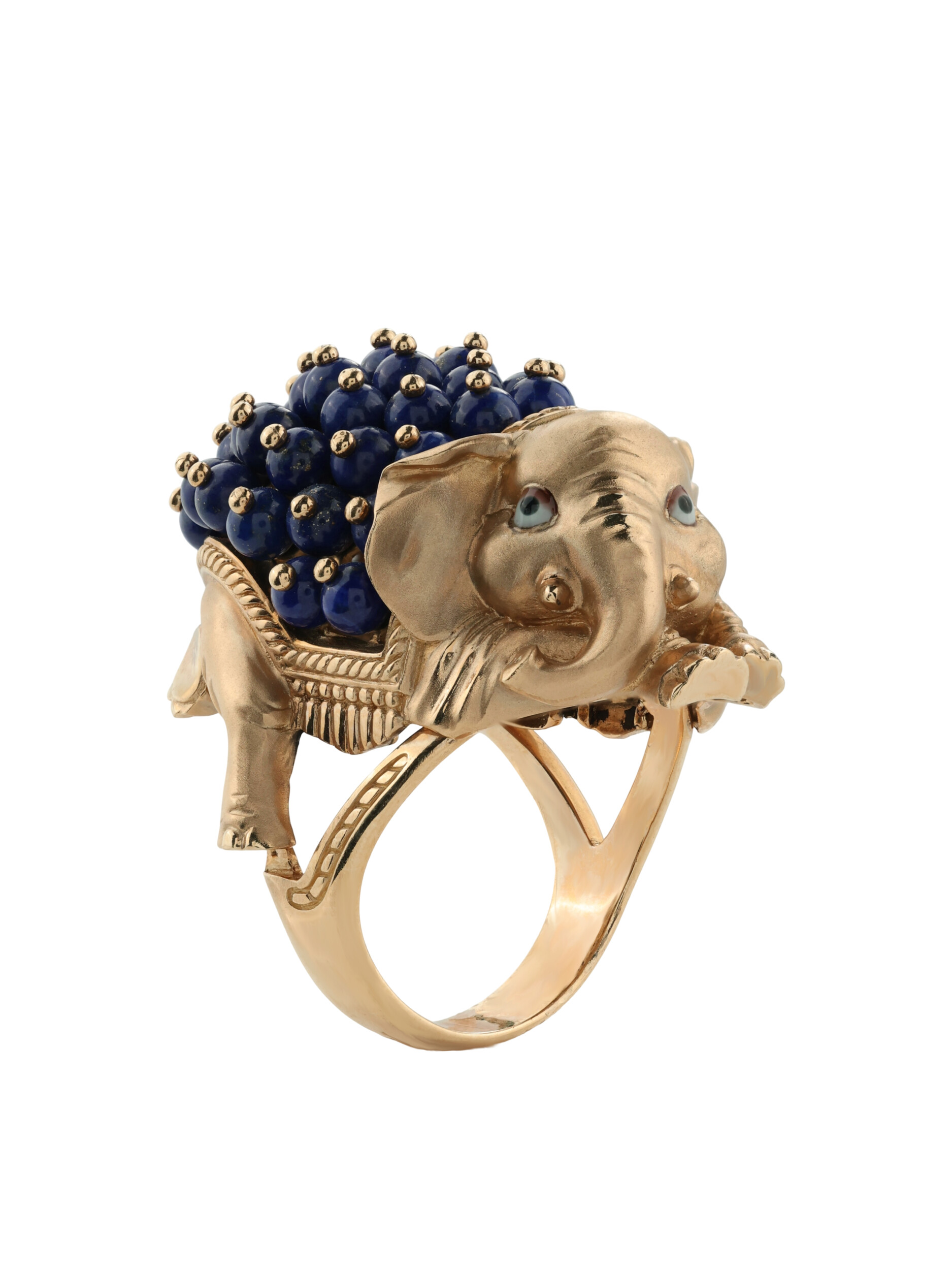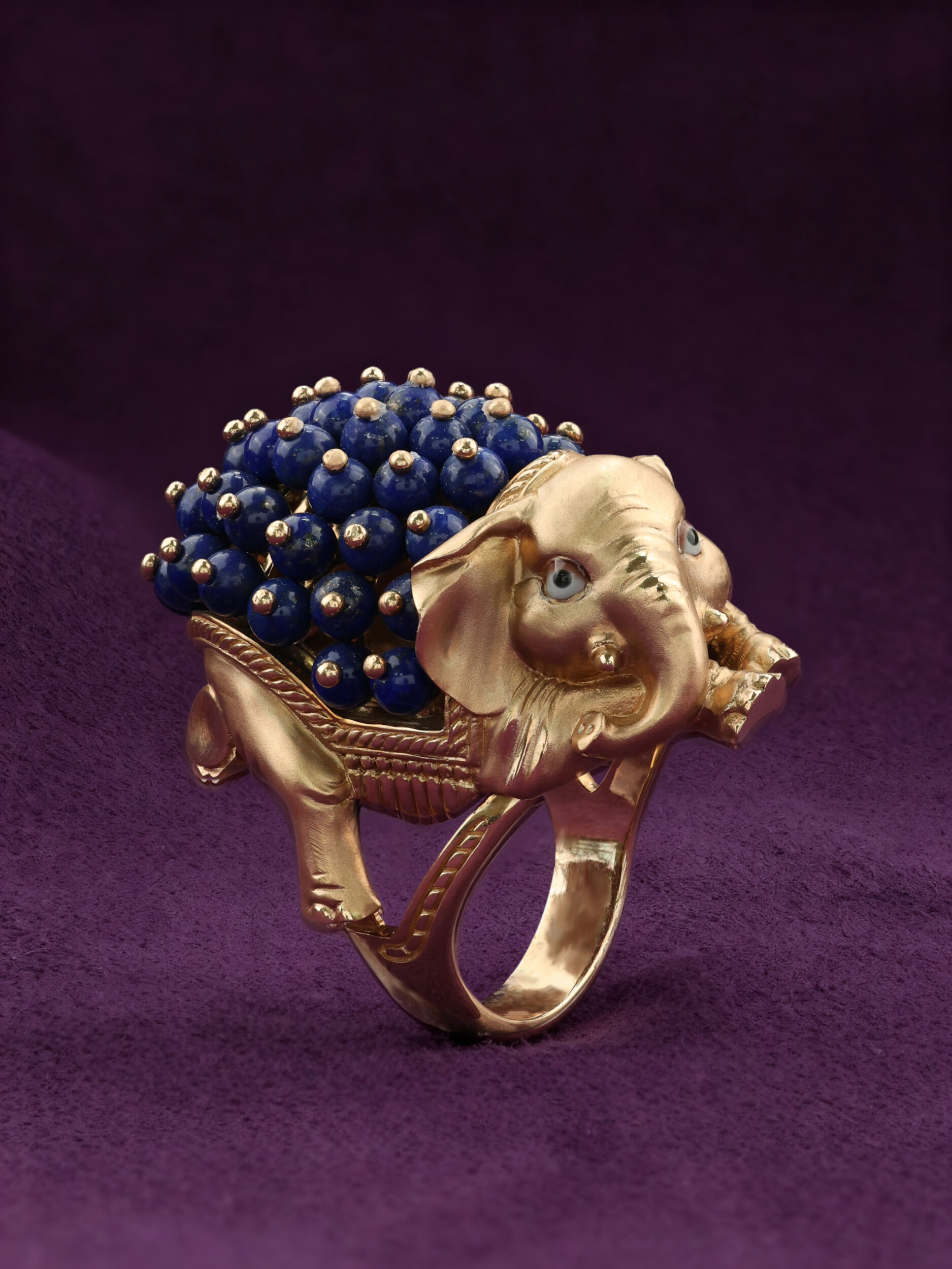 Представляем вашему вниманию уникальное кольцо из коллекции De luxe Premium — Слонята, которое станет главным акцентом любого образа. Это ювелирное изделие выполнено из красного золота 585 пробы и привлекает внимание своим необычным дизайном в виде слона. Мастера уделили особое внимание деталям, украсив спину животного россыпью из 46 вставок лазурита. Глубокий синий цвет натурального камня, имеющего форму аккуратных бусин, гармонично сочетается с теплым блеском металла. Выразительный взгляд слона подчеркнут с помощью ювелирной эмали, придающей изделию особую художественную ценность.