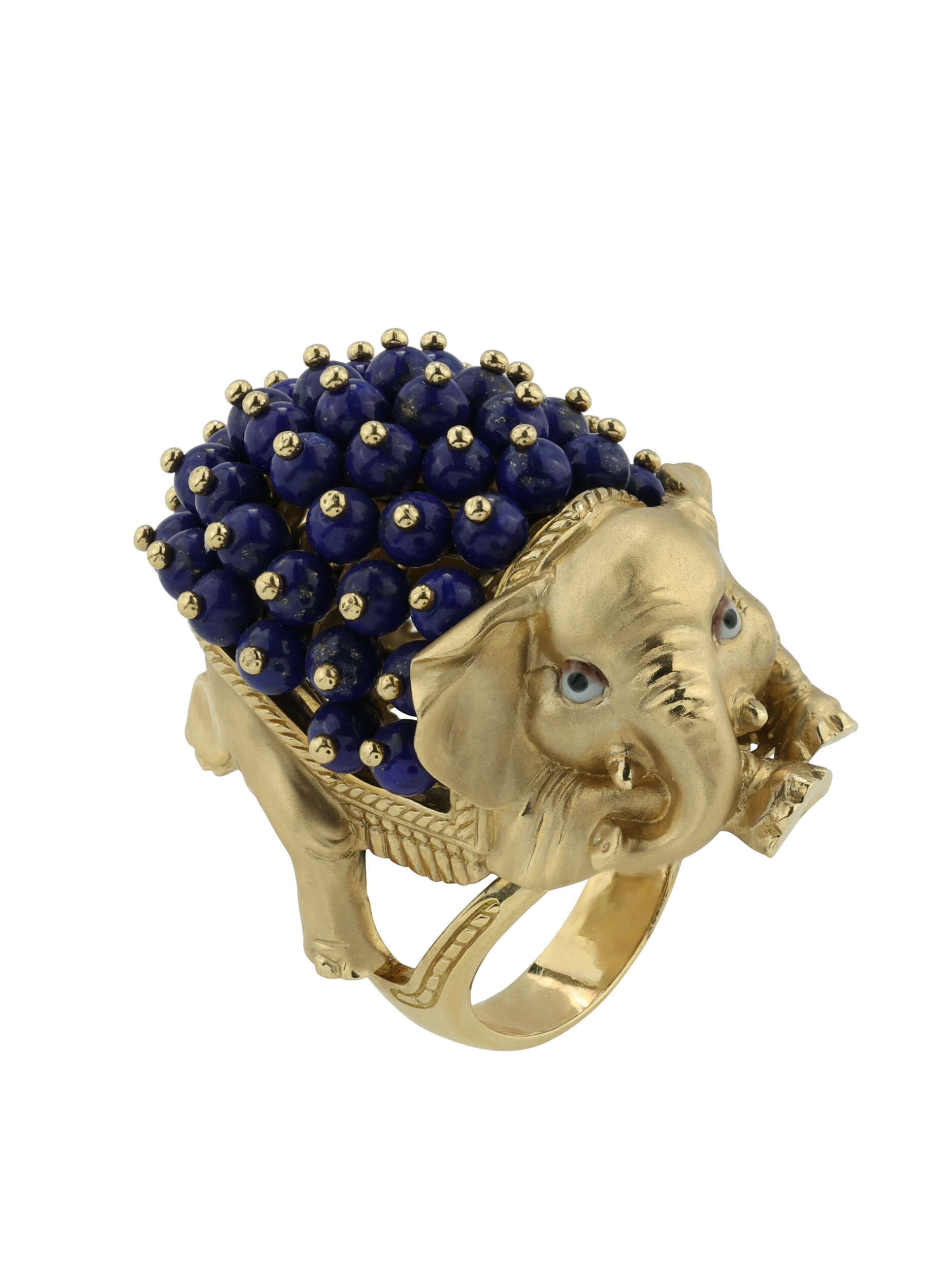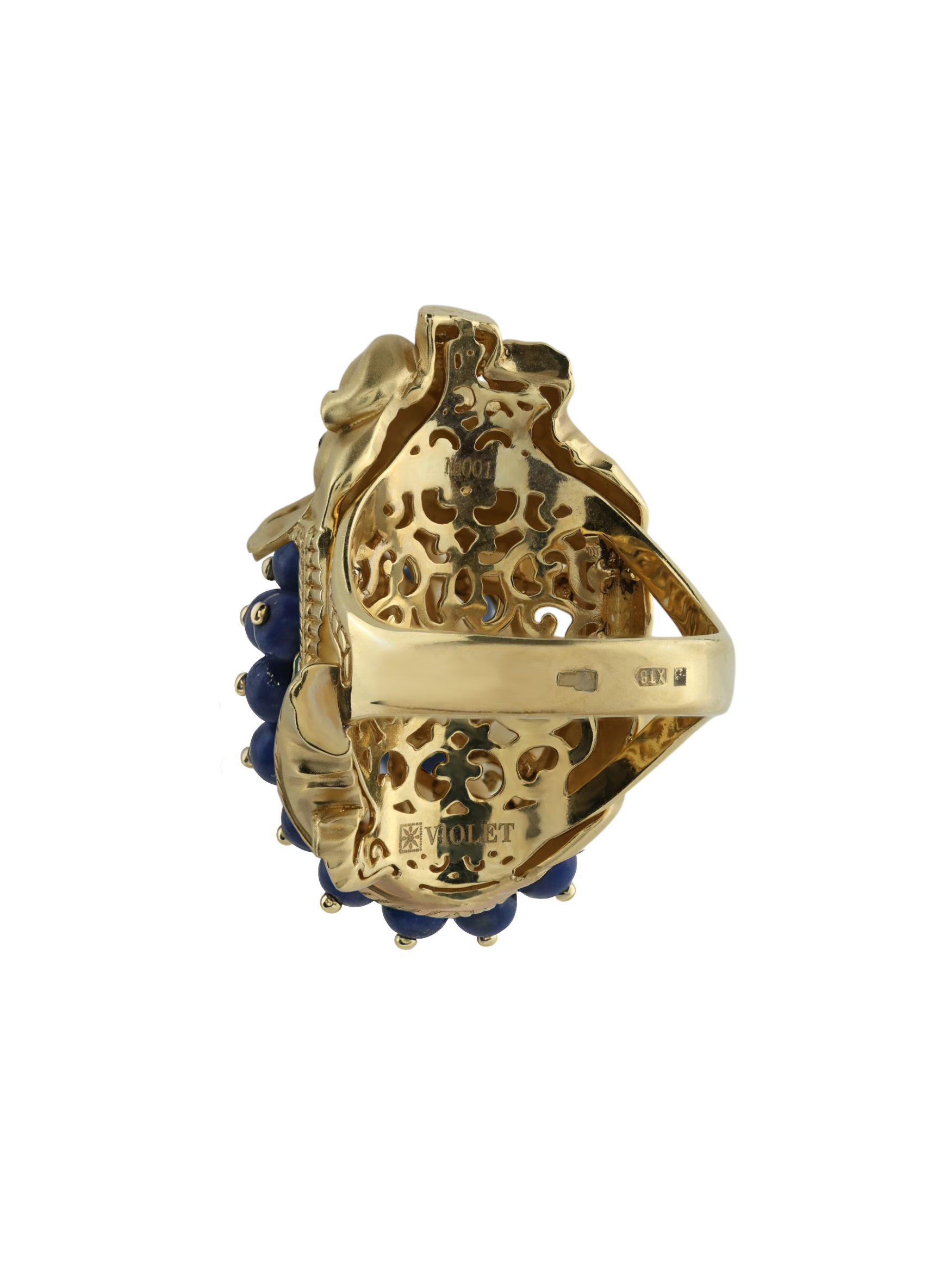 Декоративная часть изделия украшена 46 вставками из лазурита в форме аккуратных бусин, которые создают эффектный объем. Использование эмали в оформлении добавляет яркие акценты, подчеркивая статусность и оригинальность изделия. Такое кольцо станет заметным аксессуаром как для женщин, так и для мужчин, предпочитающих нестандартные и смелые решения в ювелирных украшениях.