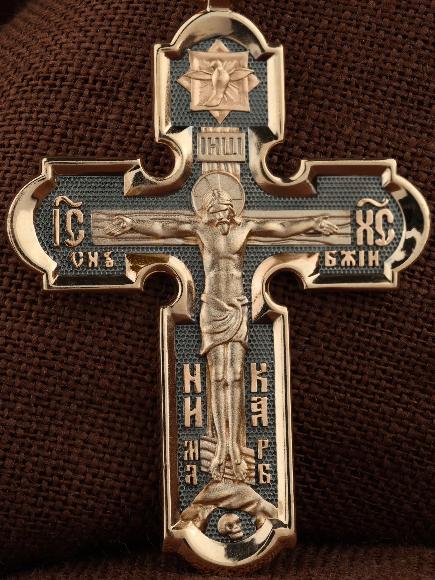 На лицевой стороне креста изображено Распятие Господа и Спасителя нашего Иисуса Христа. Христос, подвергнутый на кресте мучительной казни, своими страданиями искупил нас от древнего греха и даровал нам жизнь вечную. На верхней табличке, выше головы Иисуса, расположена надпись, составленная Понтием Пилатом — «IНЦI». Она означает «Иисус Назорей, Царь Иудейский». Надпись «IС» « ХС» означает Иисус Христос и словосочетание «СЫН БОЖИЙ», что означает божественную природу Иисуса Христа. В нижней части креста находятся надписи «НИКА» и «МЛРБ». В переводе с греческого, слово «НИКА» означает «победитель». Надпись «МЛРБ» — «место лобное рай бысть» — означает, что место лобное стало раем. Крест стоит на горе камней, символизирующих Голгофу. Под подножием Креста изображена покоящаяся голова (череп) Адама.